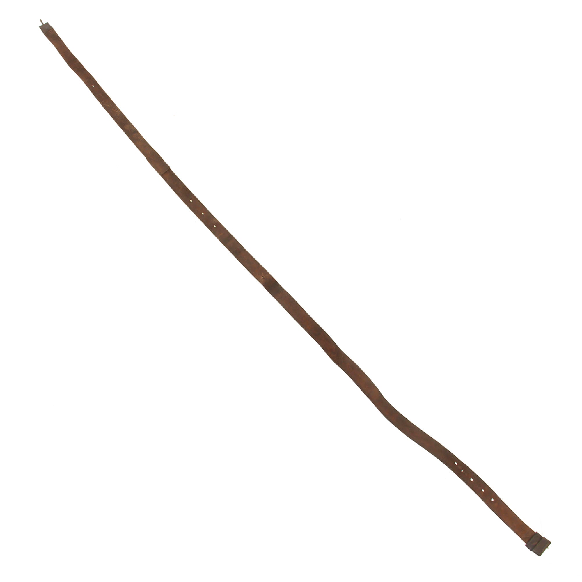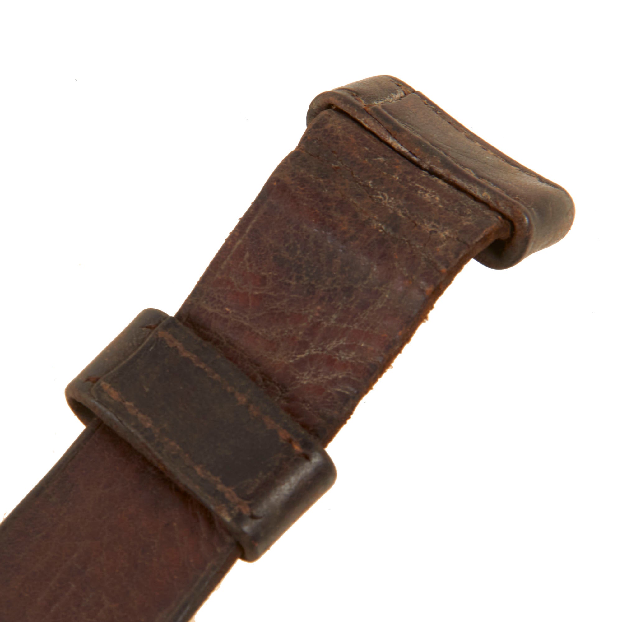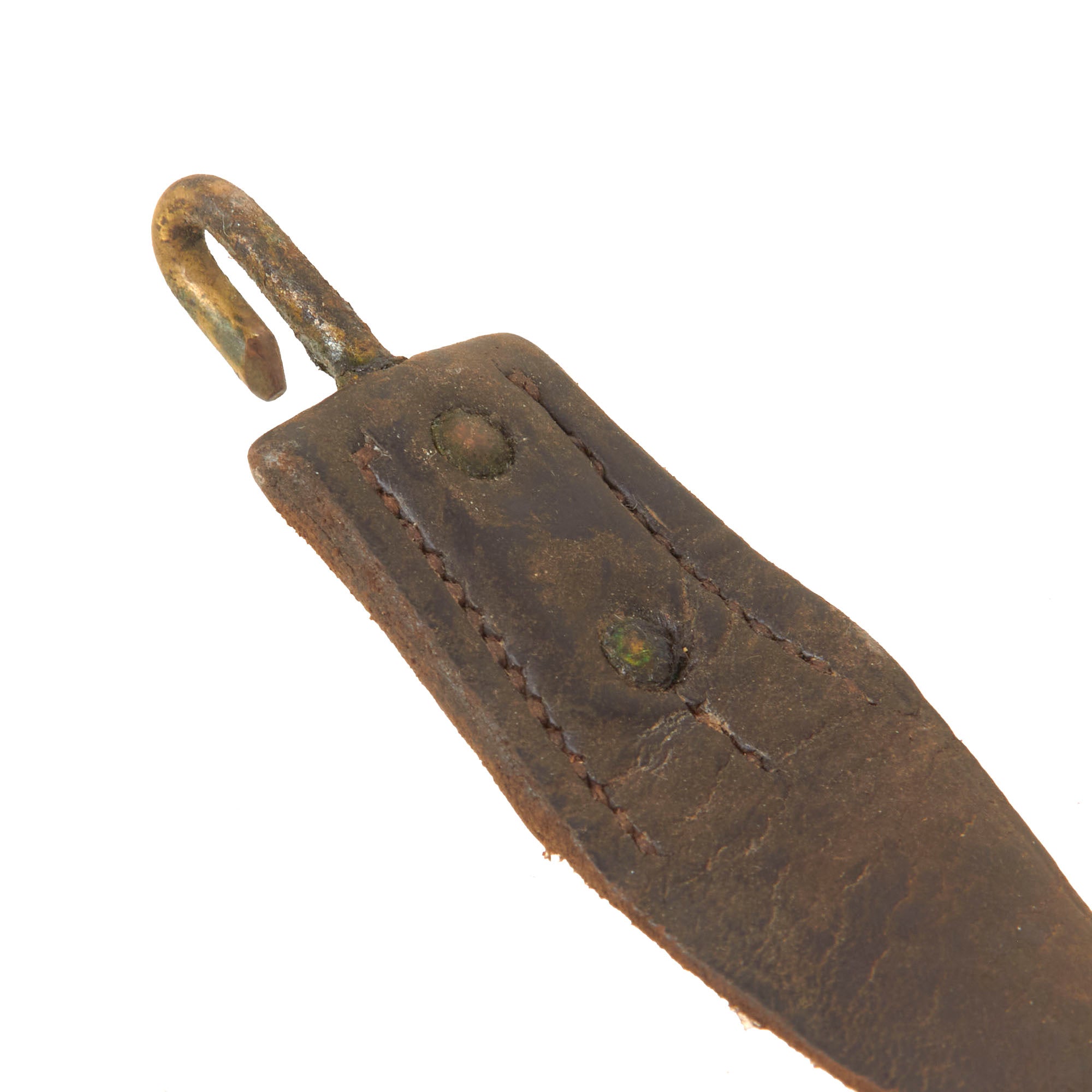 This is one of the original slings which were made from two Civil War slings sewn together, and the machine-stitching is still visible, although the stitching is very worn and weakened, with much already gone. There is some serious wear to the leather in places, but the keeper is still present, as is the fixed end keeper. The leather is wearing away and comes off onto the hands of the user. A great example which could be used on an Allin-Conversion or any Trapdoor Springfield. Ready for further research and display!