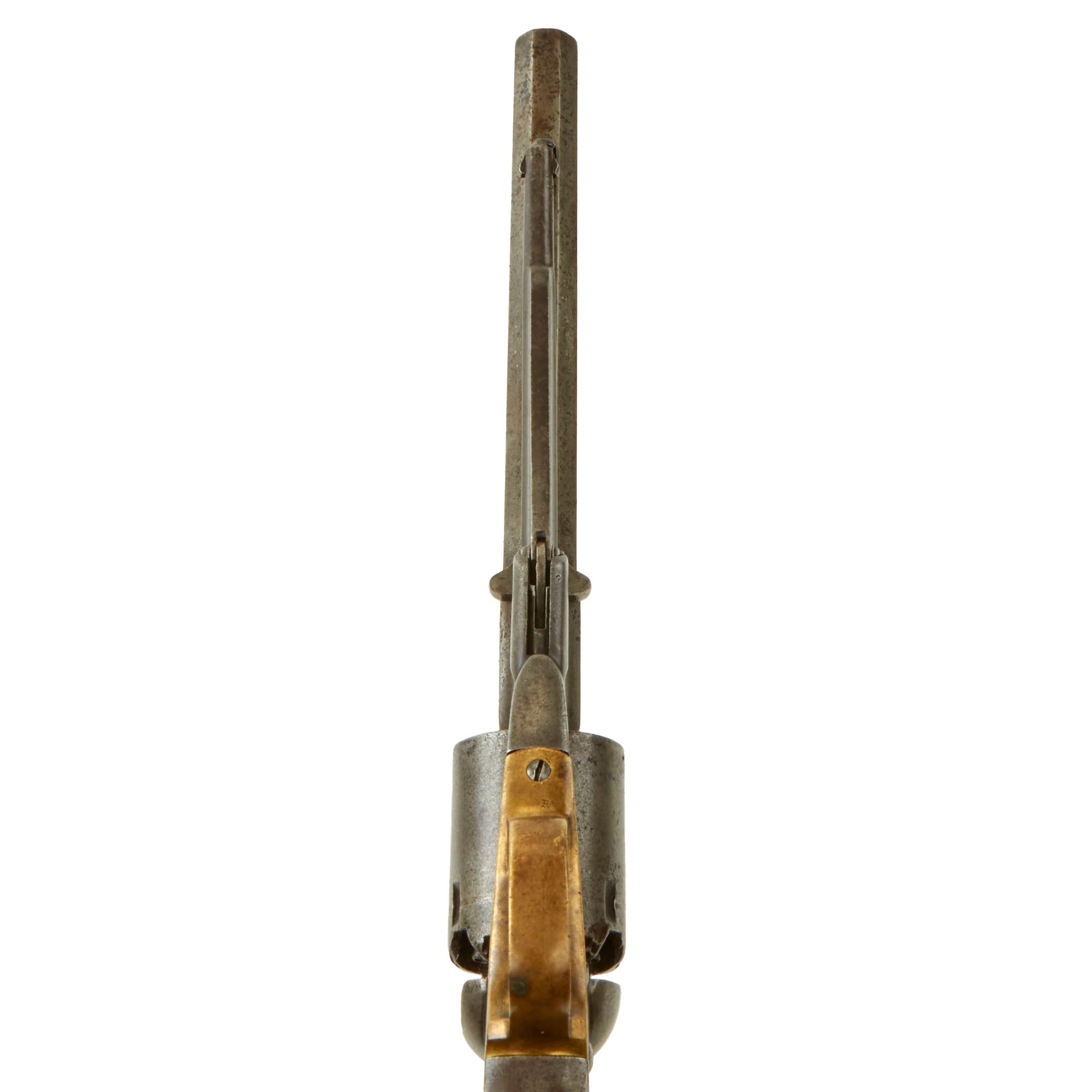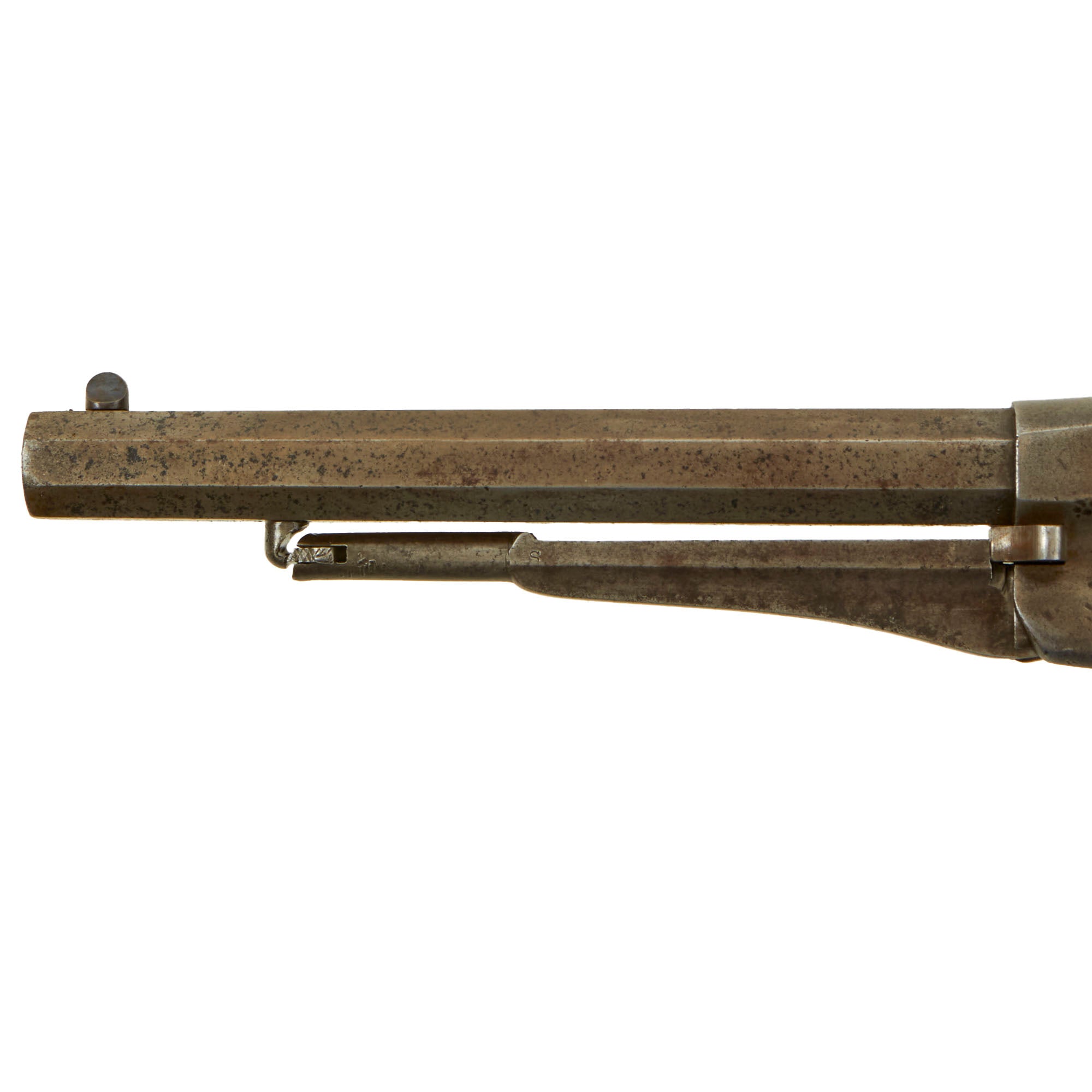 This 1863 Navy model revolver is in nice used condition showing a lovely worn patina, with some areas of past pitting. Original markings on the barrel are present, but definitely worn. The walnut grips are in very good condition, and look to have been refinished at some point. The ferrules are original, however the cross screw has been replaced, and a new nut is fitted inside the brass ferrule.