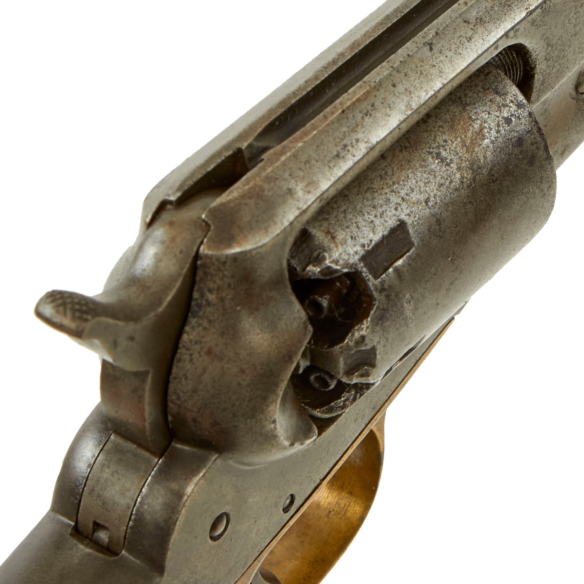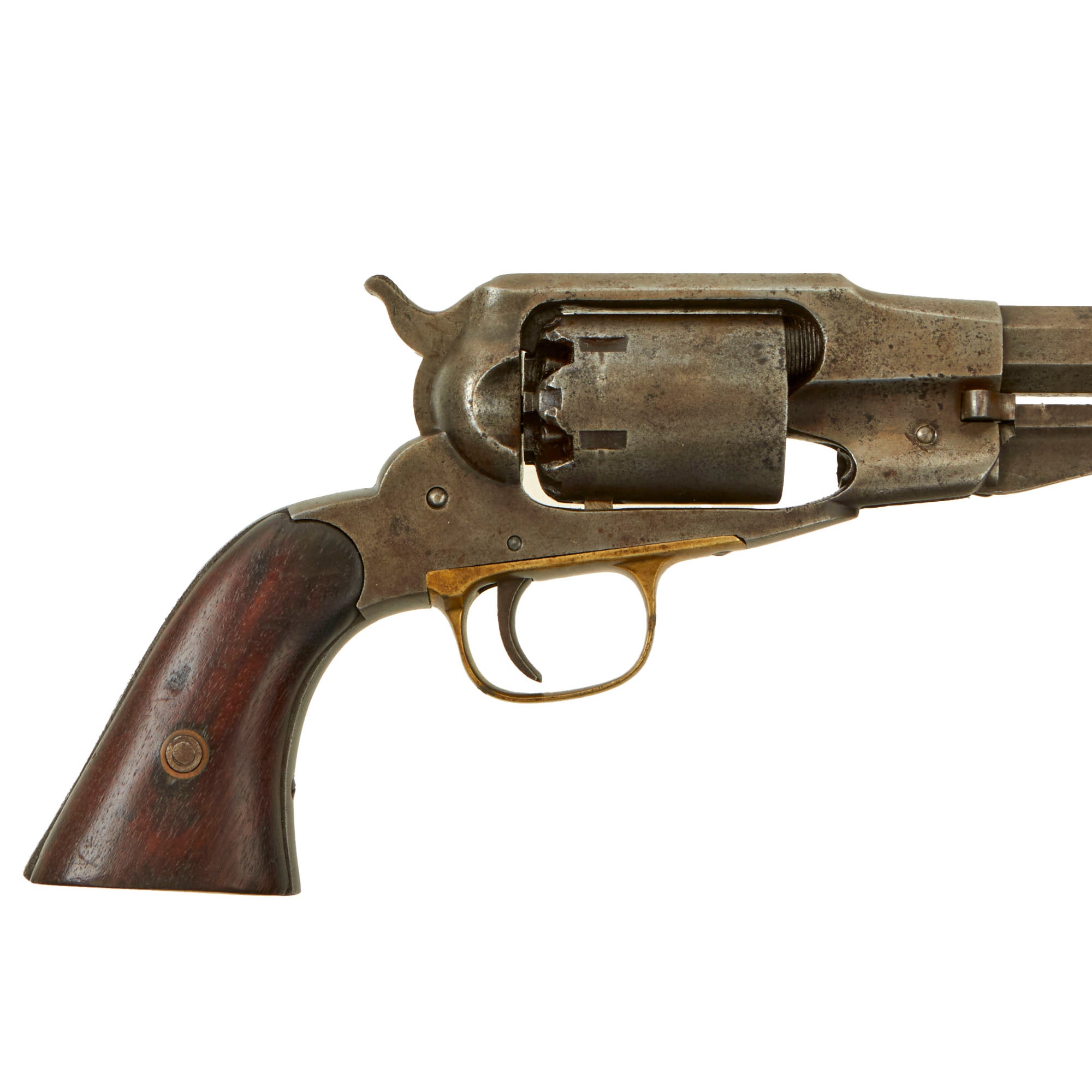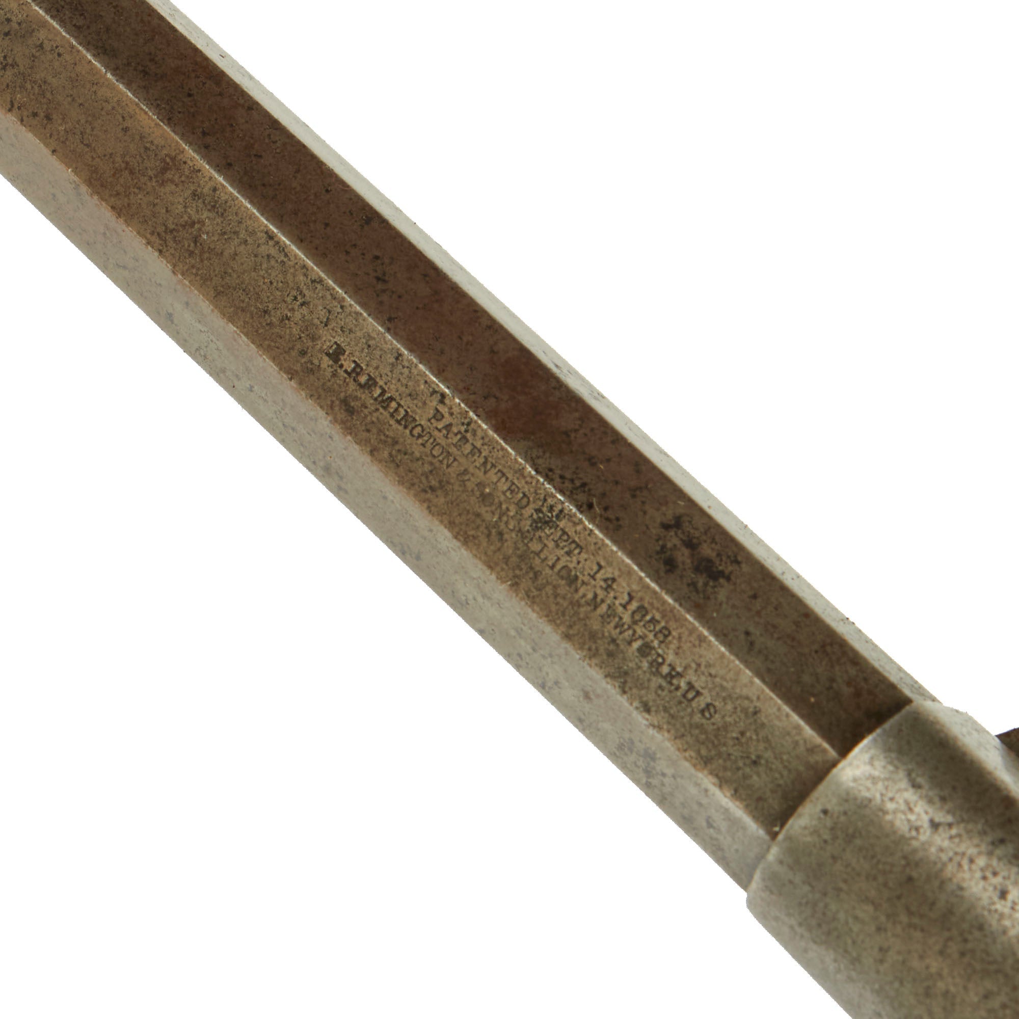 Original Item: Only One Available. This is a nice Remington New Model Navy Revolver in .36 caliber percussion, 6 shot single action revolver, with an 7 1/2-inch octagon barrel. It was produced some years after the Civil War, and most likely saw long use on the frontier during the "Indian Wars" era of U.S. History. These were often called the Model 1858 due to the patent dates, but production of this revision started in 1863, and the "New Model Navy" is the correct designation from Remington. The top of the octagonal barrel still has the original barrel markings, which partly illegible due to oxidation and wear: