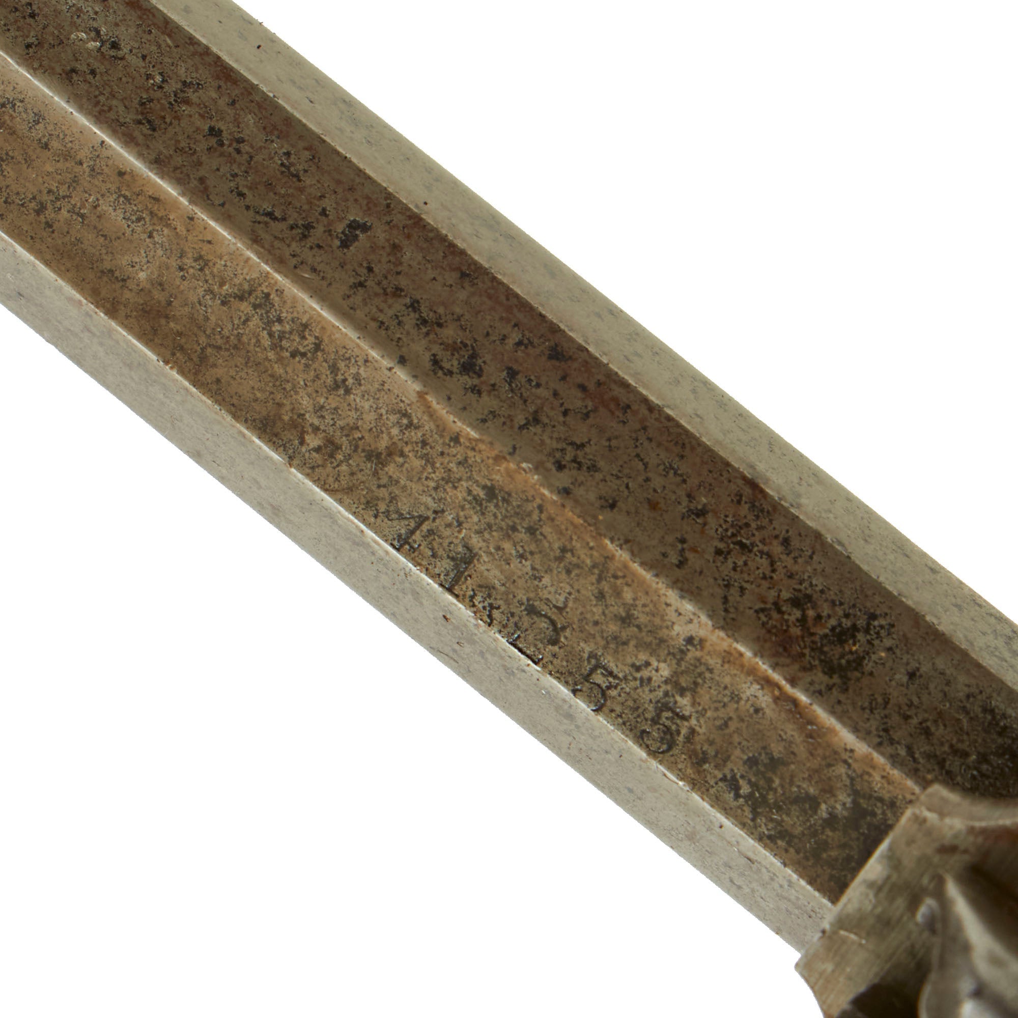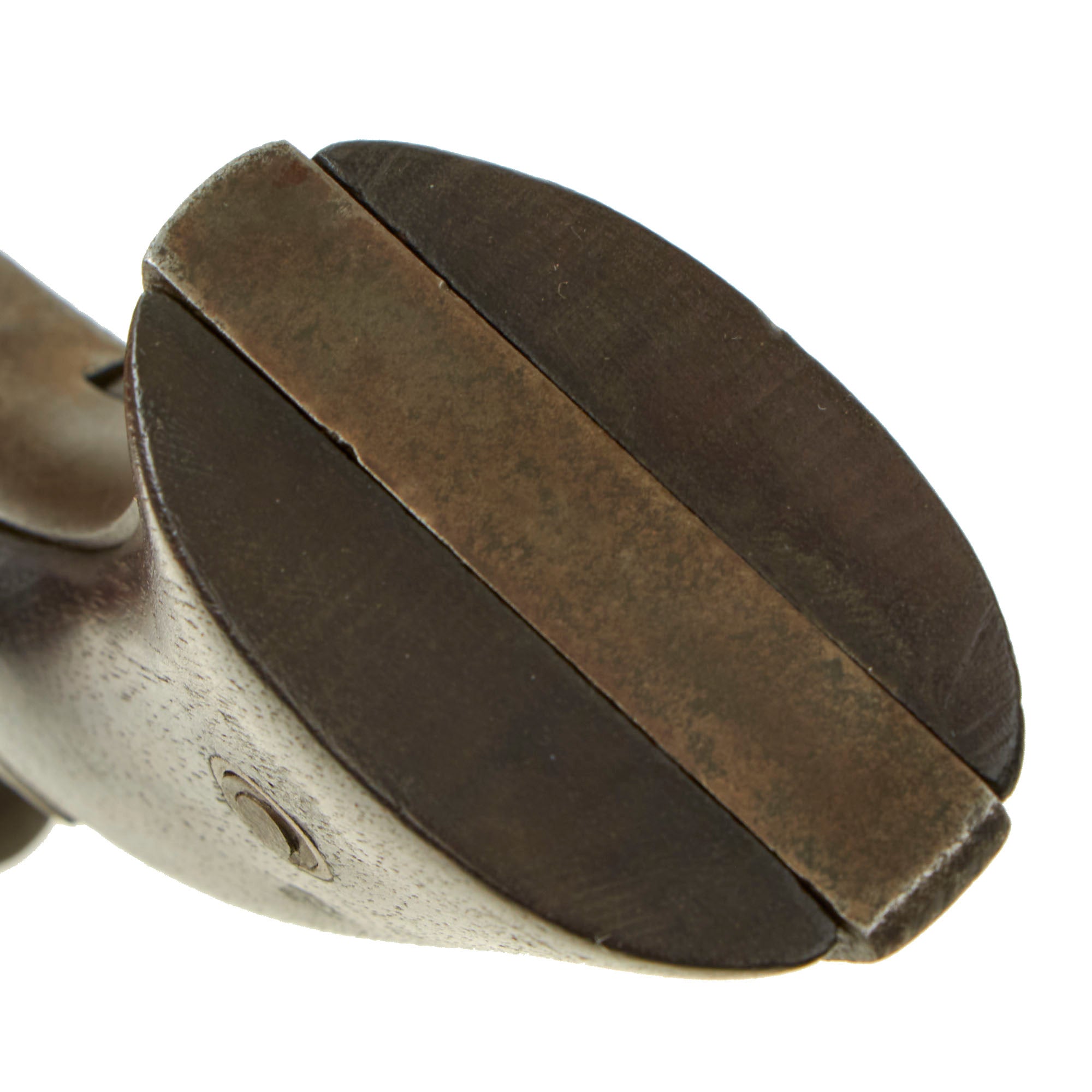 The loading lever still locks into place correctly, and the cylinder arbor pin pulls out relatively easily, though it does look to be a replacement and can take some effort to remove. The revolver has a strong smooth action, with a strong mainspring, accurate indexing, and good cylinder lockup. We did not notice any of the finicky behavior that we often see on revolvers of this age. We checked the bore, and it is in good condition, still showing rifling, but also a lot of past fouling and oxidation, which has made it mostly dark. The remains of the rifling are worn, and the grooves are also quite dark, so this revolver looks to have been used extensively on the frontier. We checked the cylinder, and all six cap nipple cones are intact and clear, showing wear and oxidation on the exterior from use.