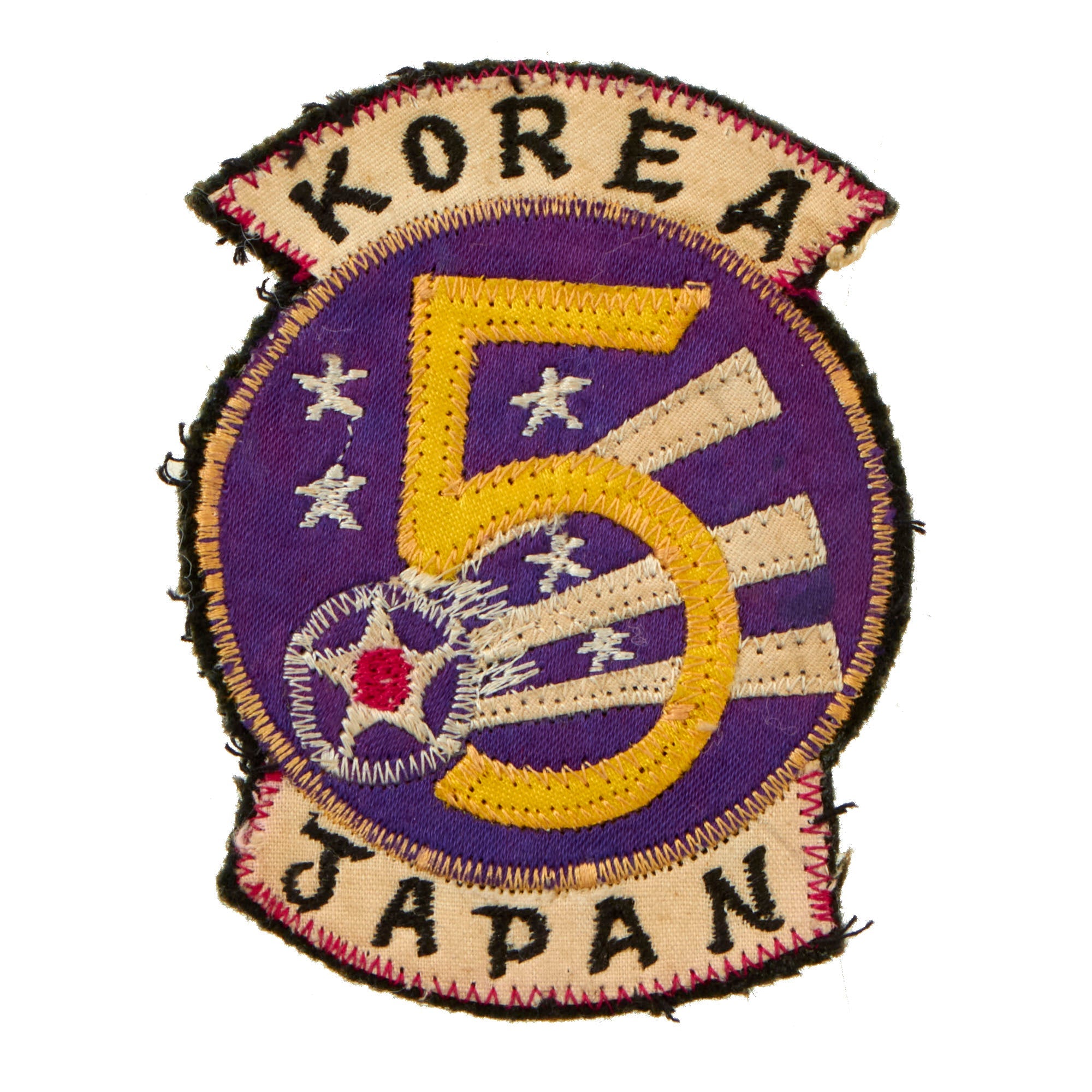 - 5th Air Force in Korea & Japan embroidered patch, 2½ x 3¼”. Great shape, rare with Japan rocker.
