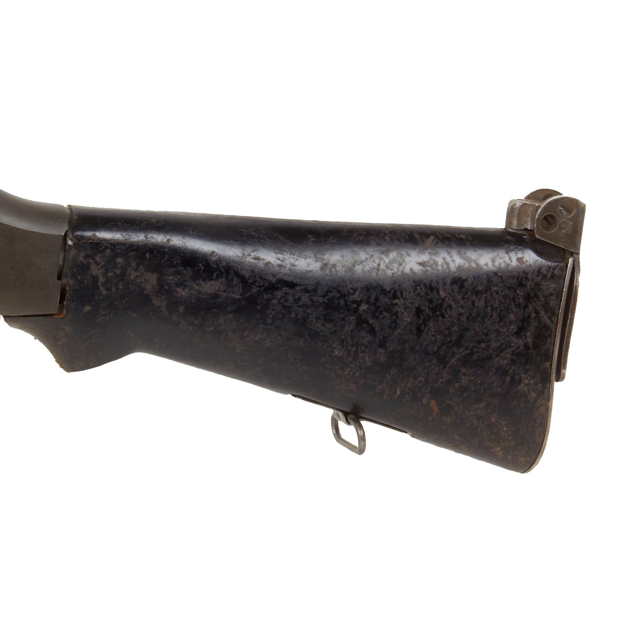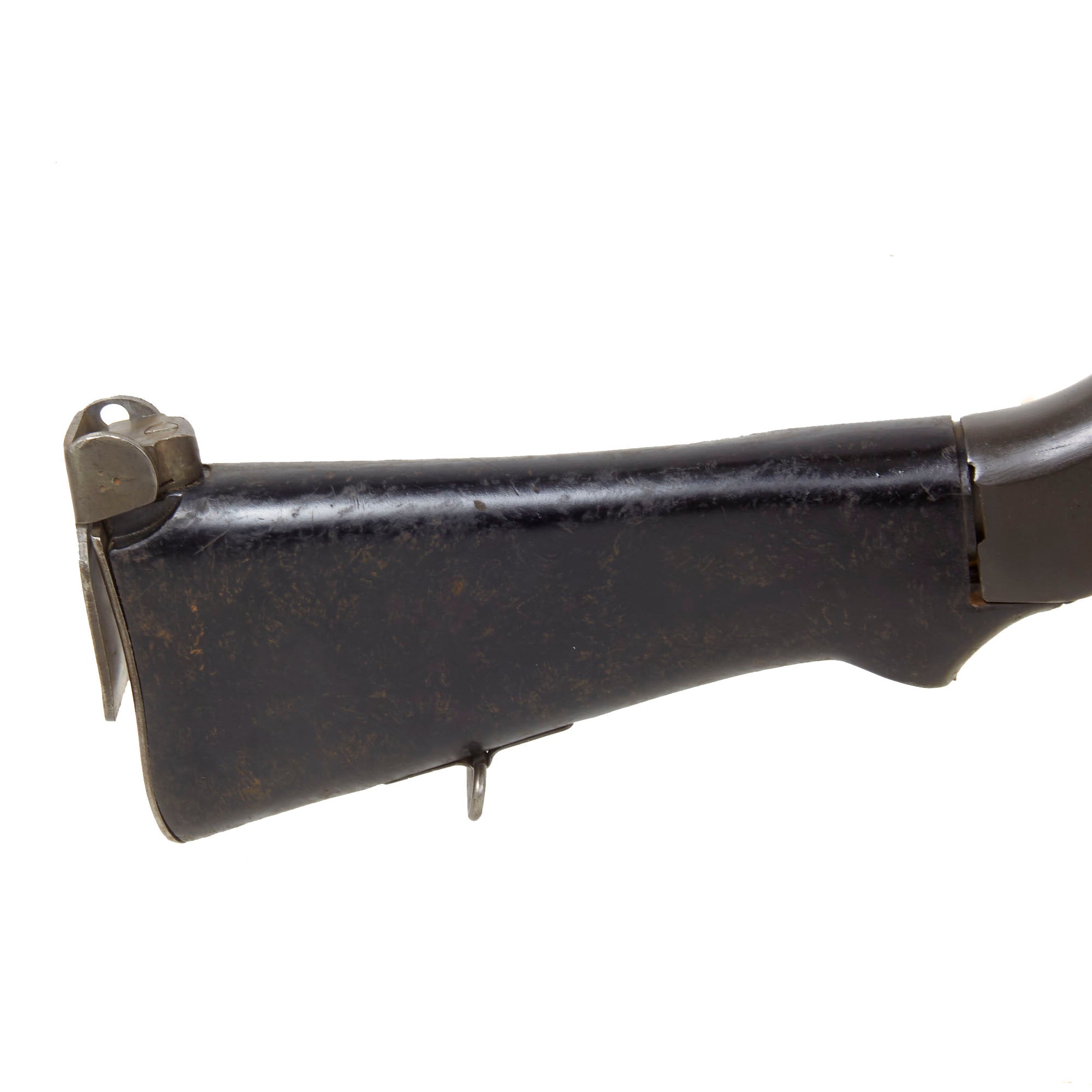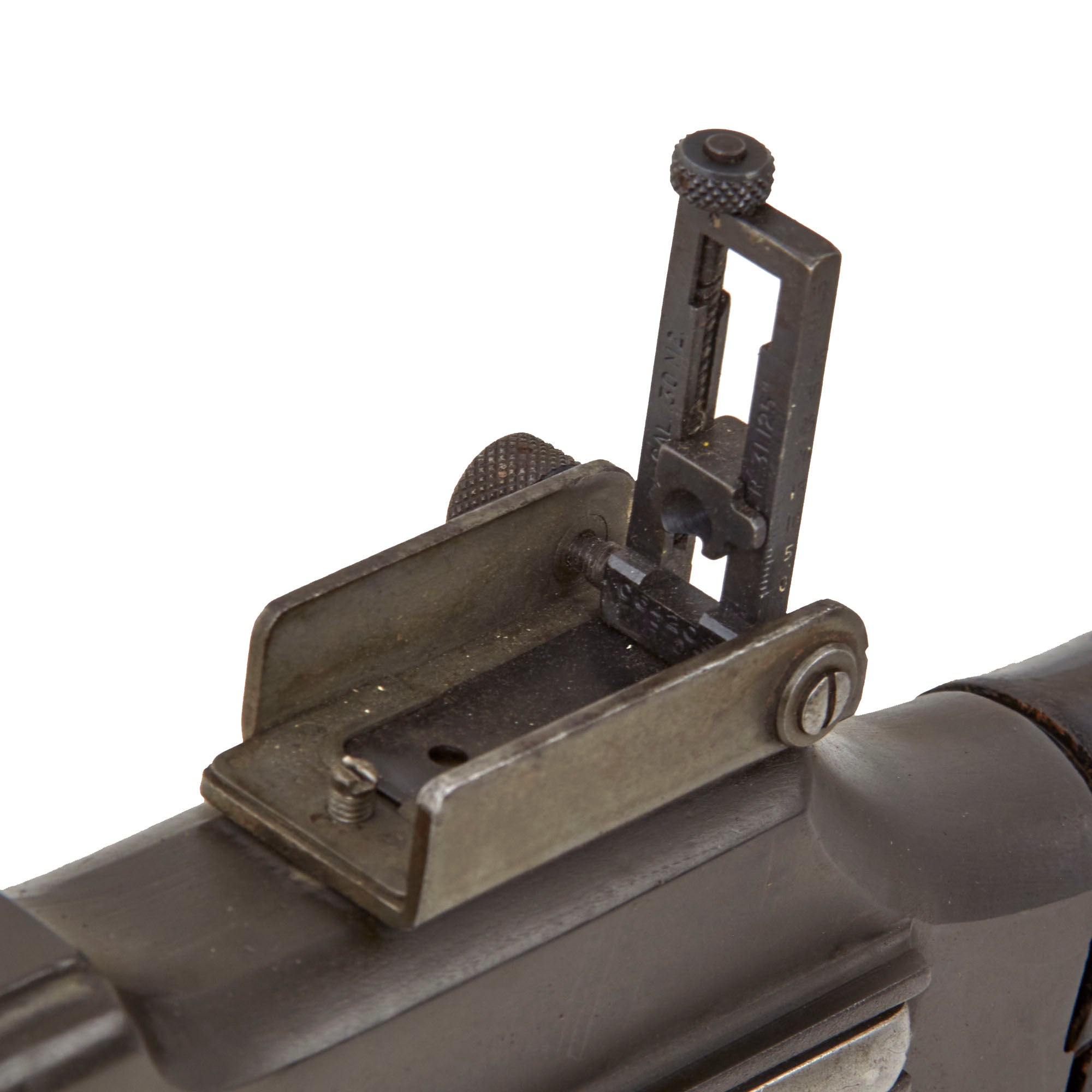This example is very nice, having the often missing carry handle attached around the barrel, though the heat shield is missing. The 2nd pattern bipod is correct and fully functional, and the tensioning washer is still present, which keeps it from swinging freely, though the washer is a bit worn. The front sight hood, very often missing, is still present, as are both sling swivels and flip up "shoulder rest" on the butt stock, all of which are fully functional. The wooden fore stock is quite nice and has a lovely dark red brown color, and the bakelite butt stock has a lovely color with very little damage. All of this makes this one of the most attractive examples that we have offered.