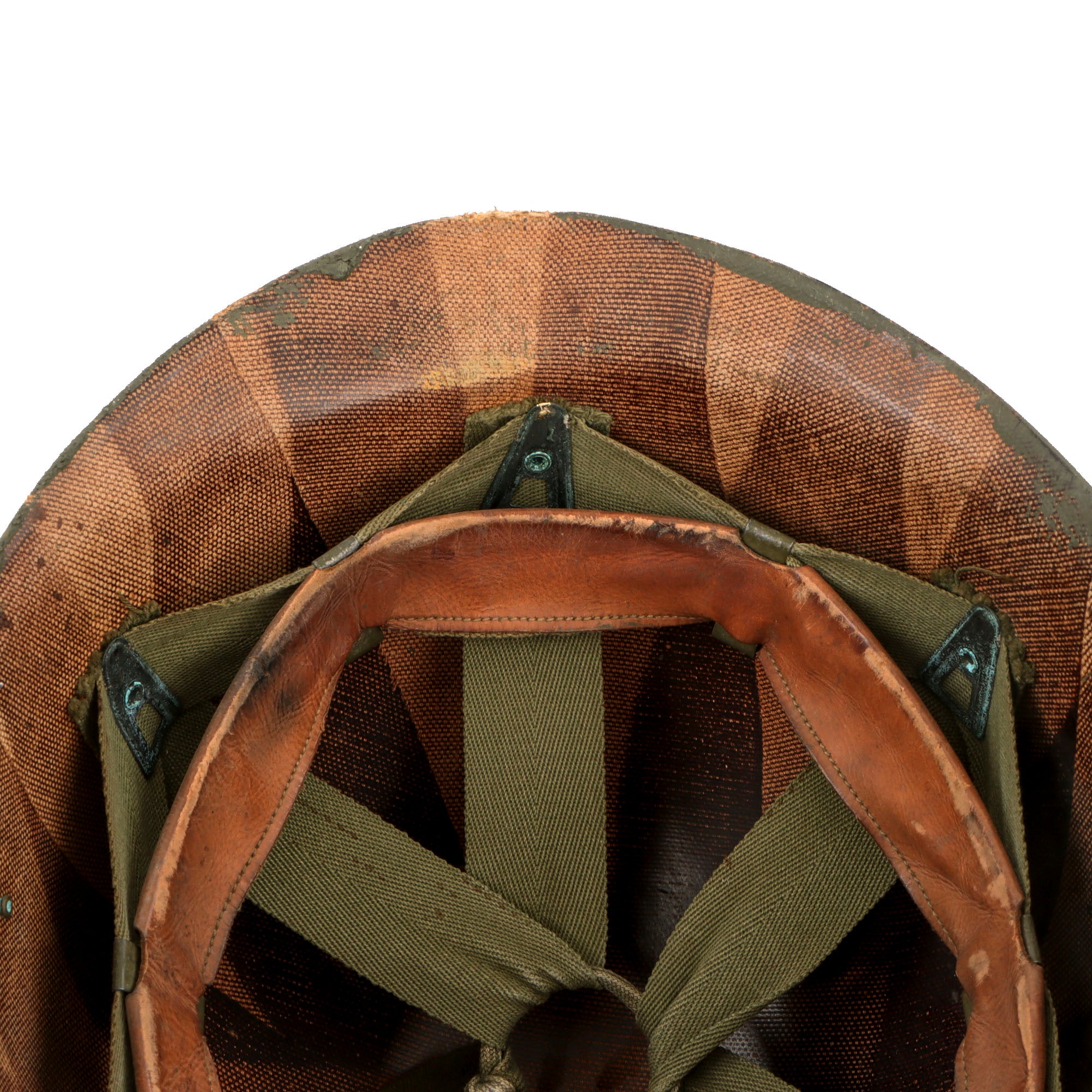 The helmet is fitted with a Korean War era CAPAC Westinghouse liner with dark green suspension and an intact sweatband. It is also painted to the front with the 29th ID Insignia. Like most helmets used in the production, a variety of shells and liners were used. Liners used were a wide variety, ranging from original WWII production, Vietnam era, 1980s, foreign clones, etc. The helmet shell retains a Korean War era chinstrap.