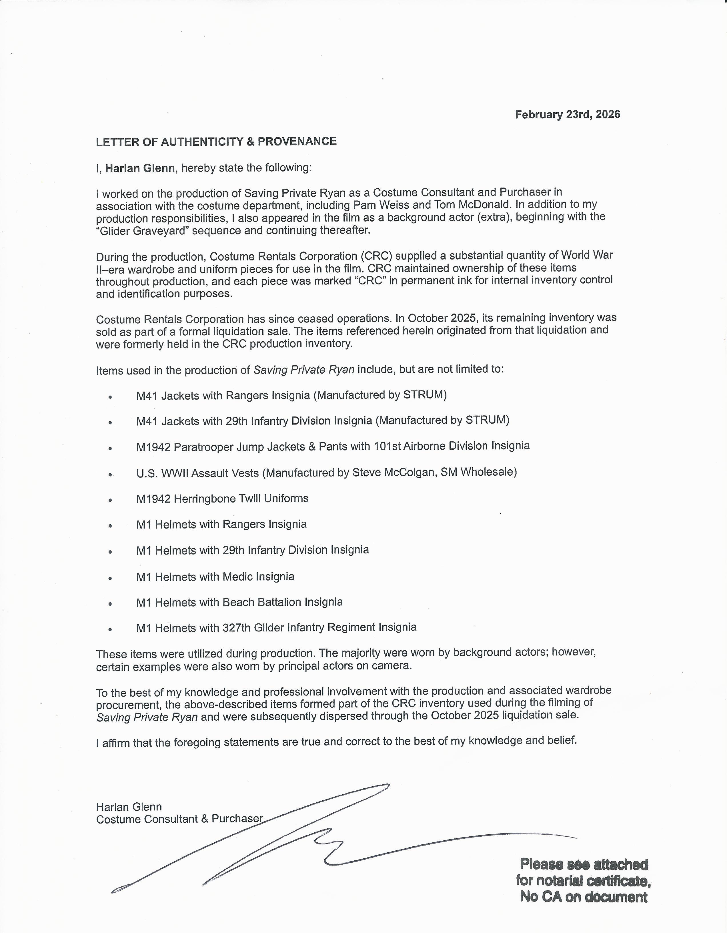 This helmet comes with a printed copy of a notarized letter confirming that the helmet and other material came from CRC, the Costume Rentals Corporation, who supplied a substantial amount of World War II-era wardrobe and uniform pieces for use in the film. The letter confirms that these materials were indeed used in the Production of SPR. The letter was signed by Harlan Glenn, who worked on the production of "Saving Private Ryan" as Costume Consultant and Purchaser.