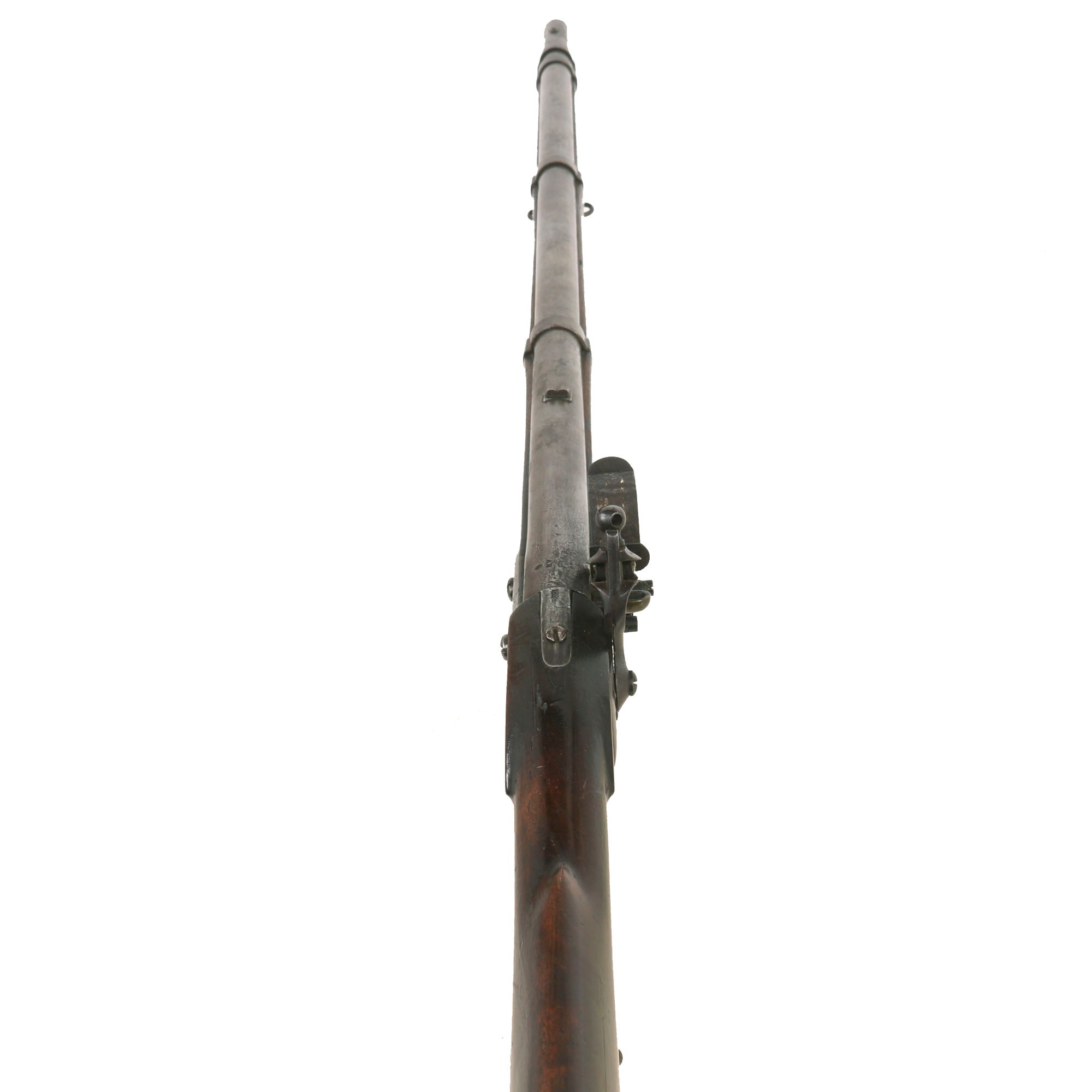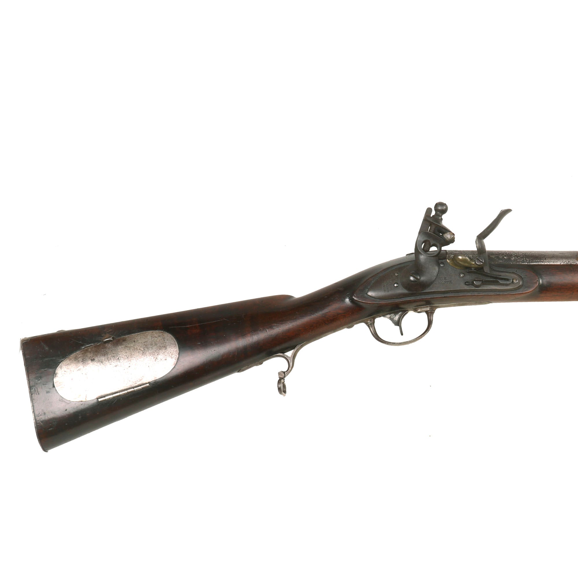 This is a very nice and interesting example of a Model 1817 Common Rifle by Simeon North of Middletown, Connecticut. This example was not converted to percussion and is still in its original flintlock configuration, with the majority of these being converted for use during the Civil War. It definitely shows much wear from service use, with the original browned finish now worn away, and most of the metalwork bearing a polished steel patina with some staining and past peppering. The lock is a bit worn, but still has the correct address marking:-