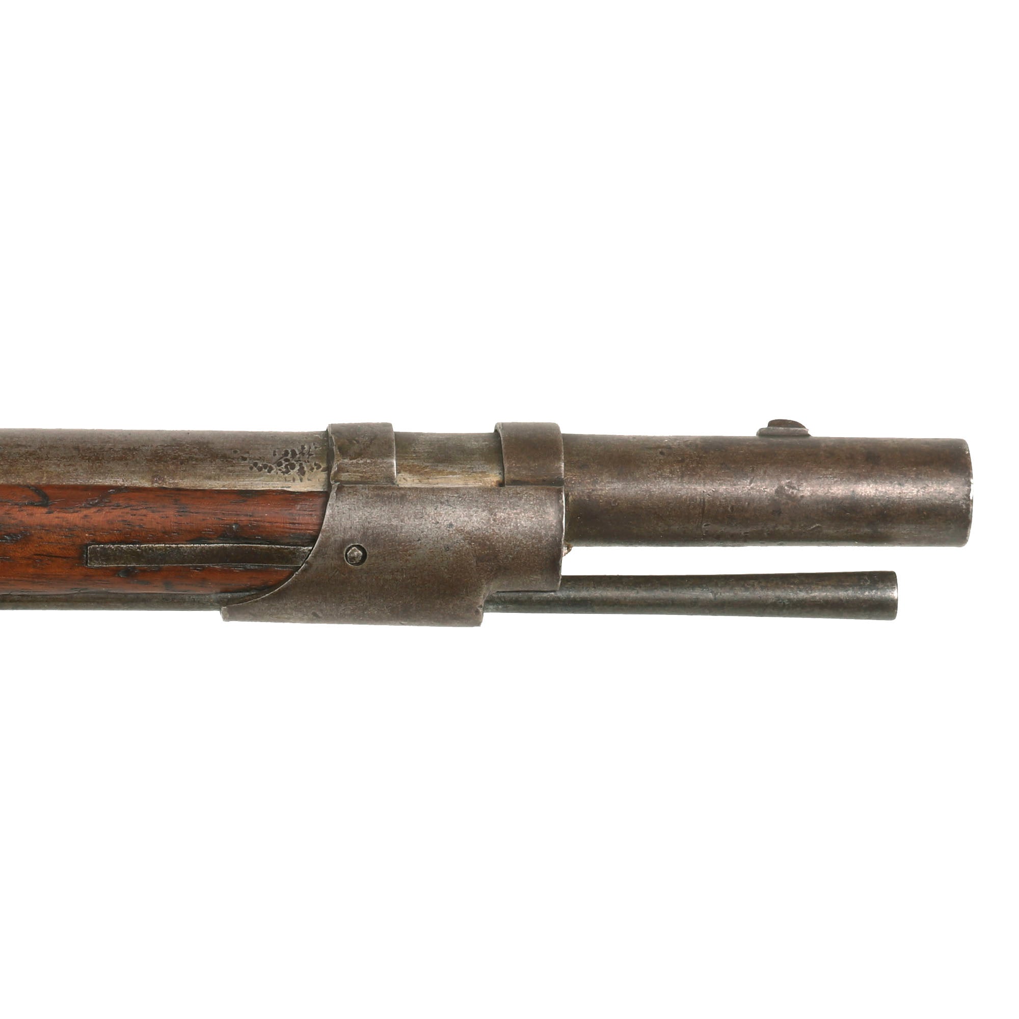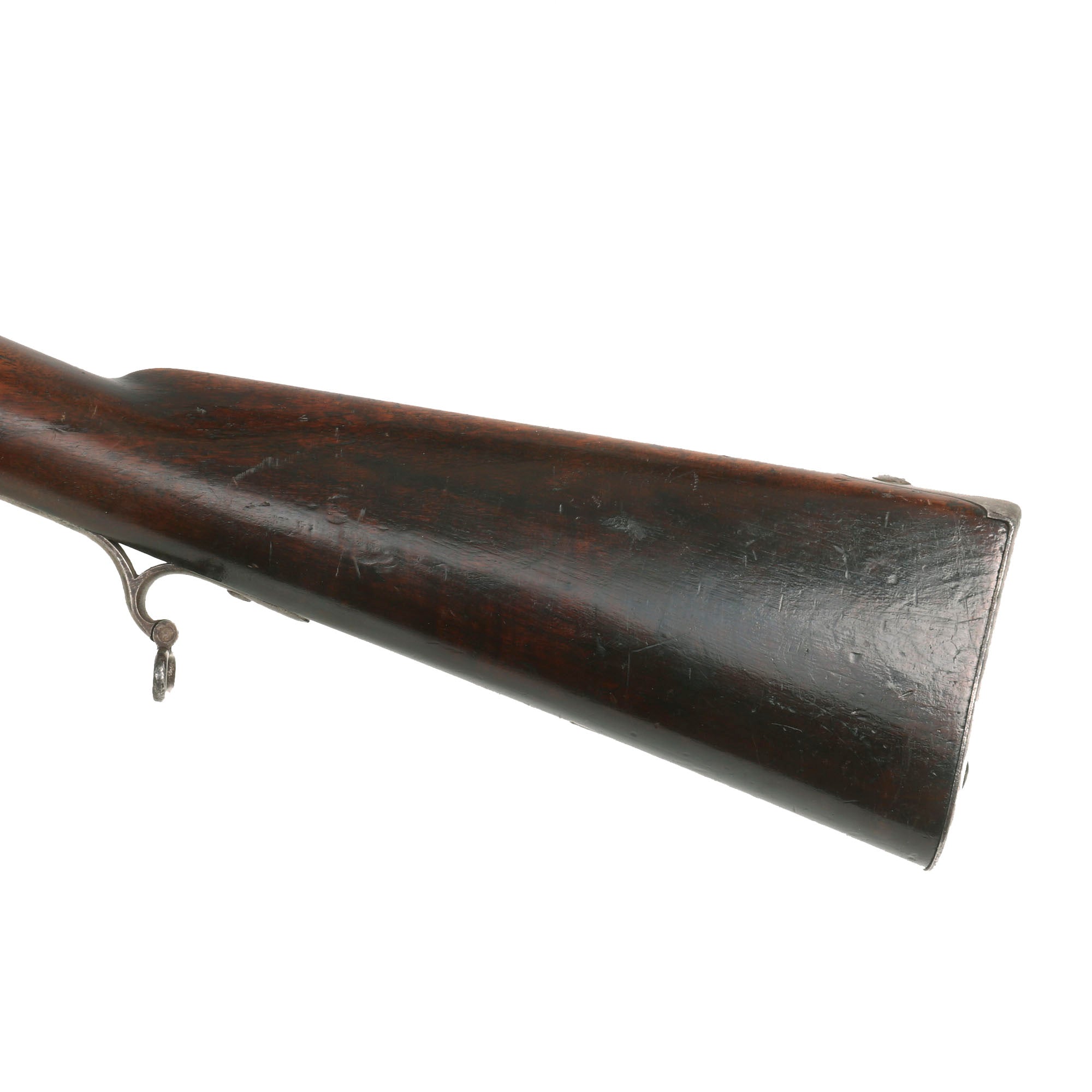 Condition wise, it really has a great aged look to it, with the metalwork really looking great, with no signs of having been refinished, just signs of powder burn and cleaning over the years. The lock mainspring is still present, and the hammer moves and snaps forward, and it still holds well at half and full cock. Both sling swivels are still present, as well as the cleaning rod, with both the rear and front sight still fully intact.