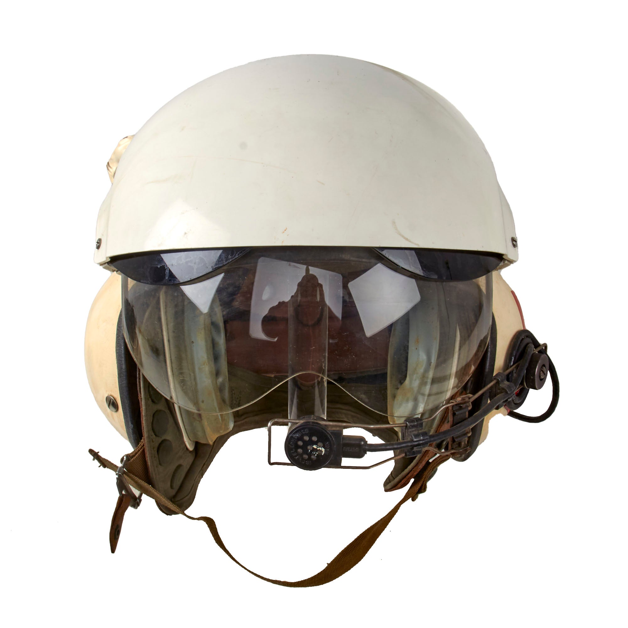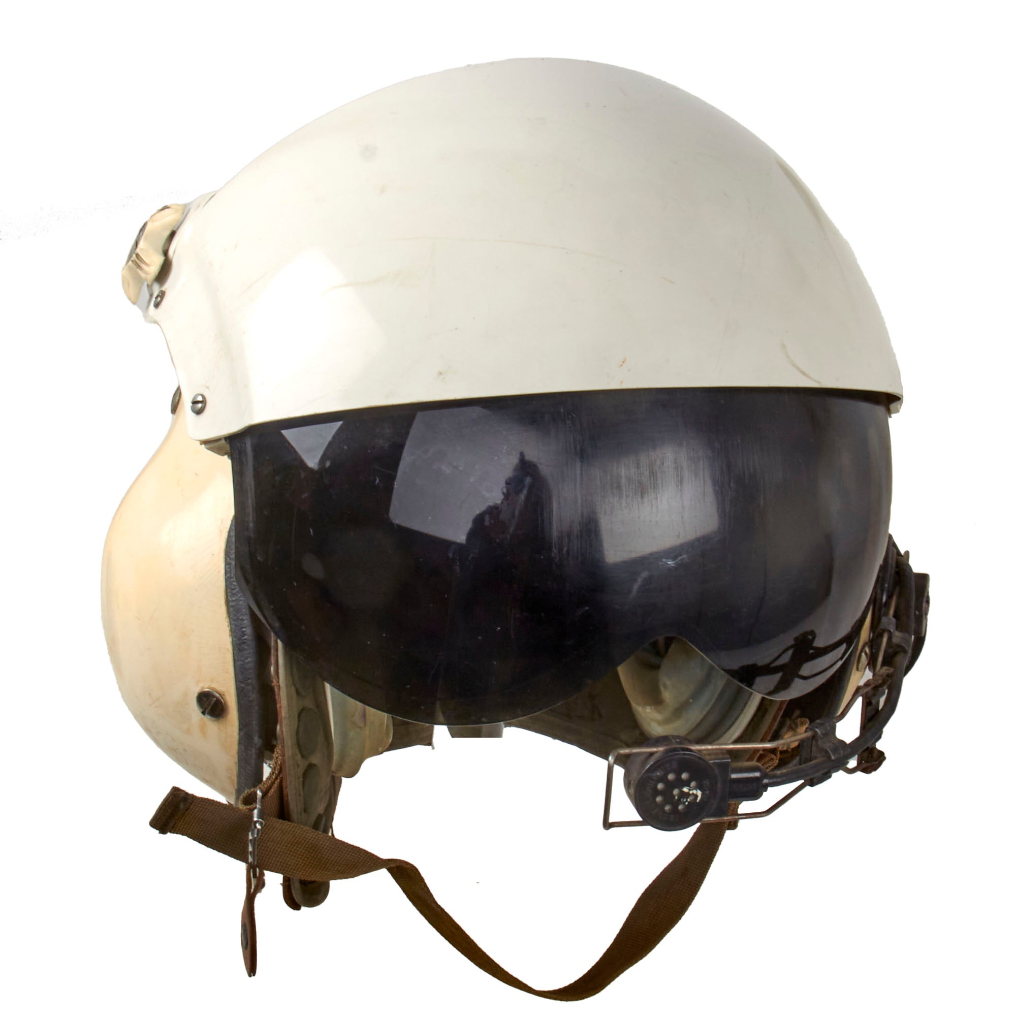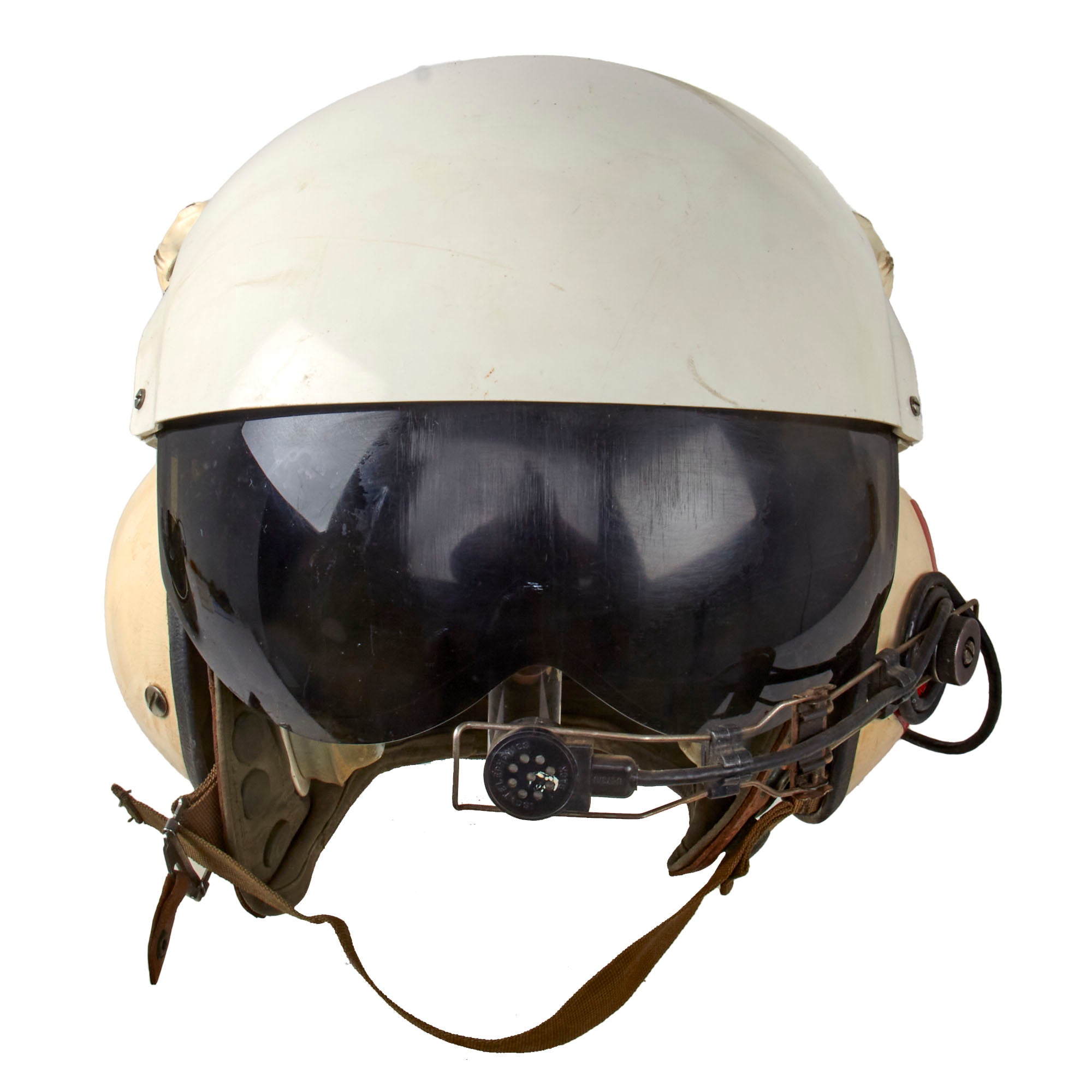 Original Item: Only One Available. This is a United States Navy Helicopter Flight Helmet type SPH-4 likely made by Gentex, but there is no tag we can find on the interior. We believe this helmet is from the 1980s, or was possibly refurbished for use then, and it features rare early Rams Horn dual visors (one tint and one clear). Later examples with dual visors did not have the "horns" behind the visor assembly.
