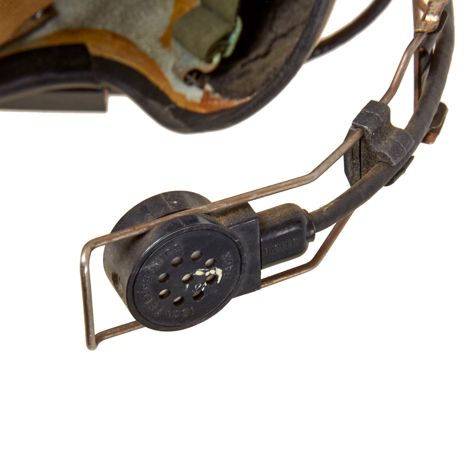 The helmet is in overall very good condition with the liner, headset, microphone, and both tinted and clear visors. The helmet has white and orange decaling on the back. The helmet still has both earphones intact, as well as the connection plug from the rear, and there is also a cord attached to the microphone. The chinstrap and liner appear to be intact, but the liner is very worn and the material is coming out of it as often happens with flight helmets from this period.