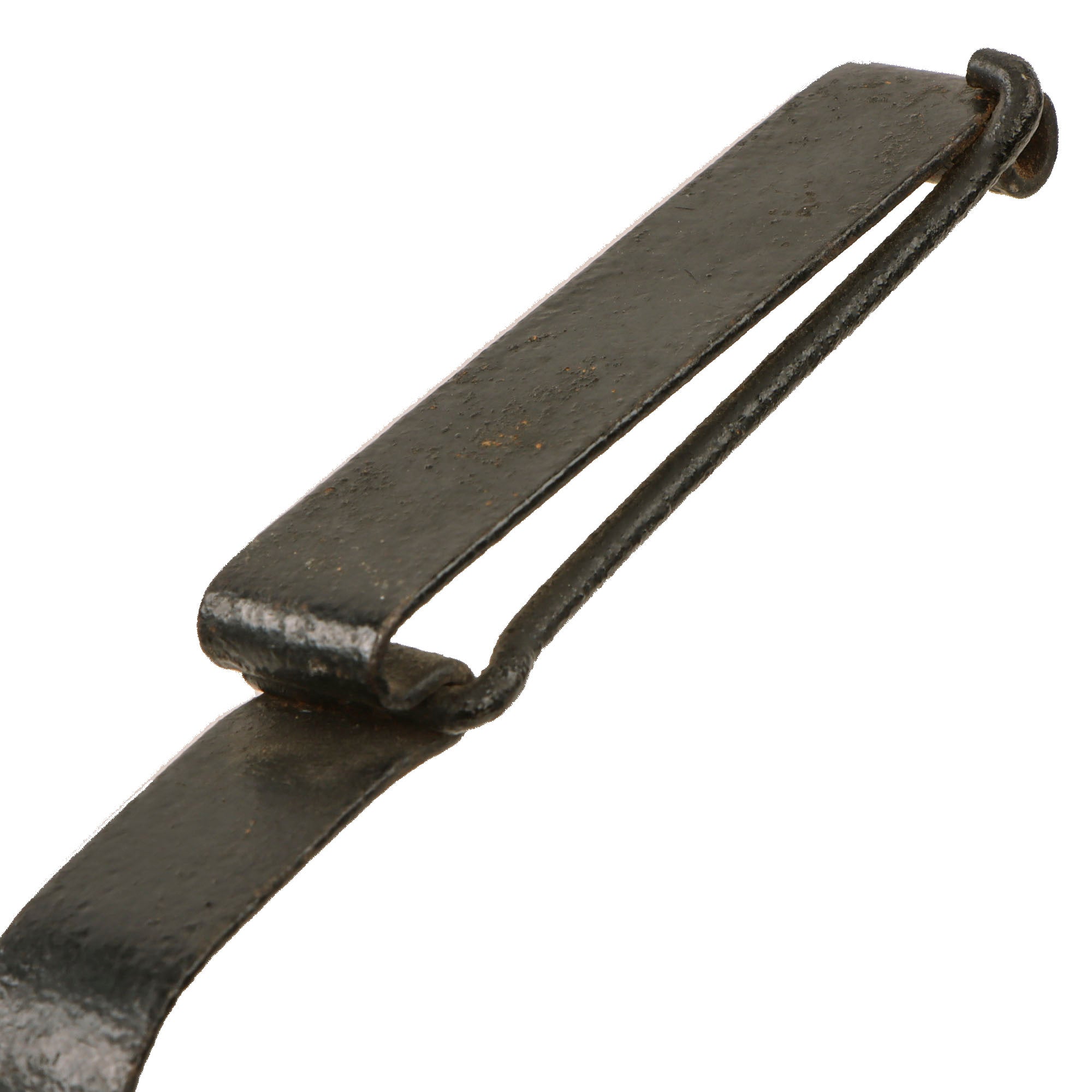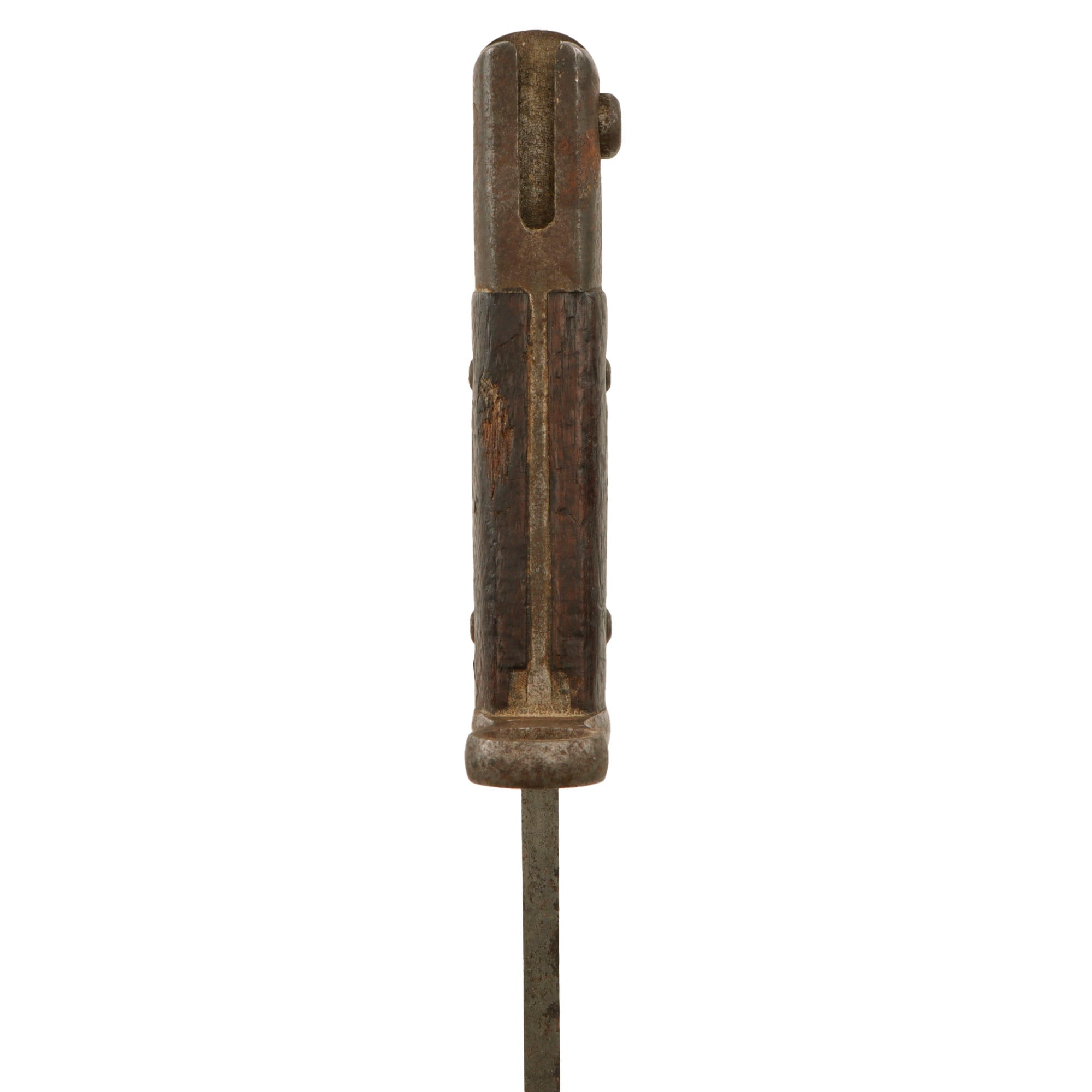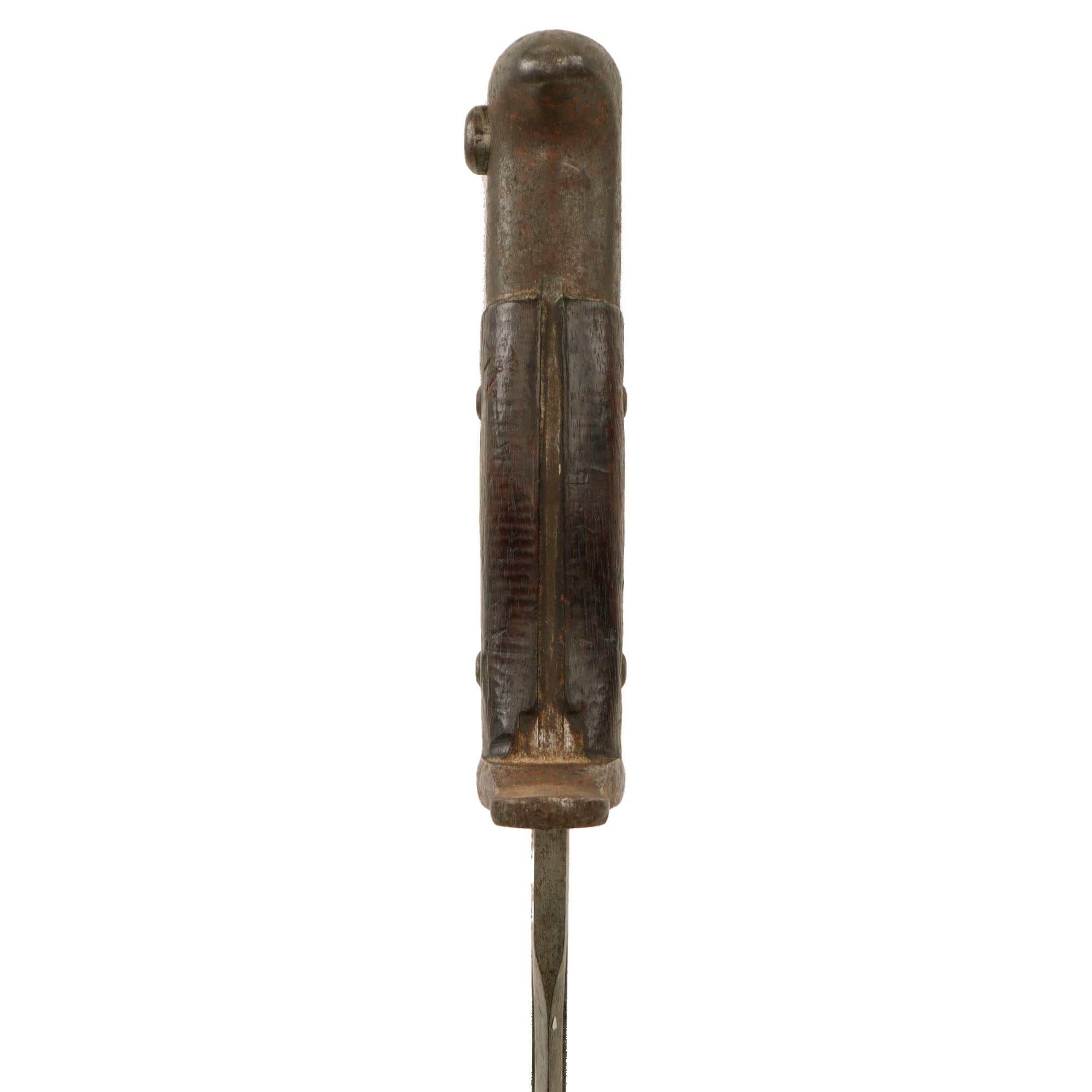 This example is in fair service-used condition, with the original bright finish oxidized to a gray/brown coloration in areas. There is heavy pitting with the very tip of the blade now broken off. Blade shows signs of sharpening, and of heavy overuse, most likely in a tropical environment. The blade could use a good cleaning. The 1892 pattern grips are in good condition with just a few dents and some material loss on one side, and are held in place by domed rivets. The wood does show some wear and is very dark.