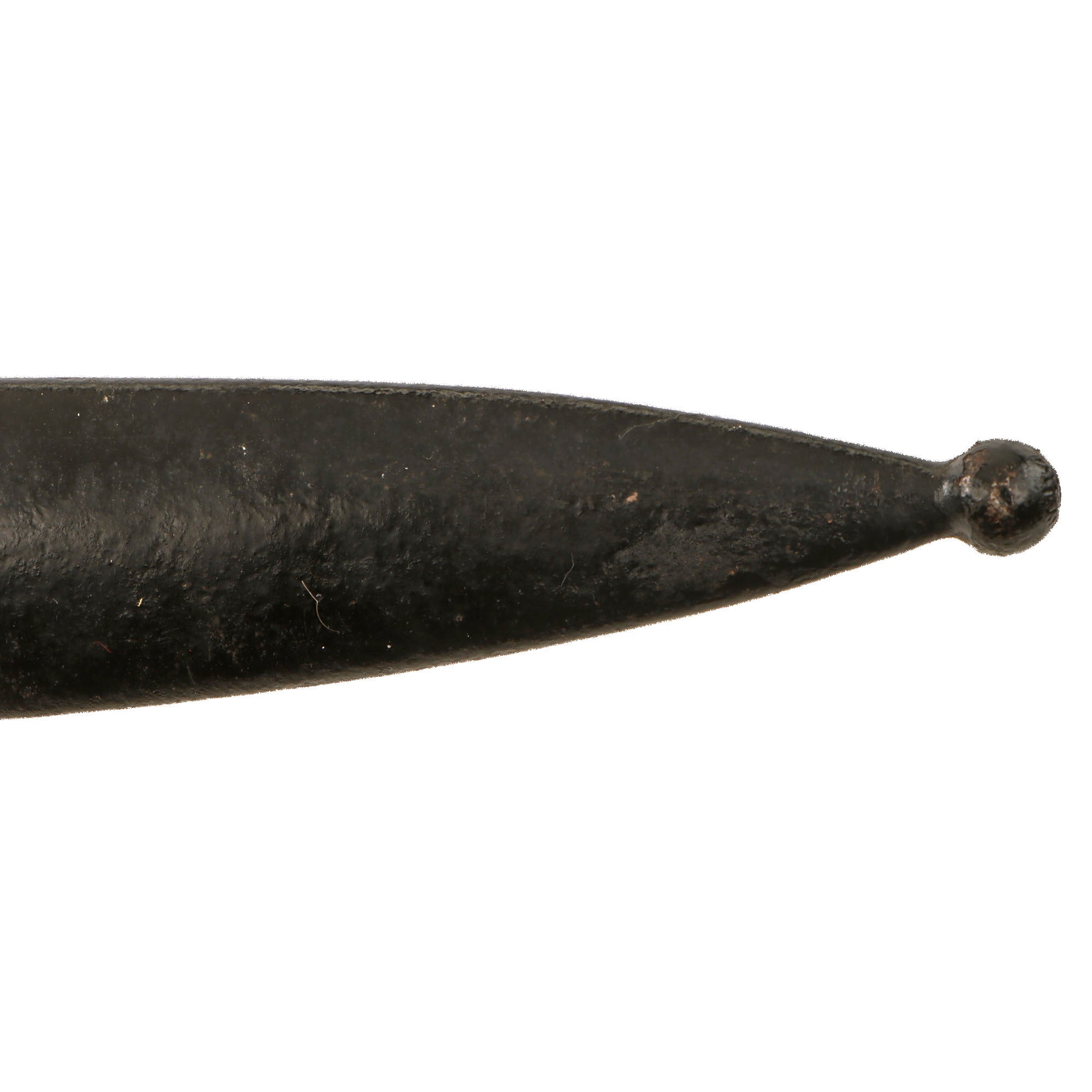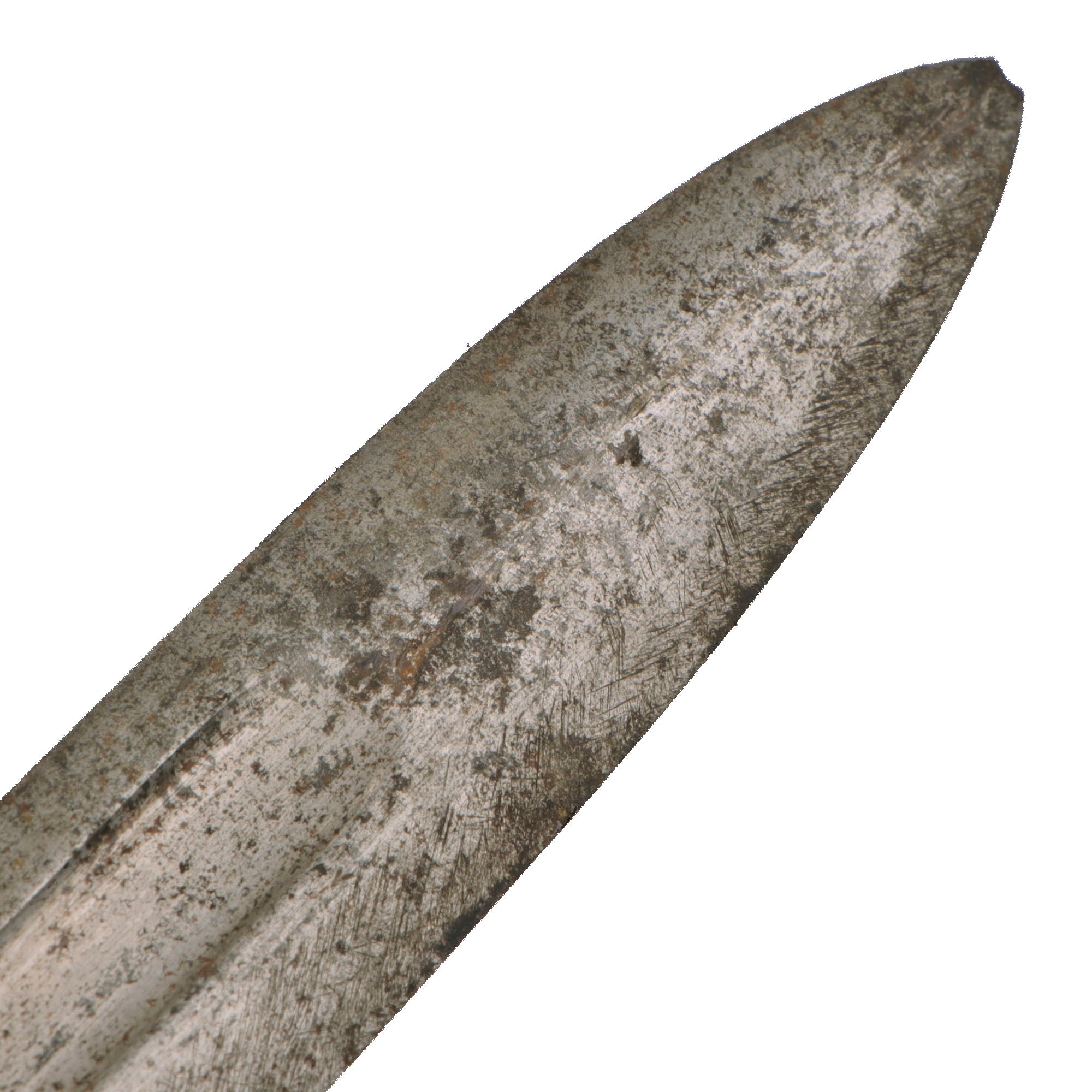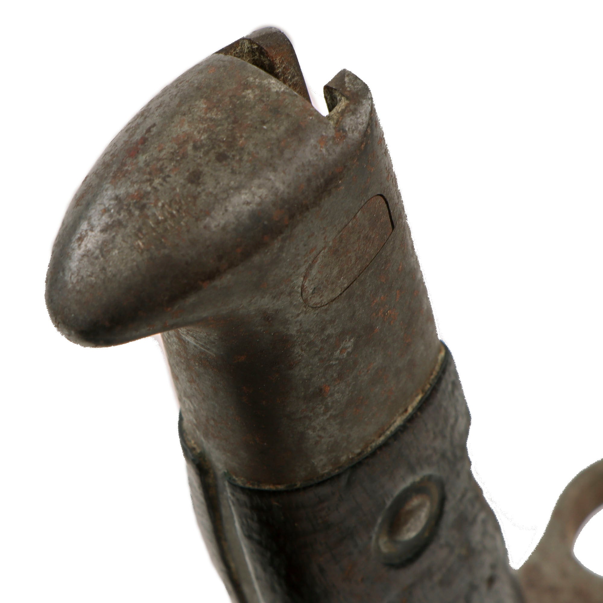 This example is in fair service-used condition, with the original bright finish oxidized to a gray/brown coloration in areas. There is heavy pitting with the very tip of the blade now broken off. Blade shows signs of sharpening, and of heavy overuse, most likely in a tropical environment. The blade could use a good cleaning. The 1892 pattern grips are in good condition with just a few dents and some material loss on one side, and are held in place by domed rivets. The wood does show some wear and is very dark.