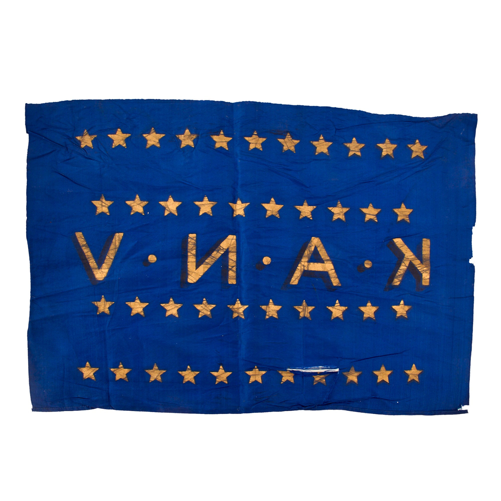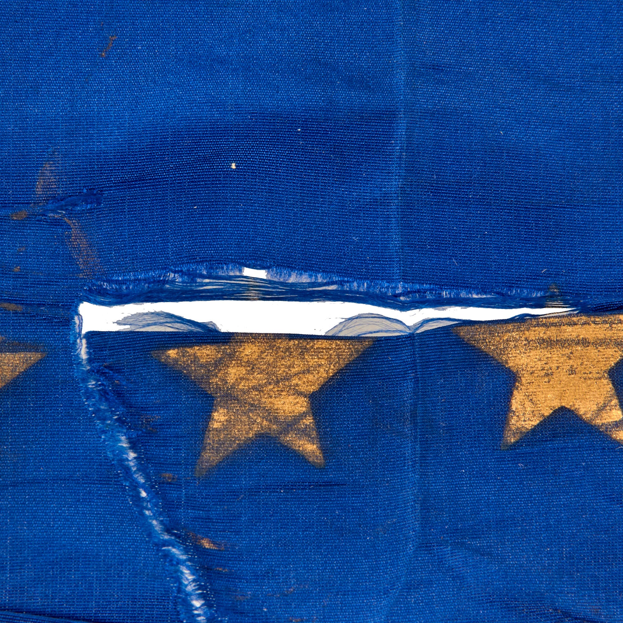 There is some tearing in the flag along the bottom, but the stars are all still discernable. The letters and stars are stenciled on and then painted in gold leaf paint. Essentially one sided, the other showing in reverse and painted in gold as well, since the one side bleed though to the other.