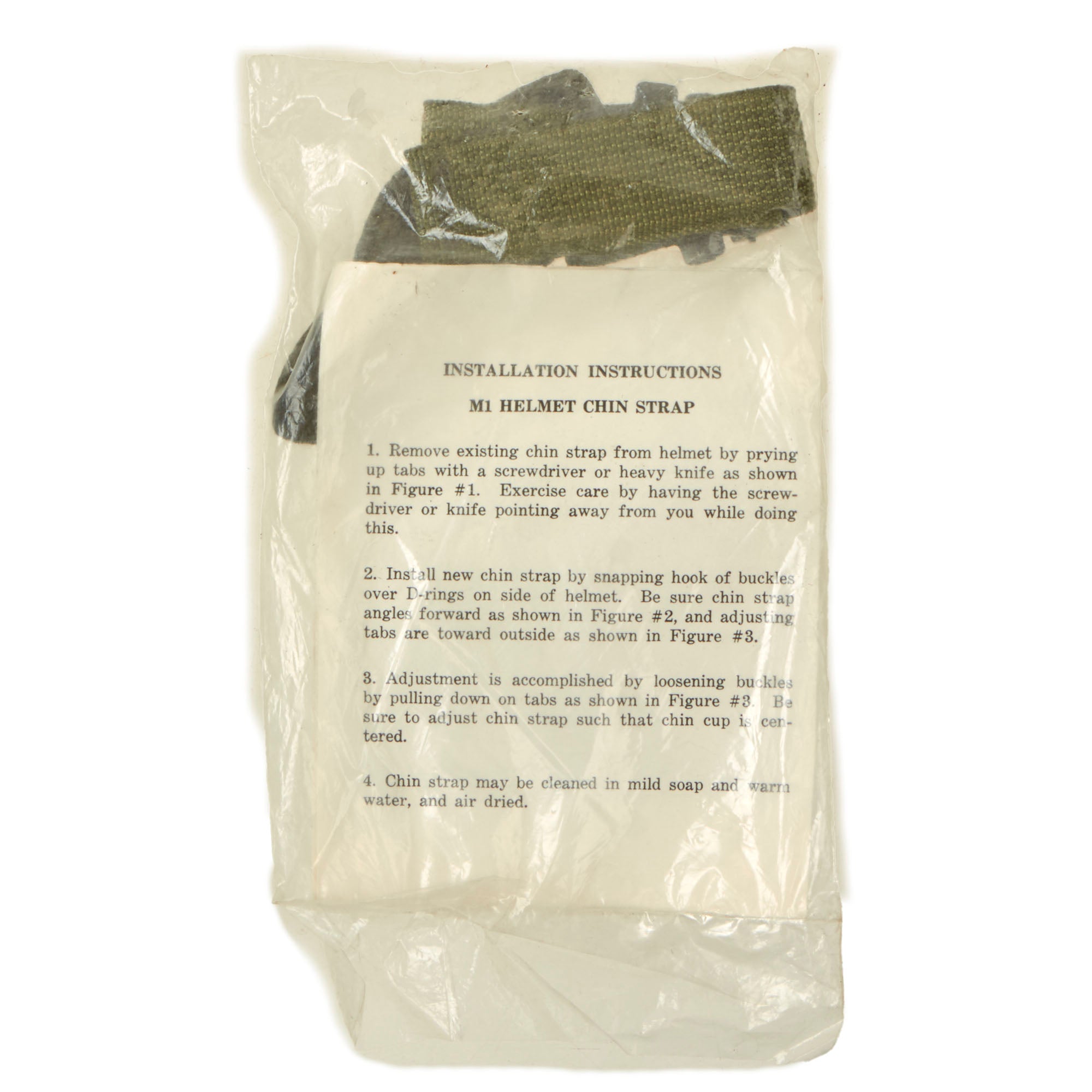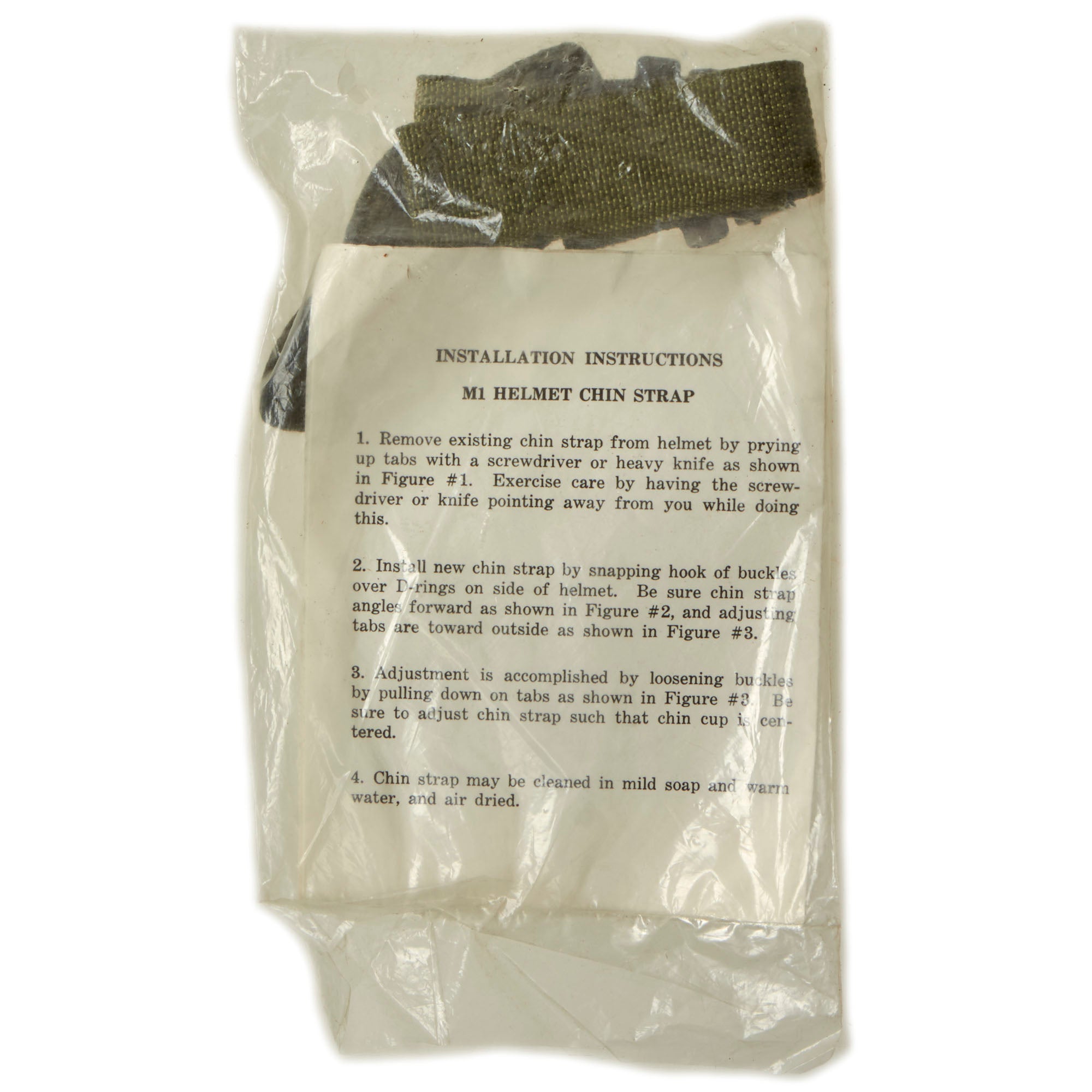 • Original Item. Very Few Available. We are offering a fantastic selection of unissued / new old stock M1 helmet chinstraps from the 1980s. Each chinstrap comes in its original plastic bag with a data sheet / label and installation instruction sheet (may be a photocopy)