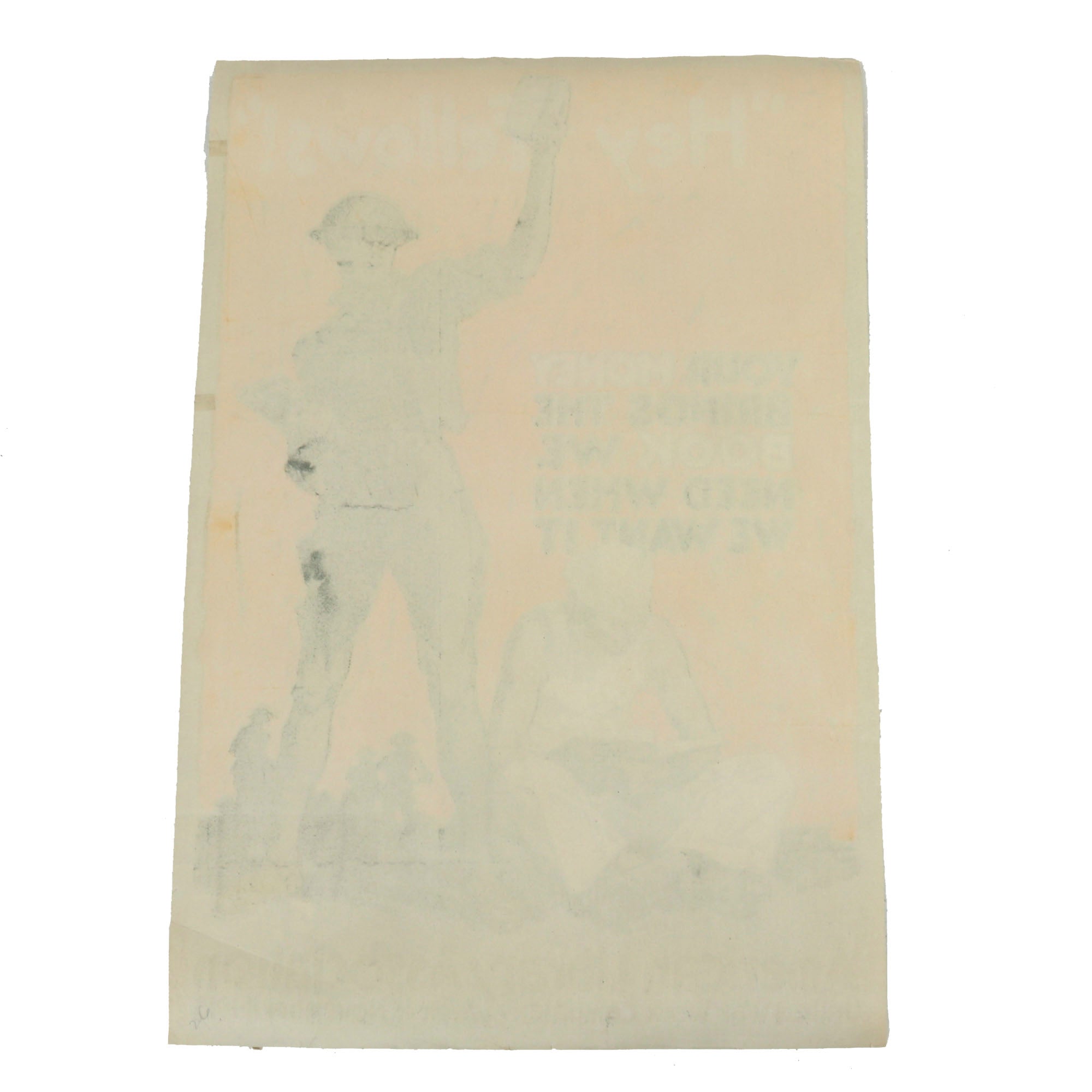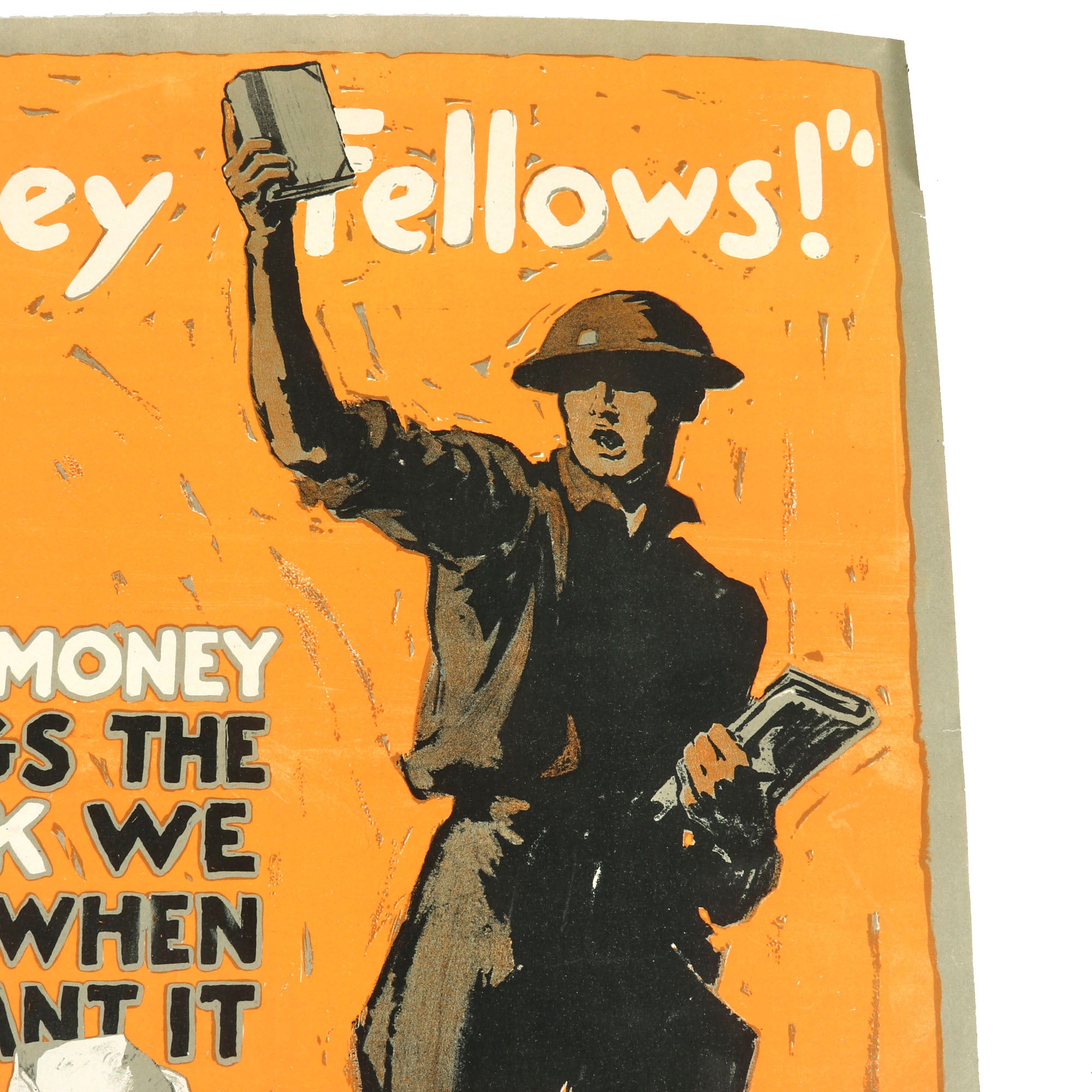 This poster is an example of one of the methods used in advertising this fundraiser. The top of the poster reads "Hey Fellows!", and underneath features 2 servicemen; a Soldier holding books in both hands, and a Sailor reading a book next to a pile of books. To the left of these is the message: