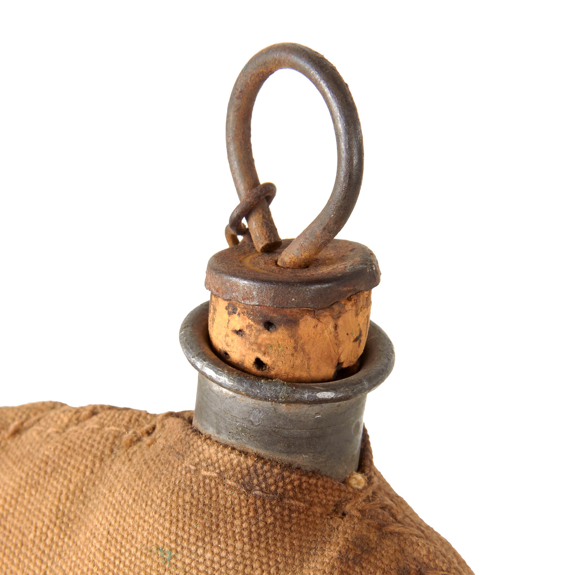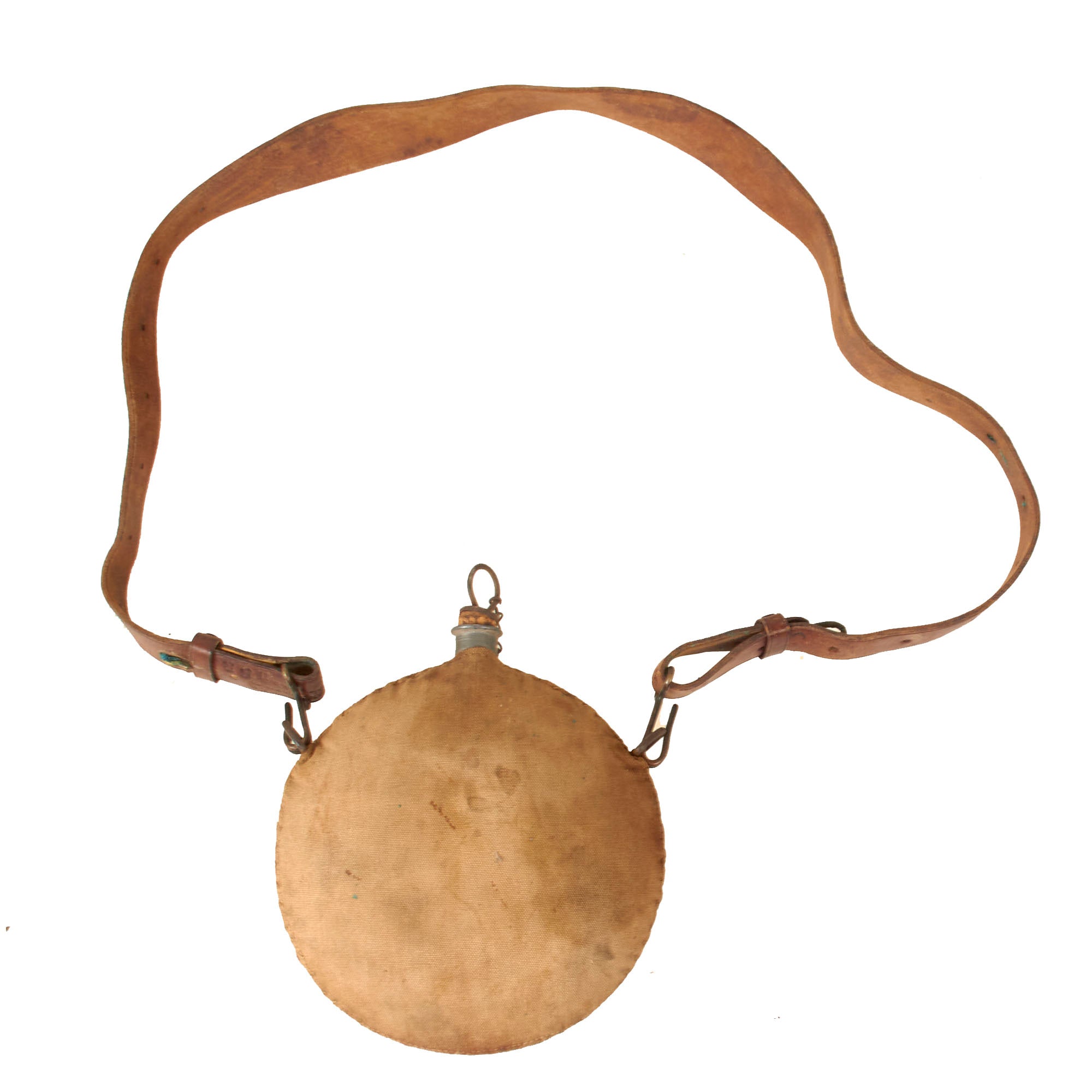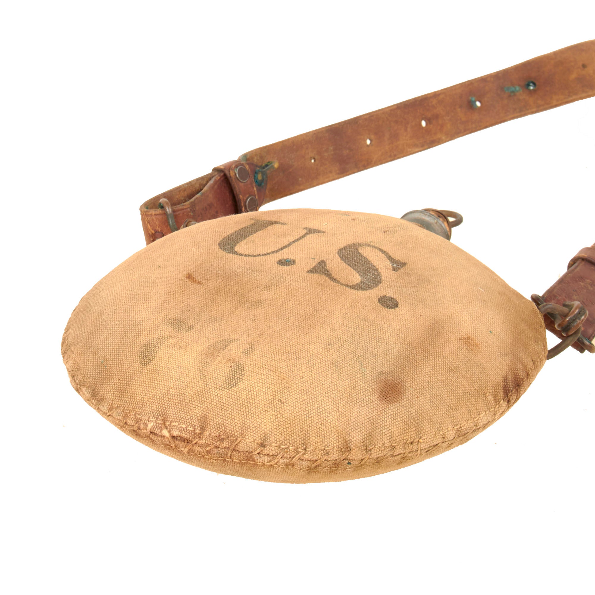 • Original Item: Only One Available. US M1878 Canteen with a tan canvas cover with a very clear U.S. stencil on the front, in very good condition with the original issue sling. This example is very faintly marked on the front with a number, 76. The sling of this example is dated 1909 by Rock Island Arsenal, and is actually stamped at both ends of the strap with: