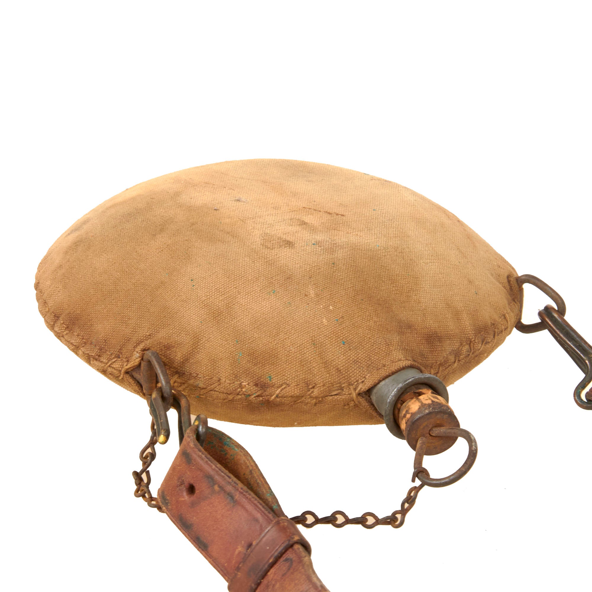 The canteen is complete with its original cork stopper secured to the neck of the canteen by a brass ring and chain. The cork itself is broken but is still present. It also has the proper pattern leather shoulder strap, of the later adjustable style in good condition.