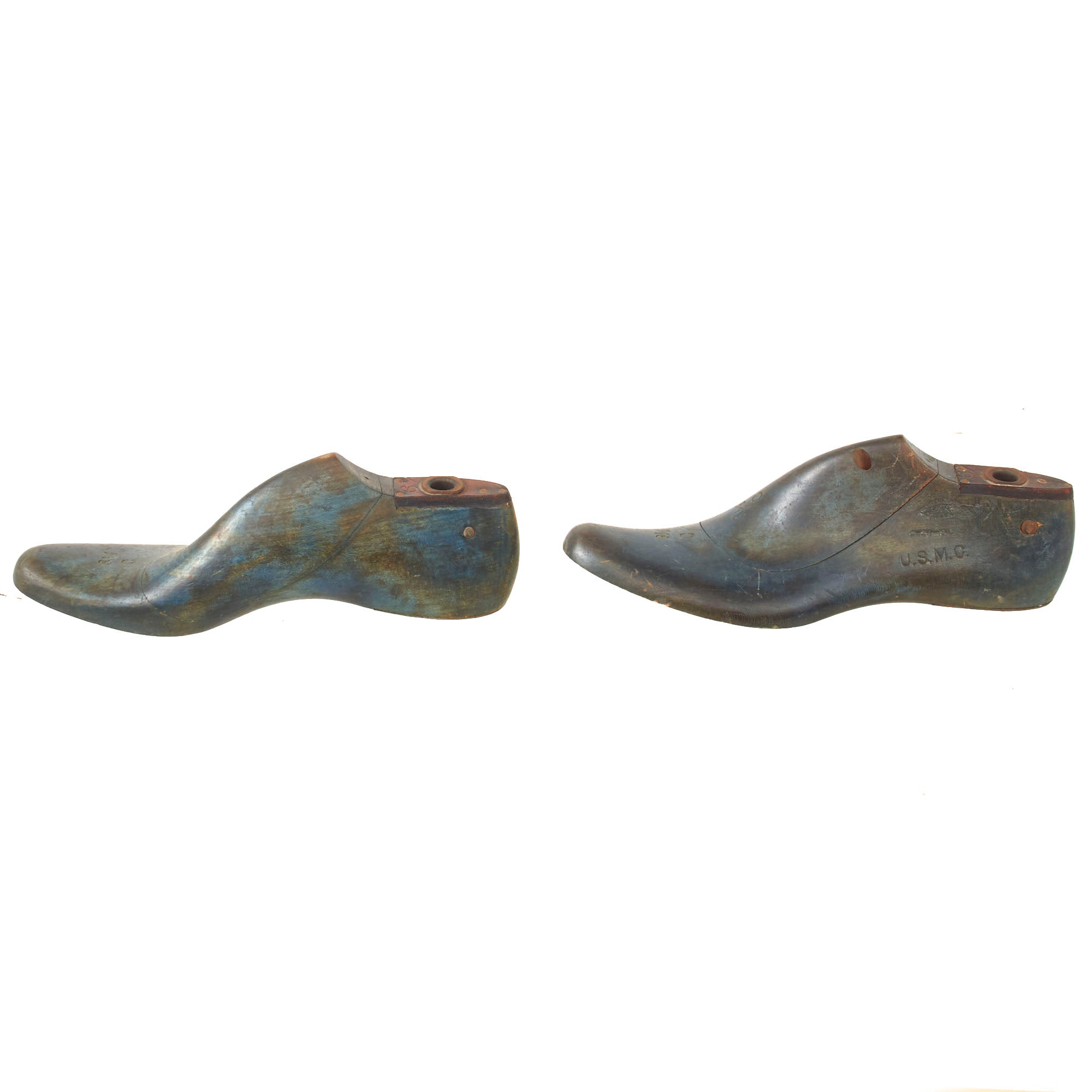 Original Items. Only One Set Available. This is a very peculiar but entirely original set of United States Marine Corps marked shoe trees. The trees are small and painted blue, measuring roughly 10 ⅝” long, 3 ¼” wide, and 4” tall. They are marked for Size 6 1/2C.
