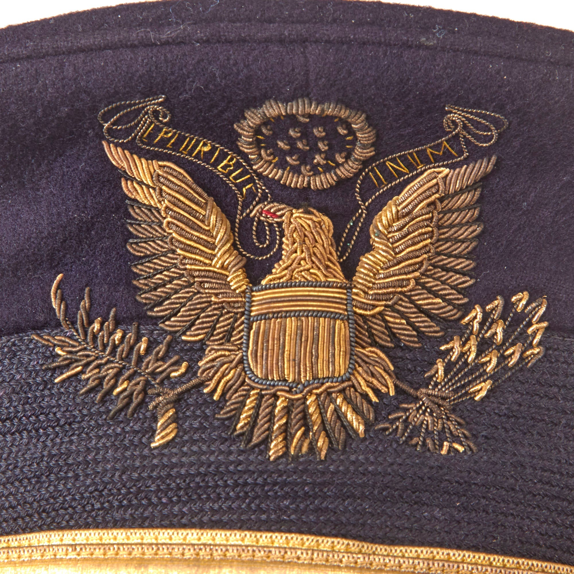 Original Item: Only One Available. This is a Navy blue Model 1902 peaked visor that belonged to a US Army NCO during the Pre-WWI era. The visor replaced the earlier pattern known as M1895. This particular pattern was the second visor cap design of the US Army after they stopped using the traditional kepi design. This example is identified on the sweatband to Sergeant James Albert Churm, who enlisted in Company F, 12th Infantry, Pennsylvania National Guard on May 5th, 1905. He re-enlisted on May 16th, 1908, May 24th, 1911, May 24th, 1914, and July 13th, 1917, being discharged on August 21st, 1917, likely due to his age, for a total of 12 years in service. He did not see service in WWI.