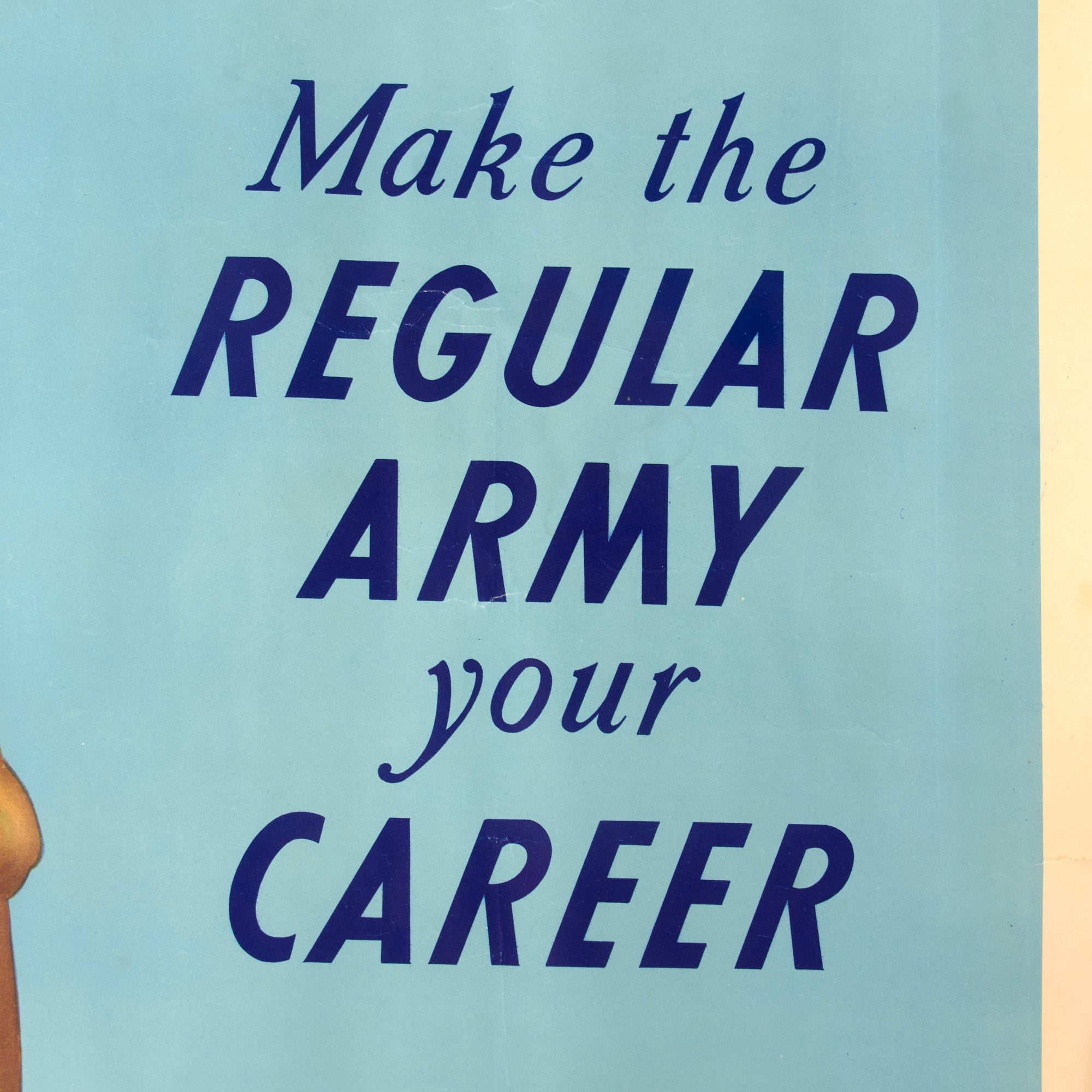 Original Item. Only One Available. This is a very scarce example of a U.S. Regular Army enlistment poster designed and printed in April 1941, 8 months before the United States would enter the Second World War. It depicts an American soldier with an M1 Garand slung around his back, wearing a Kelly Helmet and marching forward. This example has very heavy tearing as shown.