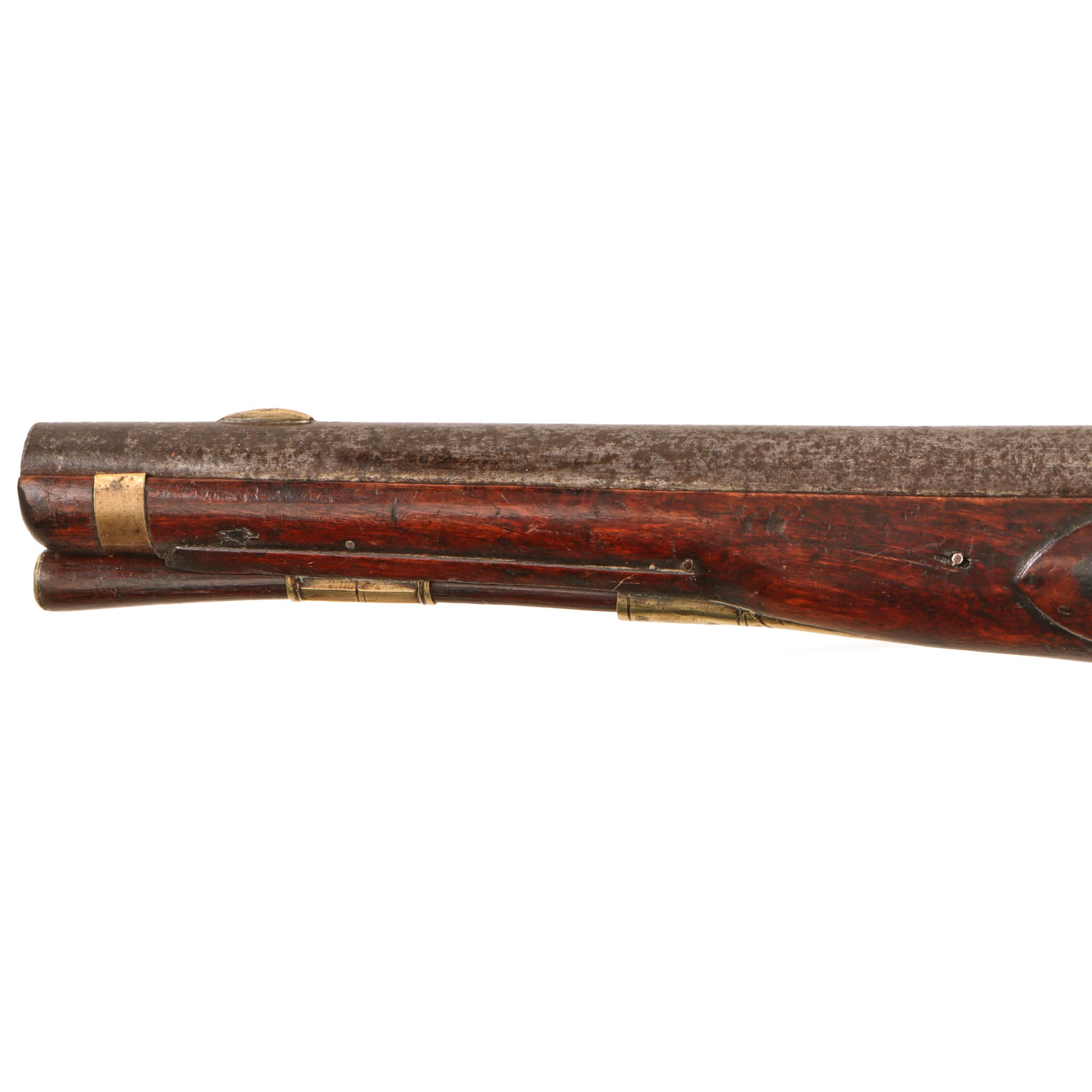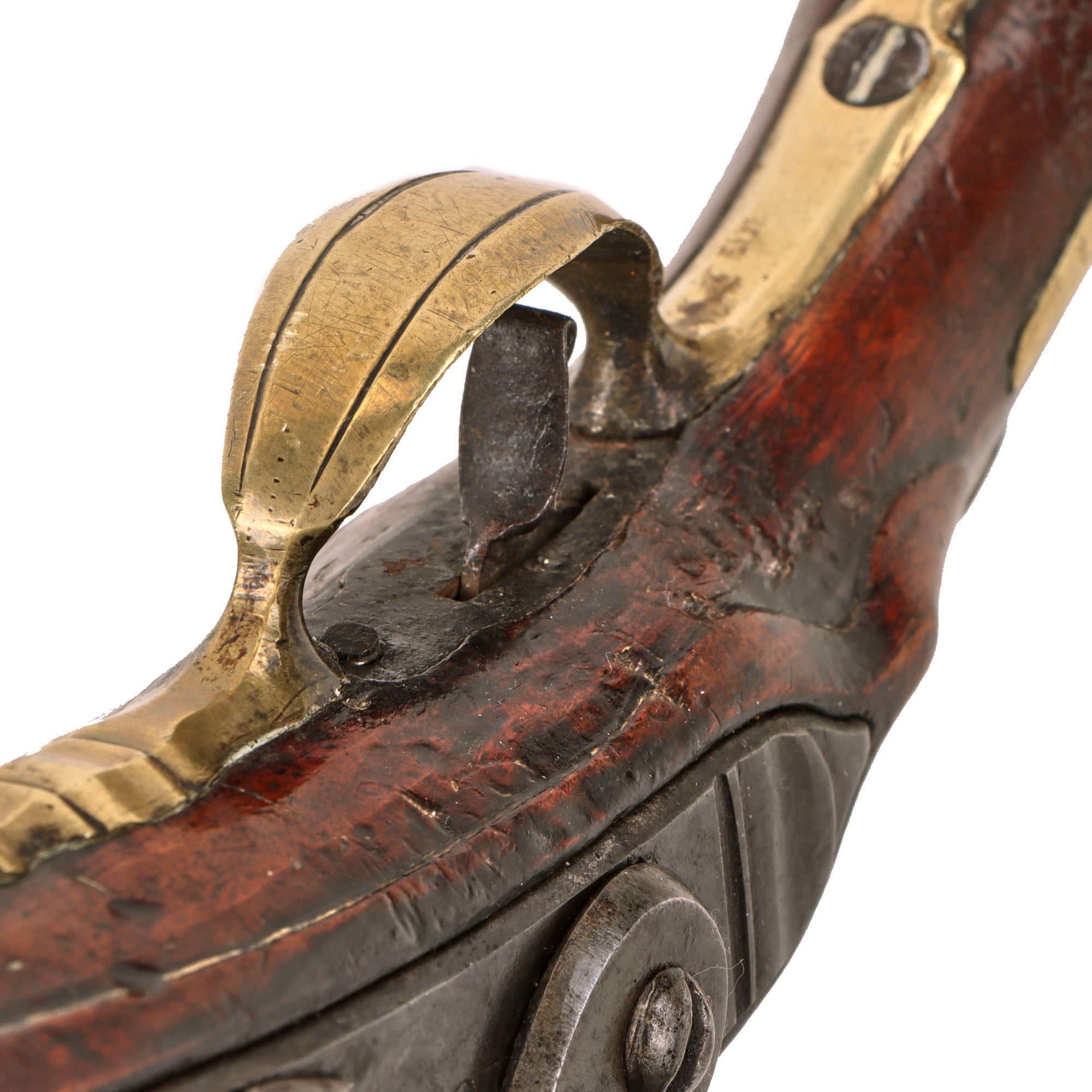 Condition is simply lovely, and we will unlikely ever see another this good and "well rested", without overly aggressive polishing that is so common. The stock is great, well carved with "island carving" embellishments around all of the fittings. It has a beautiful color, and we do not see any structural damage, just the usual dents and dings from service. The metalwork is also lovely, with the barrel having a lovely aged patina. We checked the lock, and it functions correctly, holding at half cock and firing at full. It features an original brass capped ramrod, which matches the patina of the pistol perfectly.