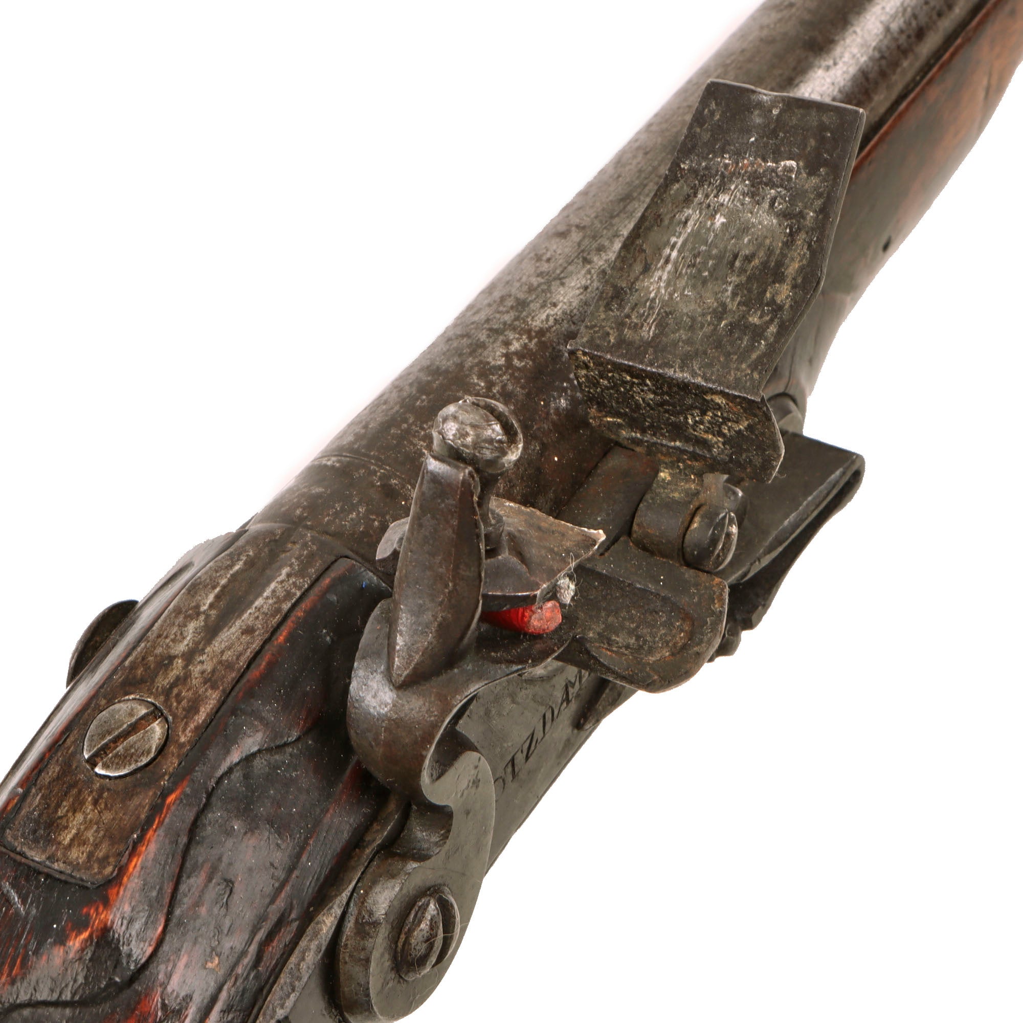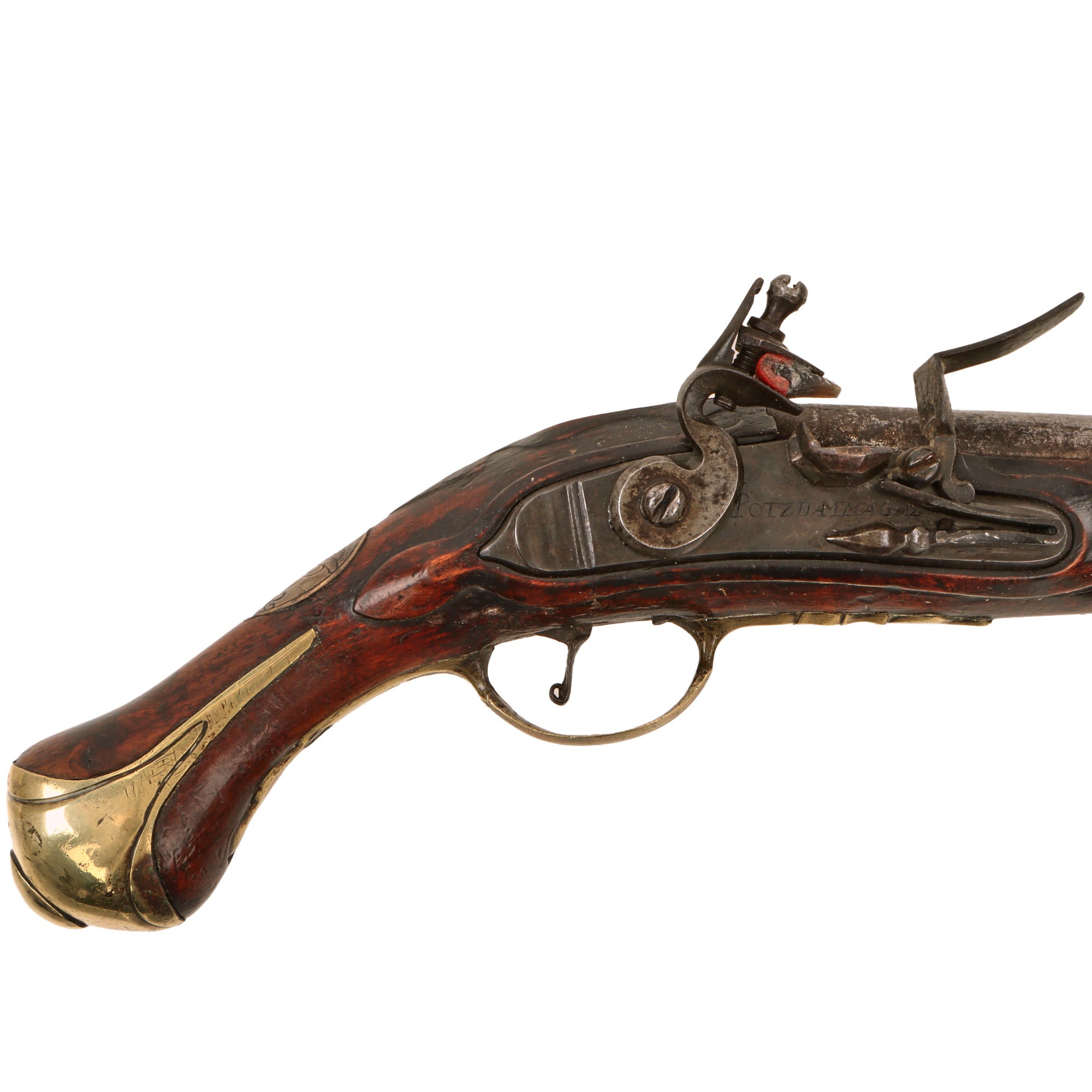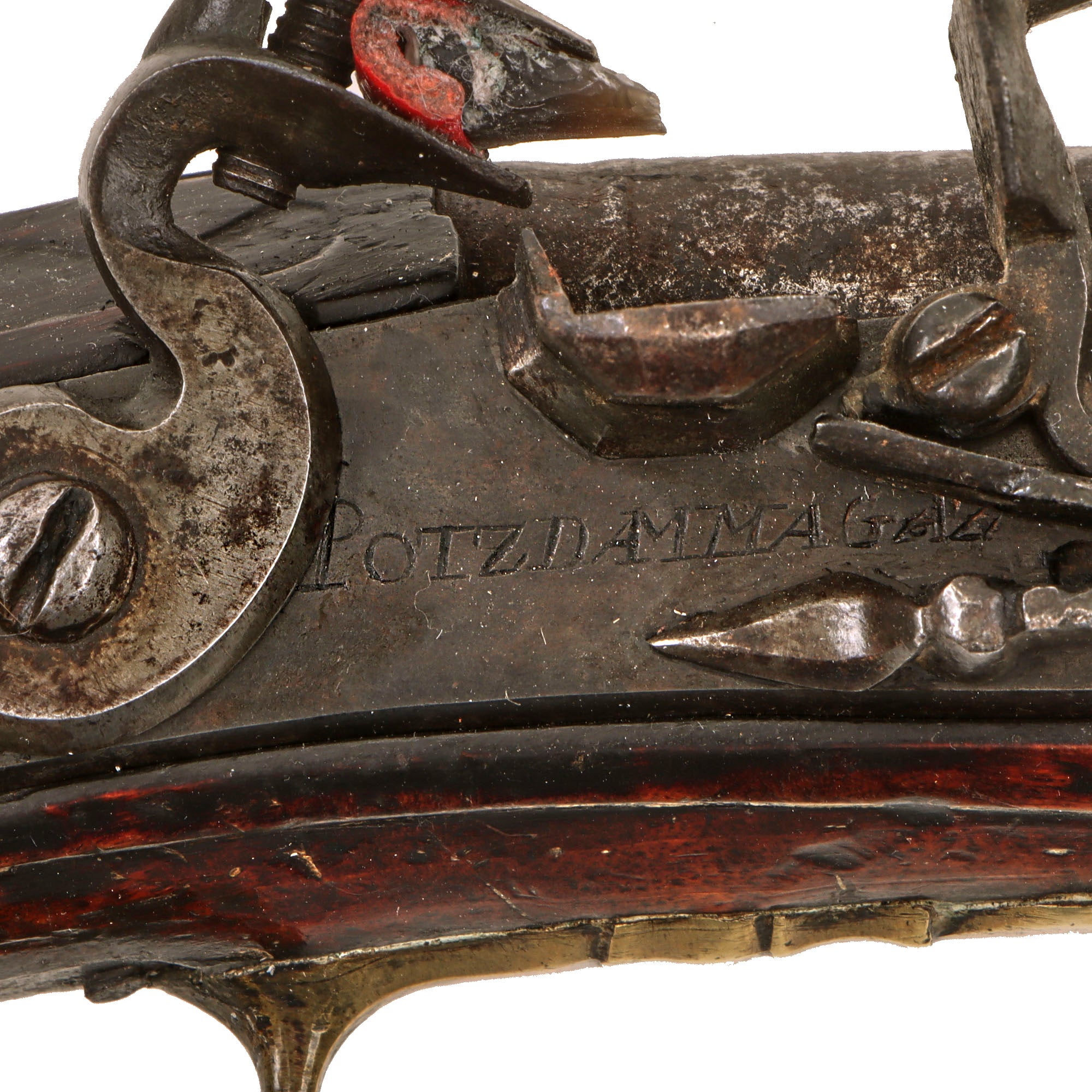 Original Item: Only One Available. This is a fantastic example of a Prussian Model 1742 Flintlock Cavalry Pistol, as used by Hussars, Dragoons, and other mounted units in the mid 18th Century Prussian army. It has a fantastic aged look, and does not show any signs of restoration. It features a classic "banana" shaped lock plate of totally classic German "angular" style, with a "teat" at the rear, and has the correct un-bridled frizzen and faceted flash pan. The face of the lock is marked POTZDAM MAGAZ, short for "Potzdam Magazin", or "Potsdam Arsenal". Many flintlock arms produced is during the mid-late 18th century in Potsdam were marked as such during the reign of the Prussian King Frederick the Great, who reigned from 1740 until 1786.