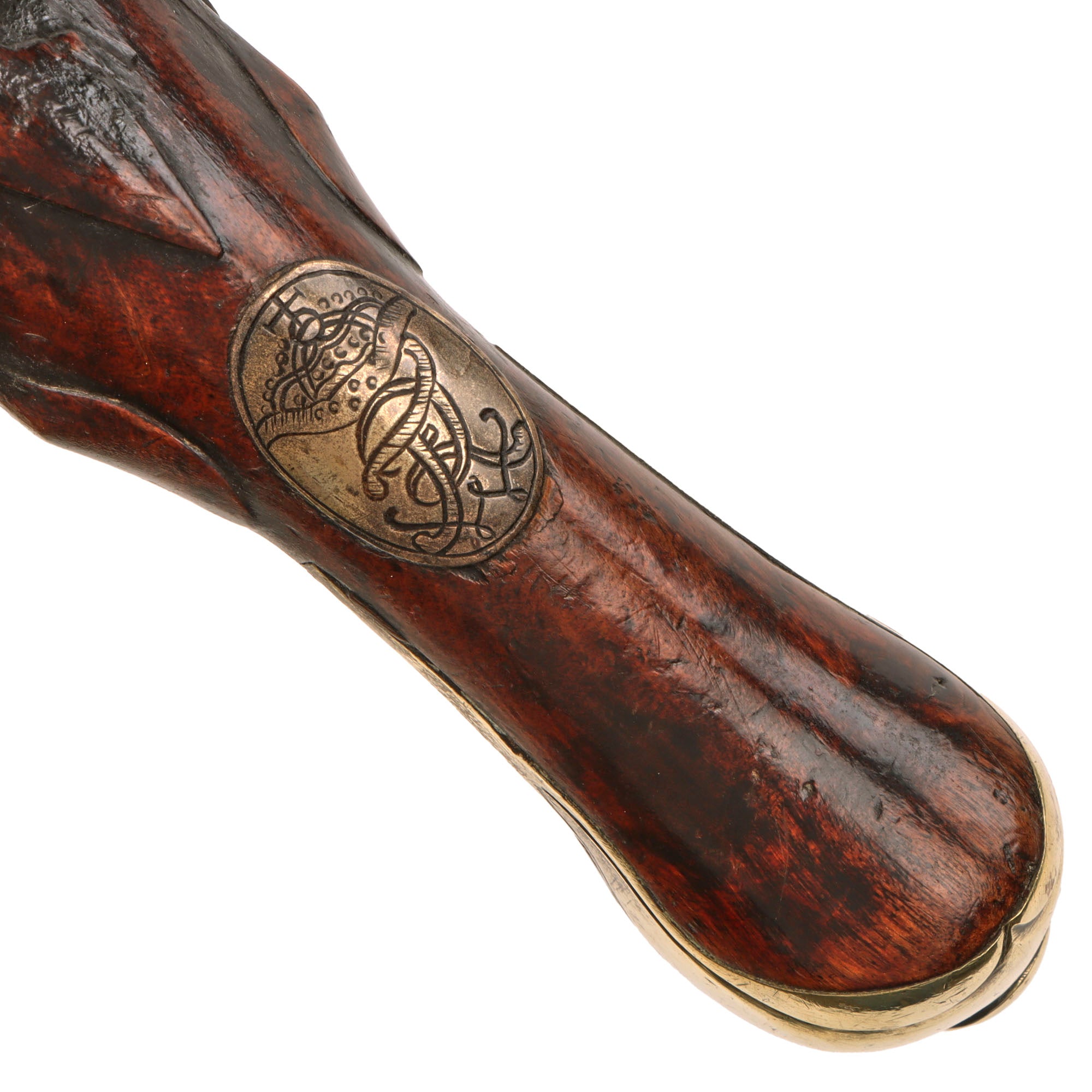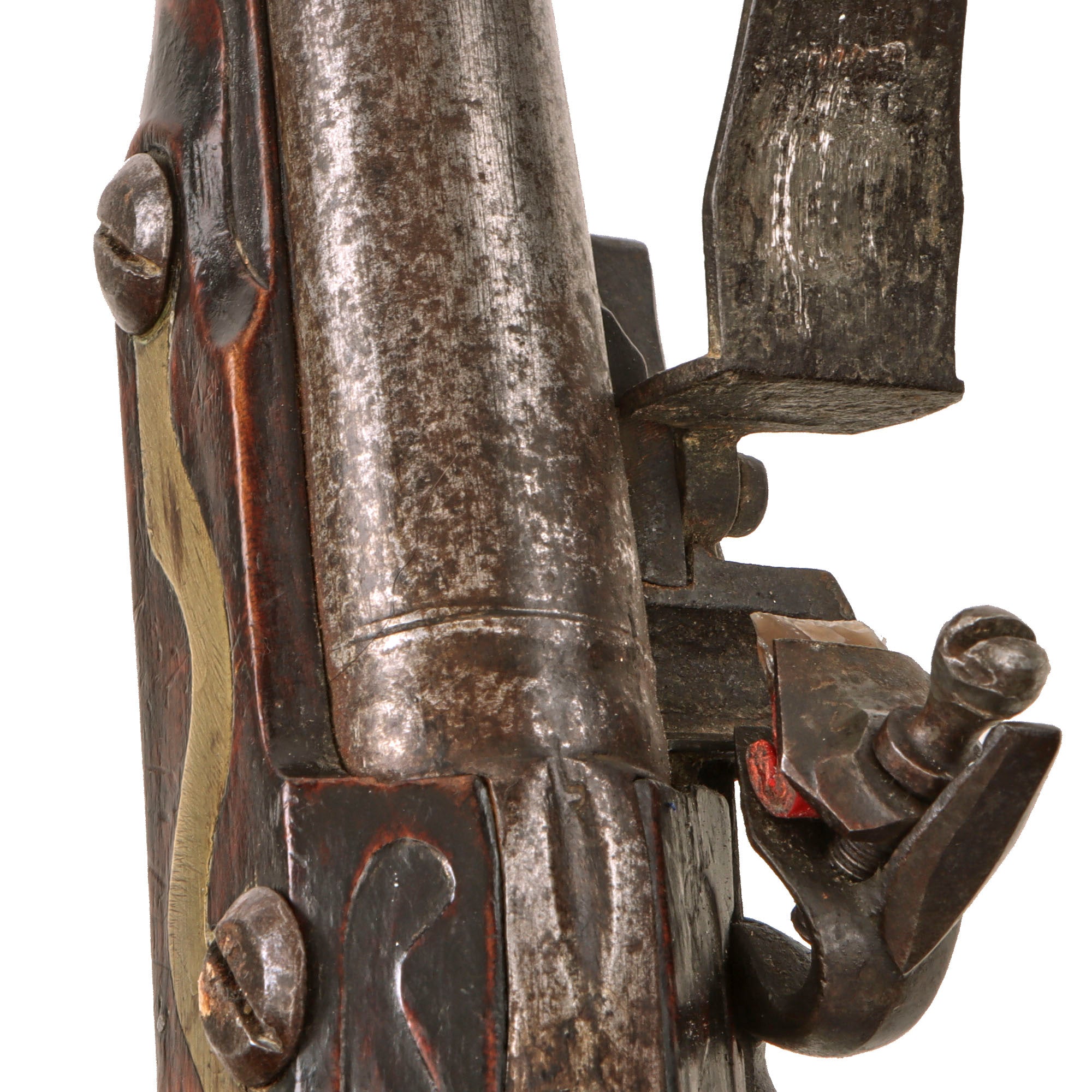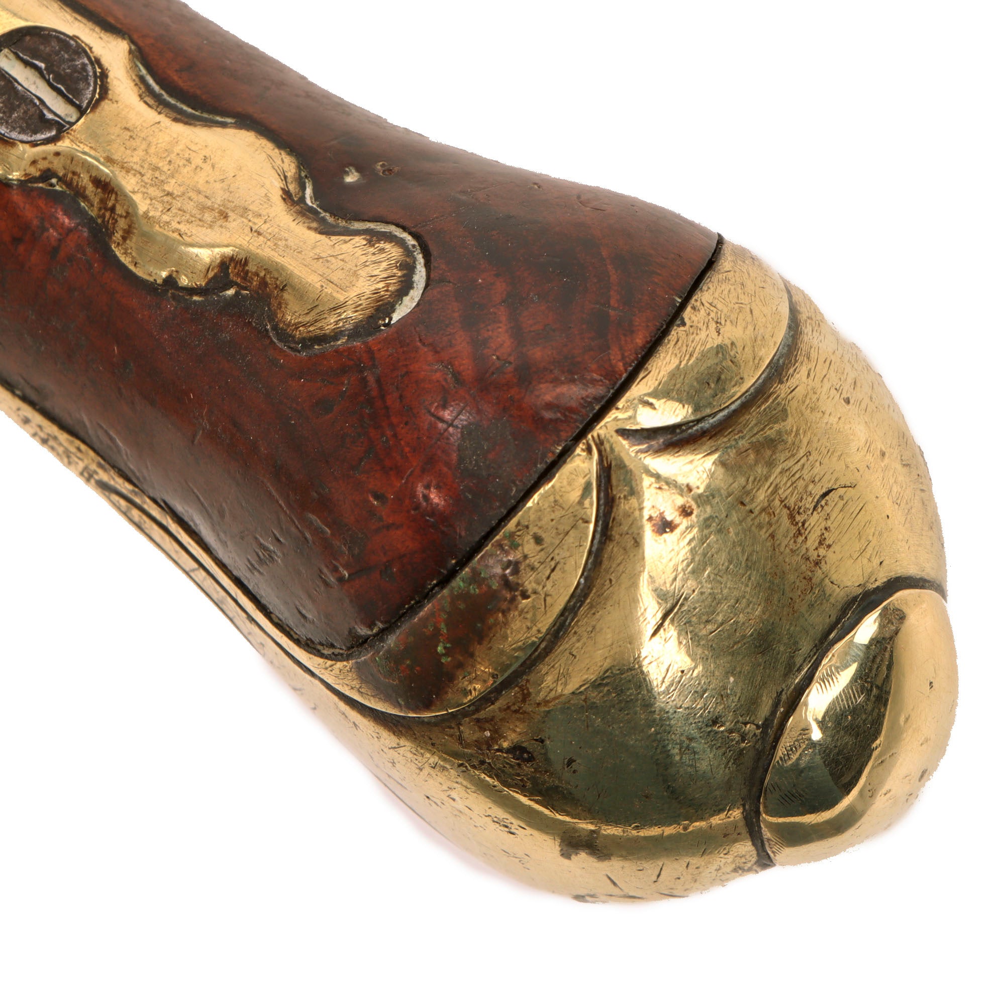 This substantial German cavalry pistol has a 12 inch long barrel of 0.67" caliber held on by pins through the stock, and measures 19 1/2 inches in overall length. This is a bit shorter than often seen, so it may have been shortened a bit while in service. It is all brass mounted, including the characteristic faceted trigger guard, and has a flat serpentine brass side plate, which distinguishes it from the earlier Model 1731, which had a raised side plate. It has the characteristic "long eared" butt plated on the lobed butt, however there is no lanyard loop present, so it may be some sub variation of the Model 1742 we are not aware of.