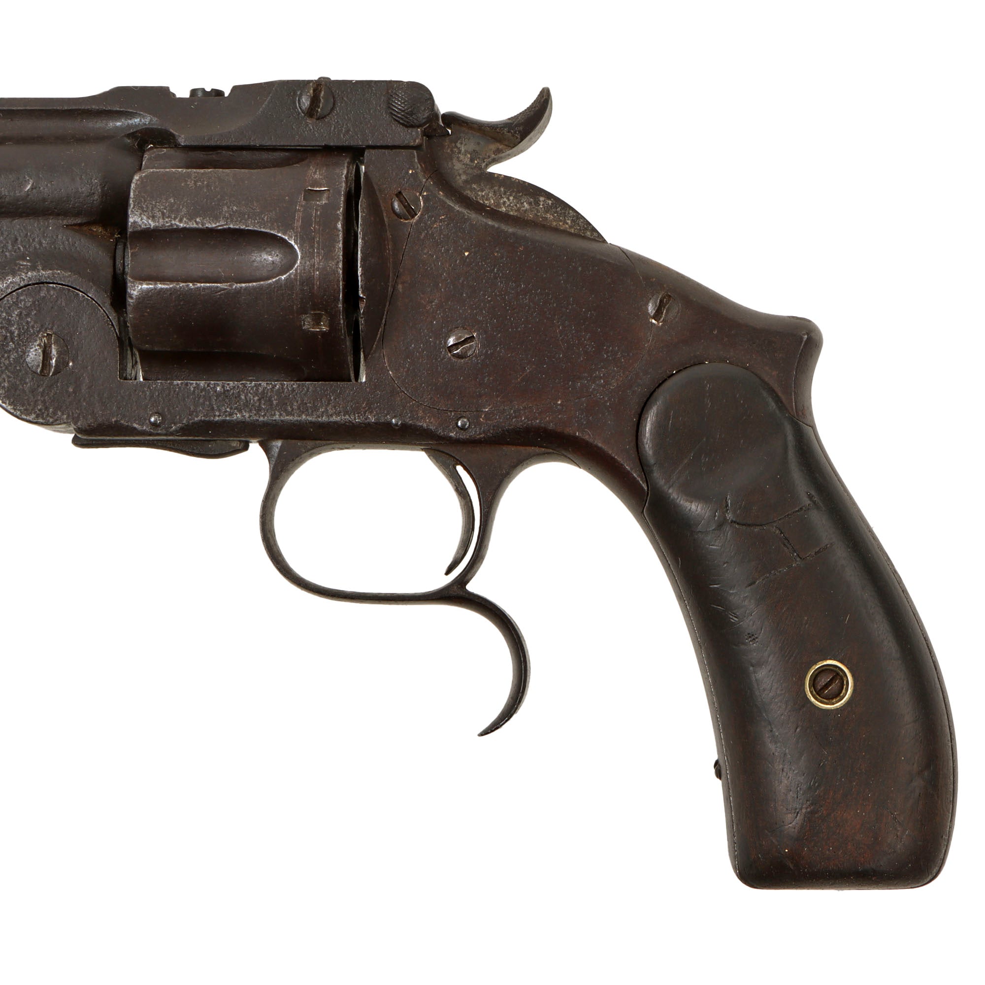 Original Item: Only One available. This is an amazing find! Every young "Wild West" fans dream: A real Cowboy Six-shooter! This is a very nice frontier-worn Smith & Wesson Russian Third Model No. 3 revolver in .44 Russian, identical to the Russian Contract models, except for the markings. It features some lovely aged original walnut grips, personalized on the left side. The S&W Model No. 3 was introduced in 1869 as the U.S. Army's principal sidearm, which they used until 1873.