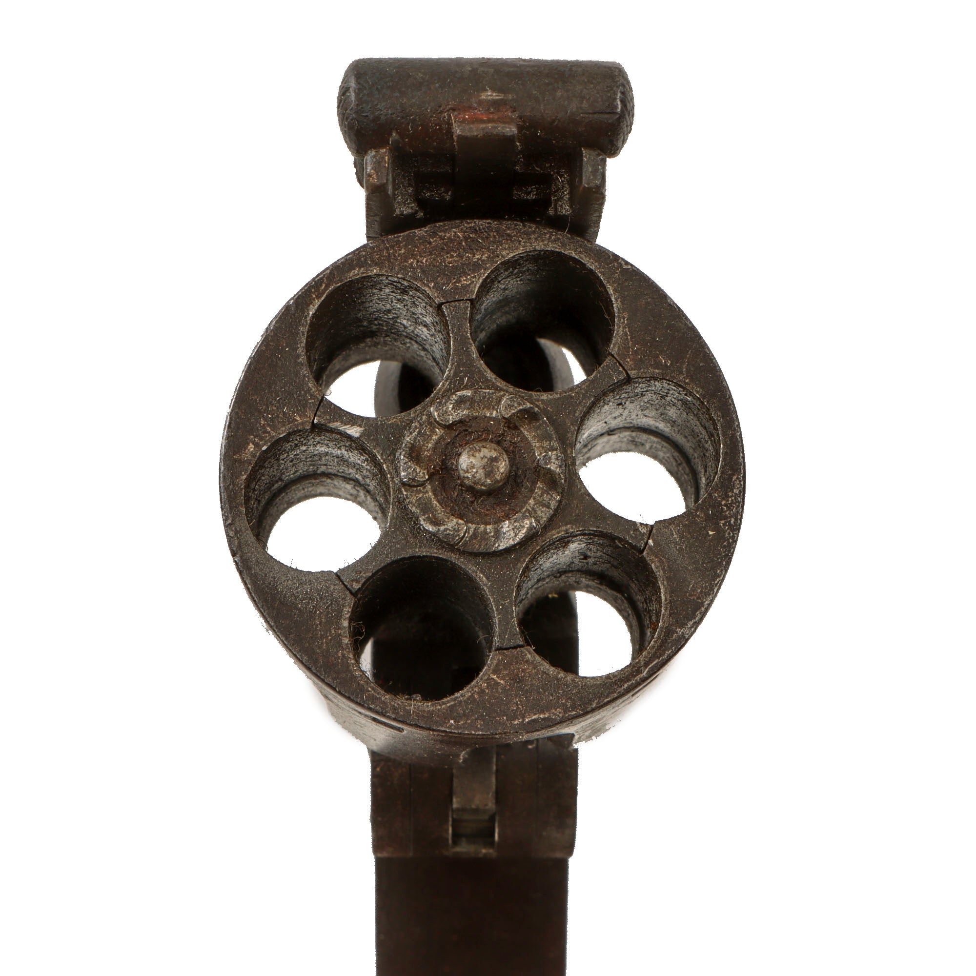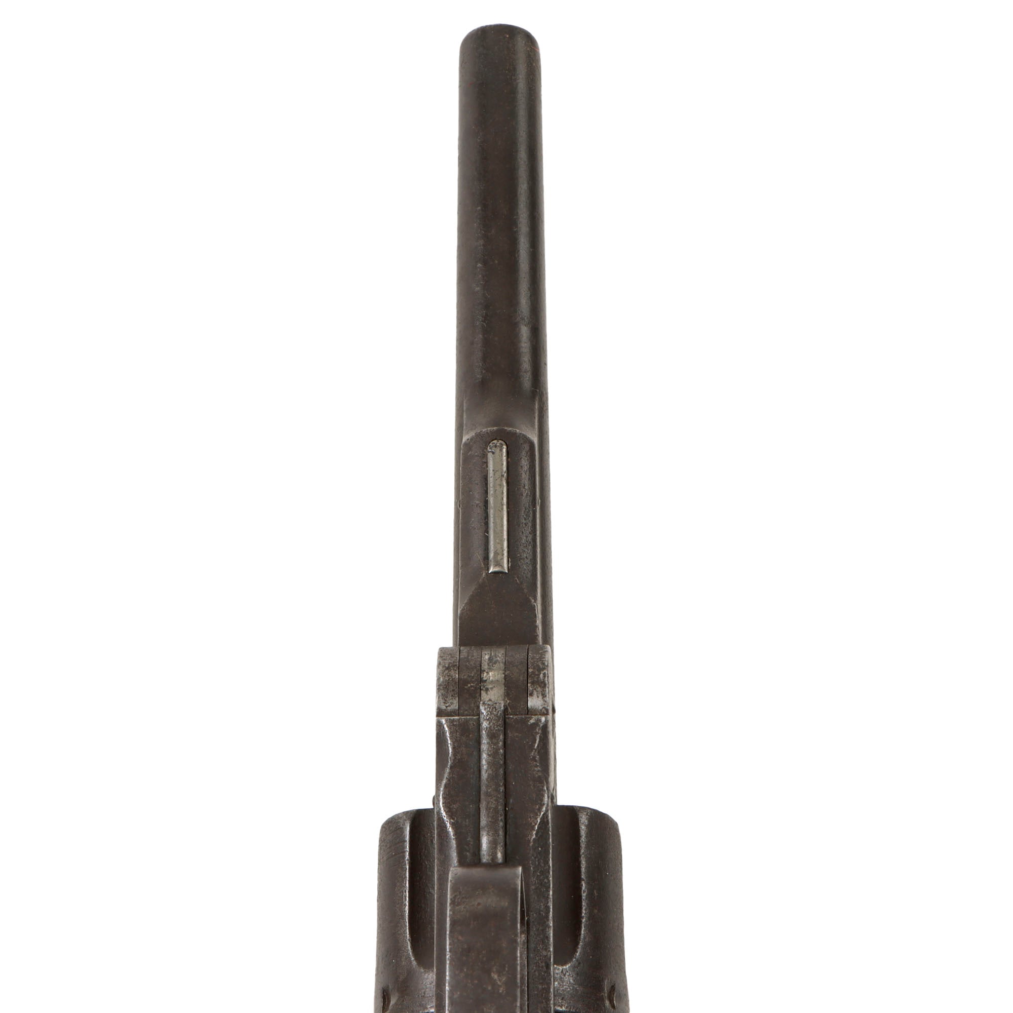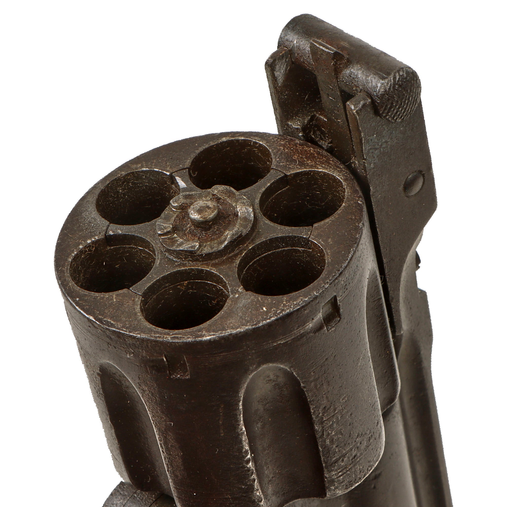The revolver functions well, with a good cylinder lockup, and smooth crisp action. The cylinder indexes correctly, and the hammer has a fully functional loading position, which frees up the cylinder and allows the barrel latch to be opened. The ejector is fully functional as well, though we have not tested it on actual cartridges. The bore is in very good condition, showing a mostly bright finish with crisp lands and grooves. There is a bit of past fouling and oxidation in the grooves, but nothing out of the ordinary for a revolver of this age, and definitely a pretty stark contrast to the exterior.