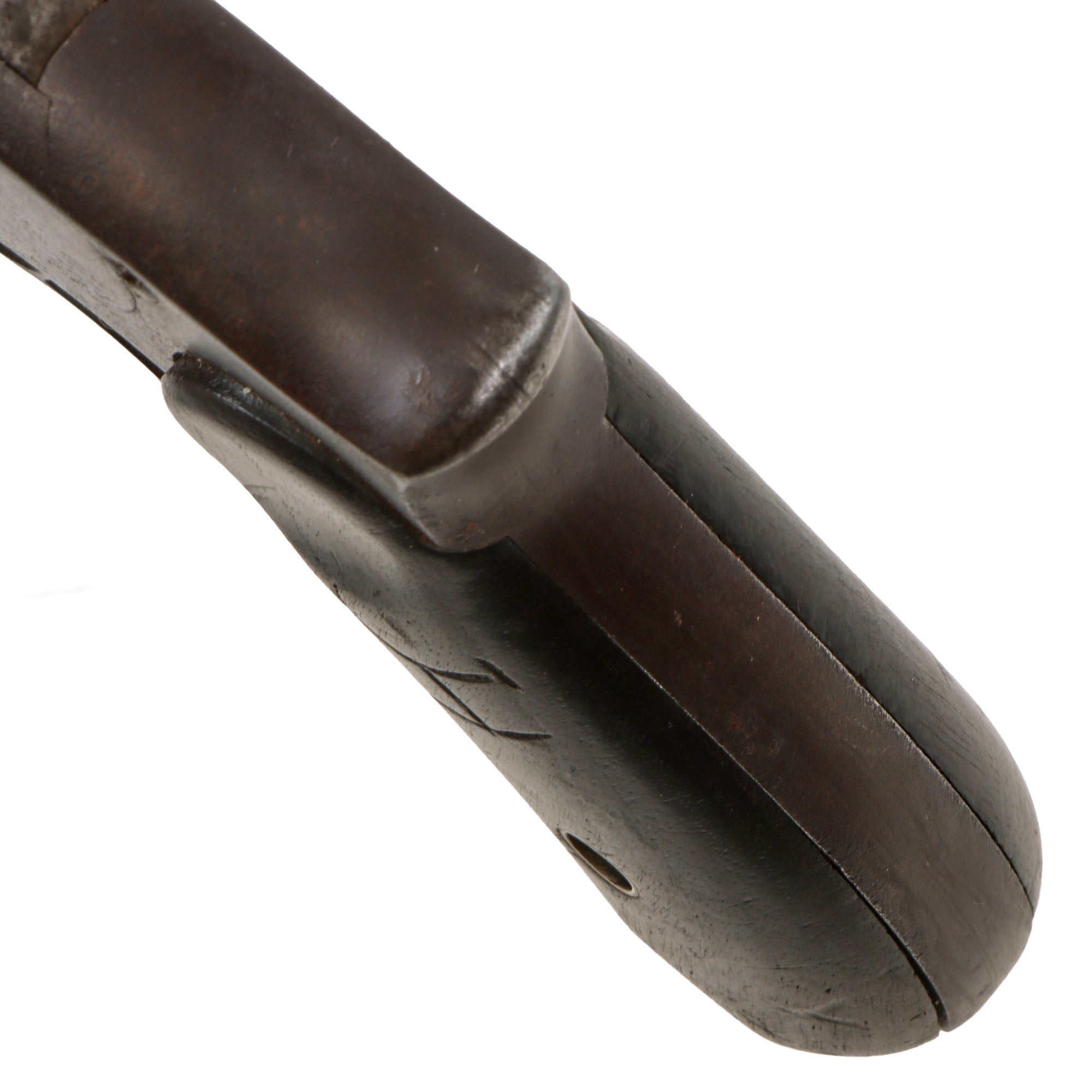 Exterior condition is a dark oxidized patina, showing areas of past peppering as well as light past pitting, later cleaned away. This looks like a revolver that was exposed to the elements for a long period of time, probably out on the frontier, where rain was not a reason to stop. There are no trades of the original finish, even under the grips, so we believe that the revolver was originally blued. The grips have aged beautifully, showing a lovely dark brown color with no major damage such as cracks or chips. The left grip scale has a conjoined JH marking, most likely the initials of the owner.