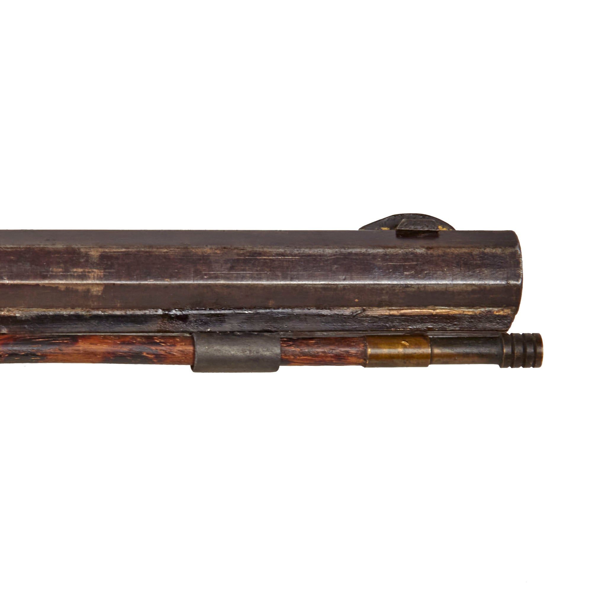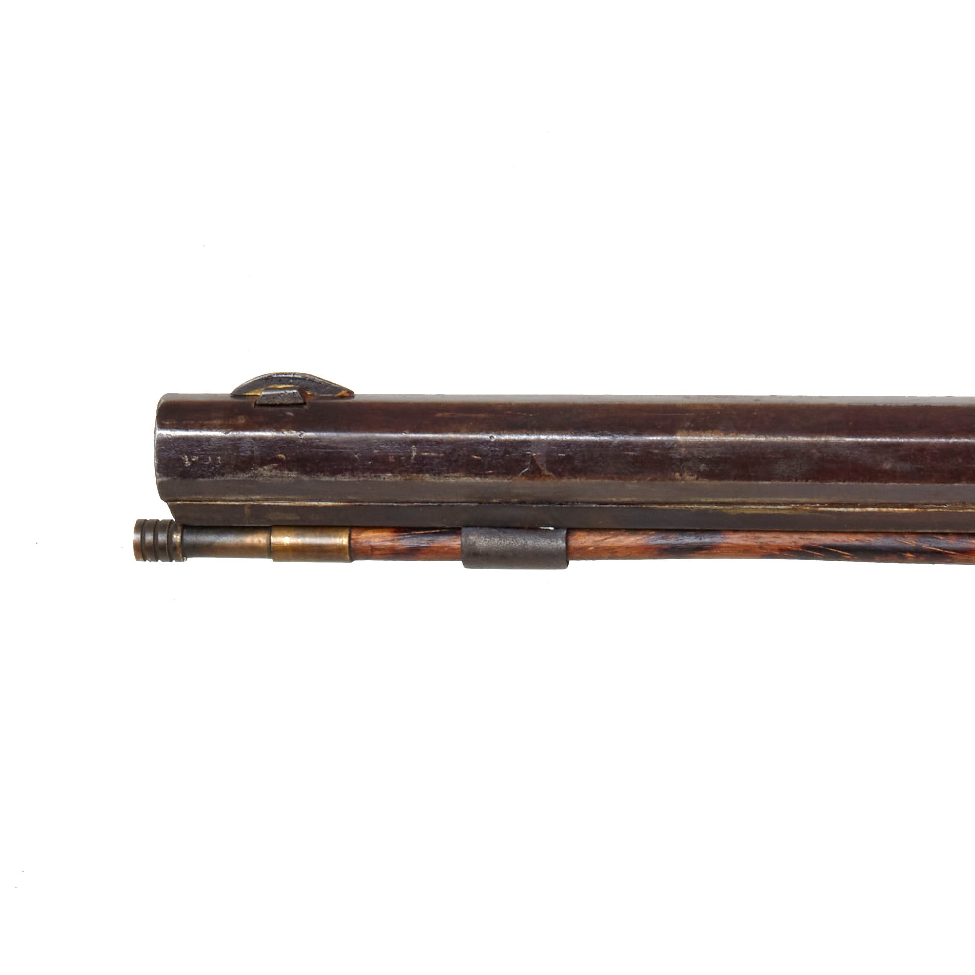 The rifle features all iron mountings, which all show a lovely aged peppery patina. It has a 34 1/4 inch long octagonal barrel with a bore of about 0.45", a common size we see on these rifles, which is cut with 8 groove rifling. Overall length is 51 5/8 inches, and the barrel is relatively heavy for accurate shooting, much like "bench rest" rifles of the day. Close examination of the muzzle shows that the barrel was bored out and sleeved for further use, almost certainly at some point during the 20th century. Additionally, the cap bolster and nipple cone were replaced with one that has a cleanout, and it's definitely in nice shape.