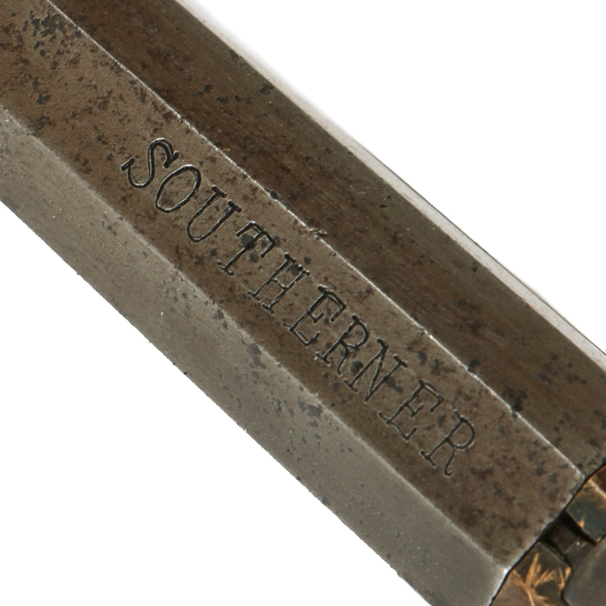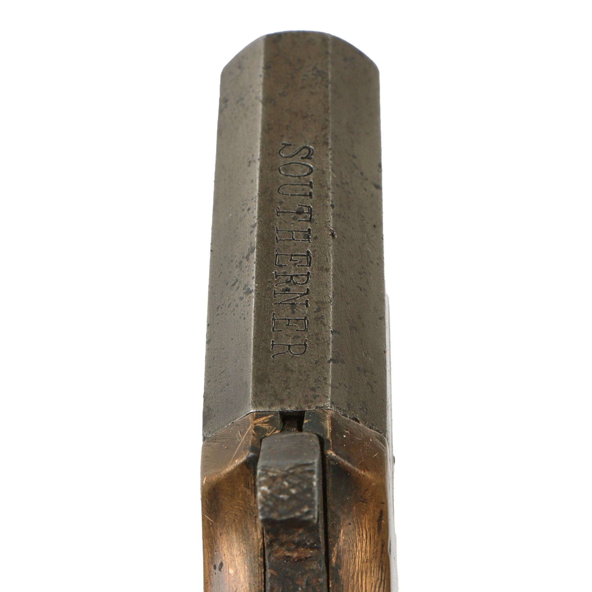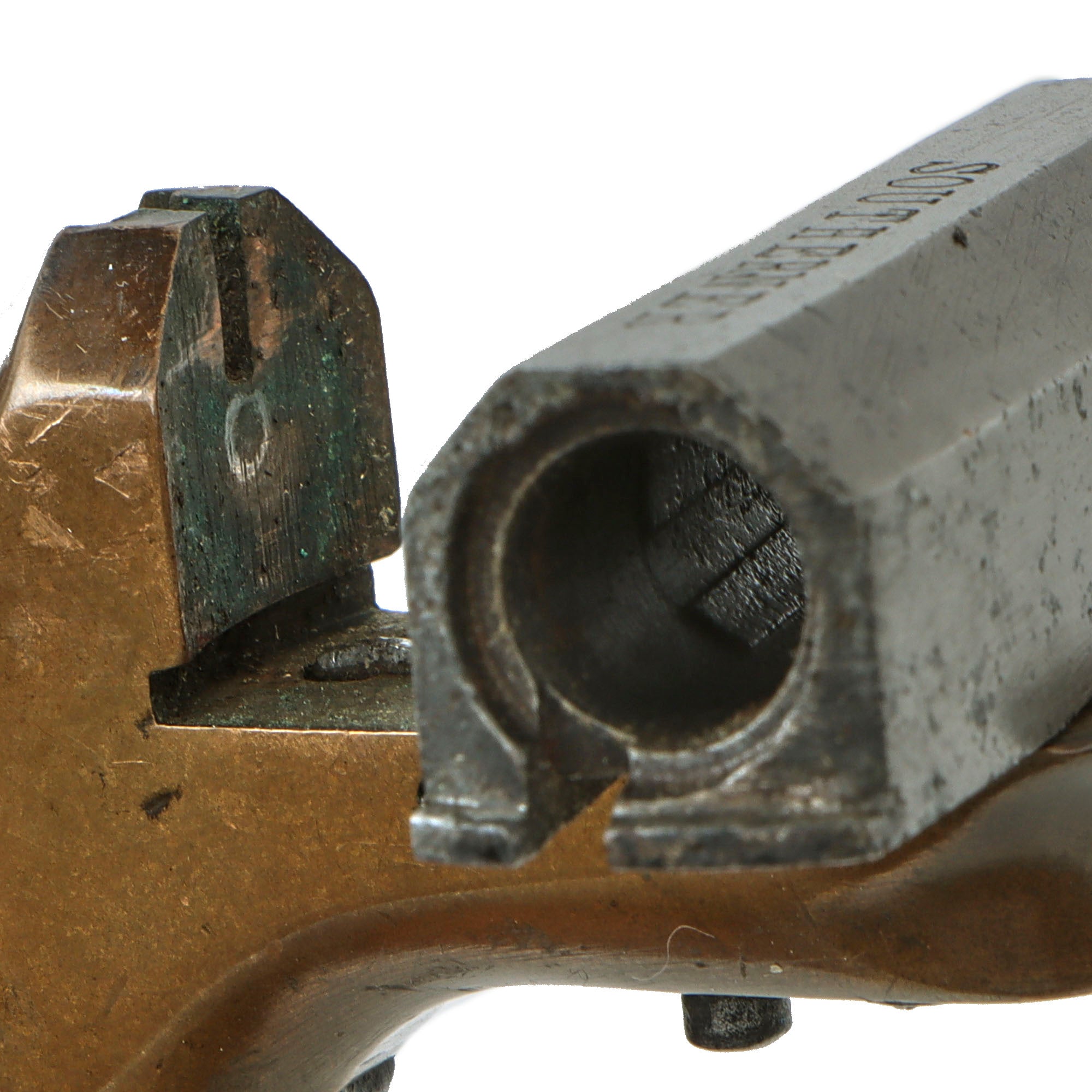This example is very good condition, showing wear from service and cleaning, which has removed the bluing on the barrel, and also removed the plating from the frame, except for under the grips. It really looks great, with a beautiful golden patina on the brass frame. The barrel looks to have seen a bit of past oxidation and peppering, and also was cut down a bit, so now it is only 2" long, and not 2 3/8". It has seen a lot of cleaning to the sides, which looks to have removed the original maker mark. The top of the barrel still bears a large SOUTHERNER marking on the top. The markings on the side of the barrel originally would have read: