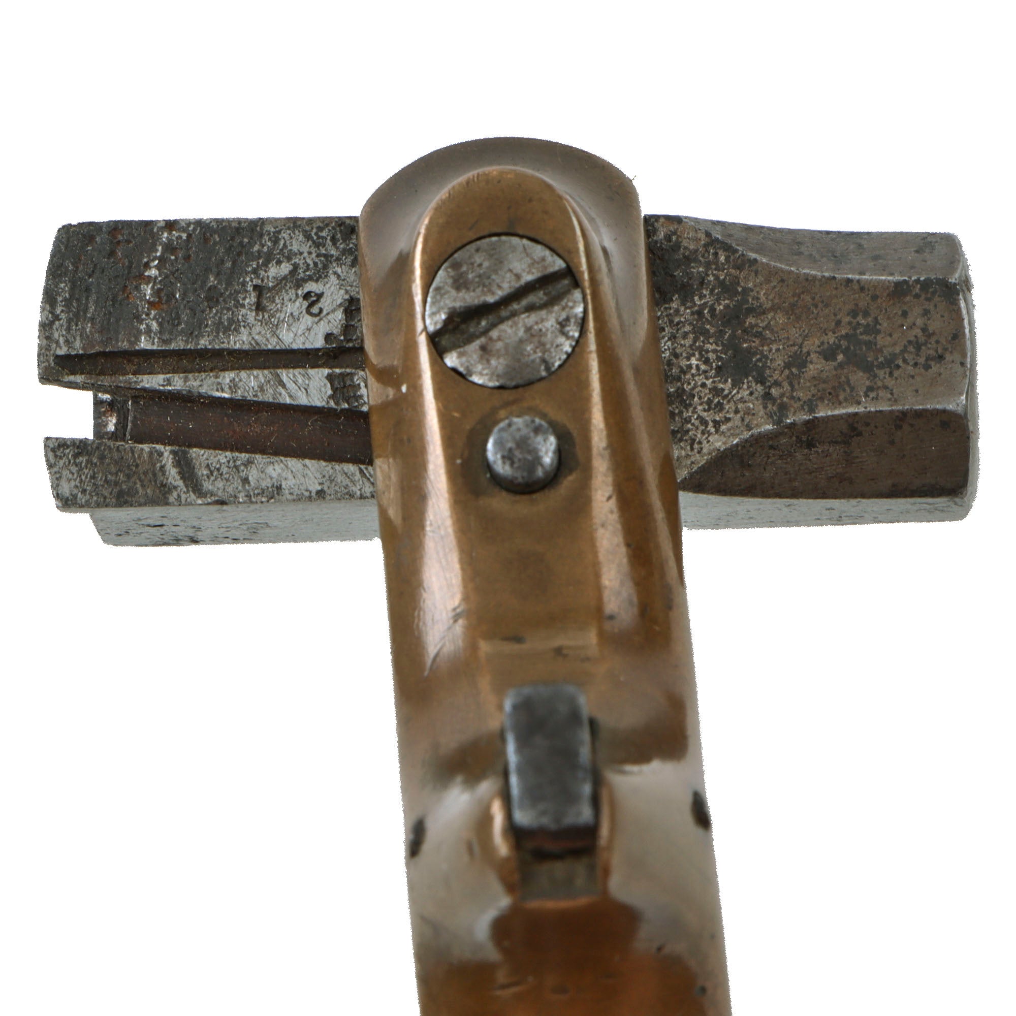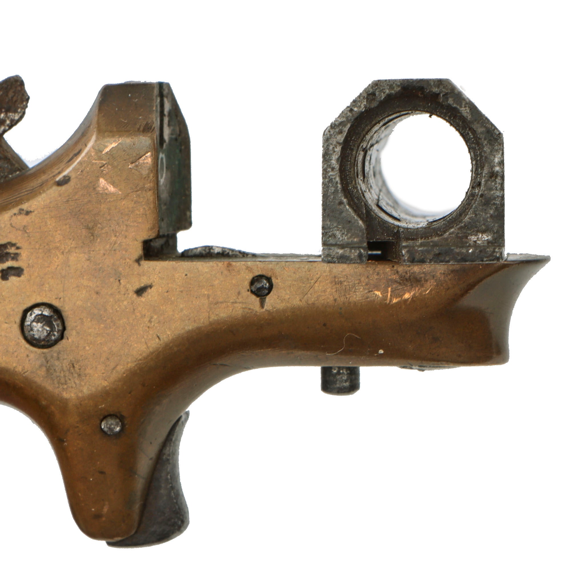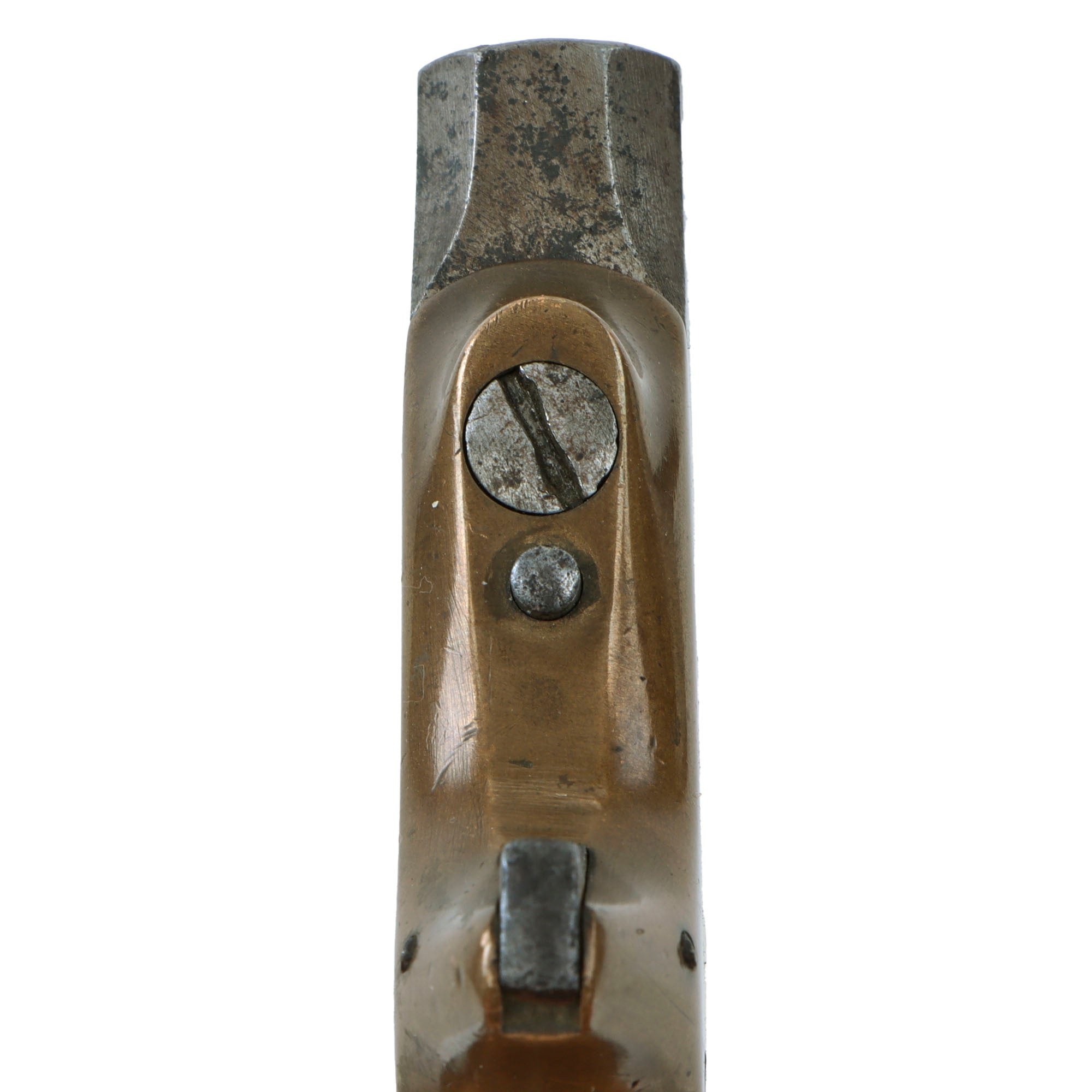This example is very good condition, showing wear from service and cleaning, which has removed the bluing on the barrel, and also removed the plating from the frame, except for under the grips. It really looks great, with a beautiful golden patina on the brass frame. The barrel looks to have seen a bit of past oxidation and peppering, and also was cut down a bit, so now it is only 2" long, and not 2 3/8". It has seen a lot of cleaning to the sides, which looks to have removed the original maker mark. The top of the barrel still bears a large SOUTHERNER marking on the top. The markings on the side of the barrel originally would have read: