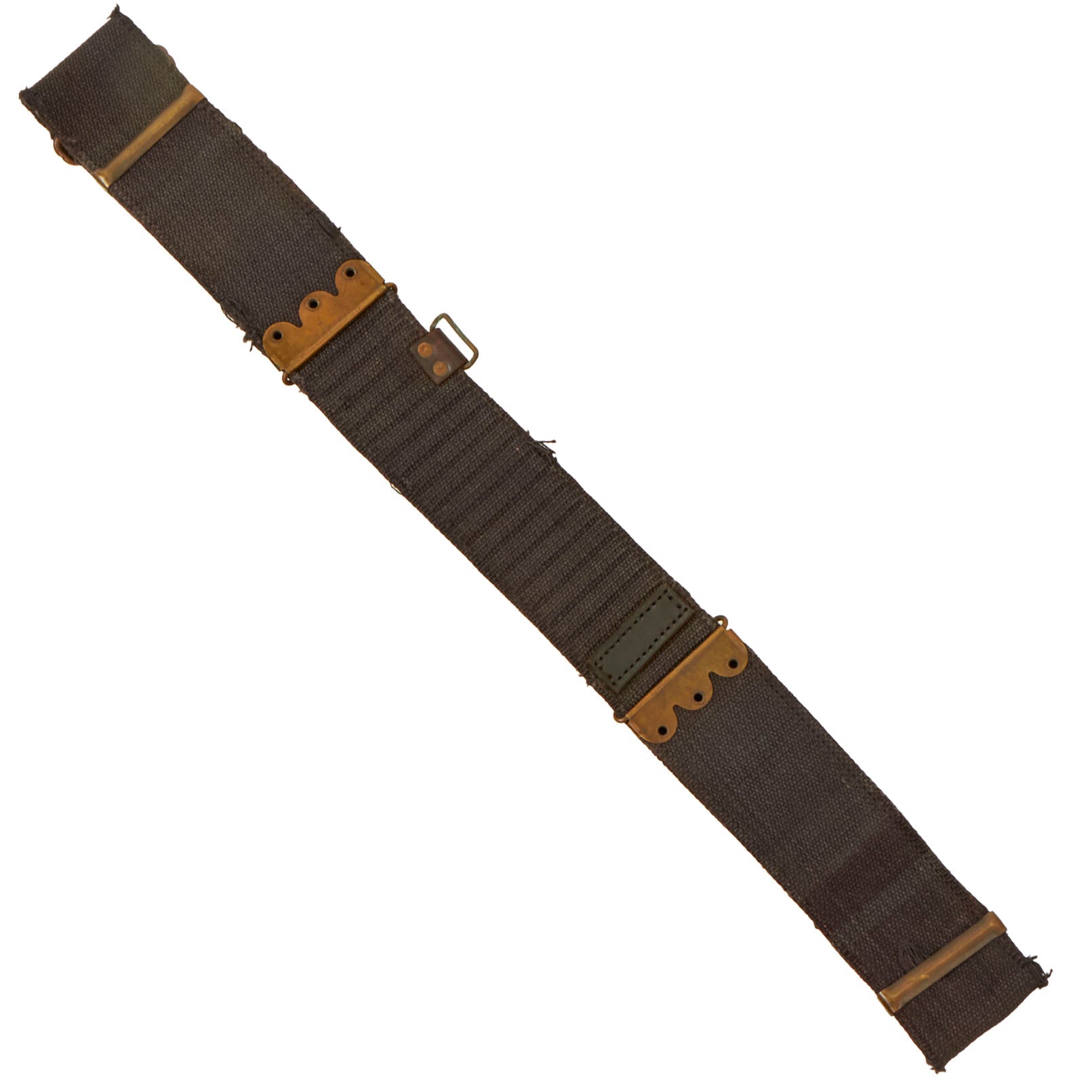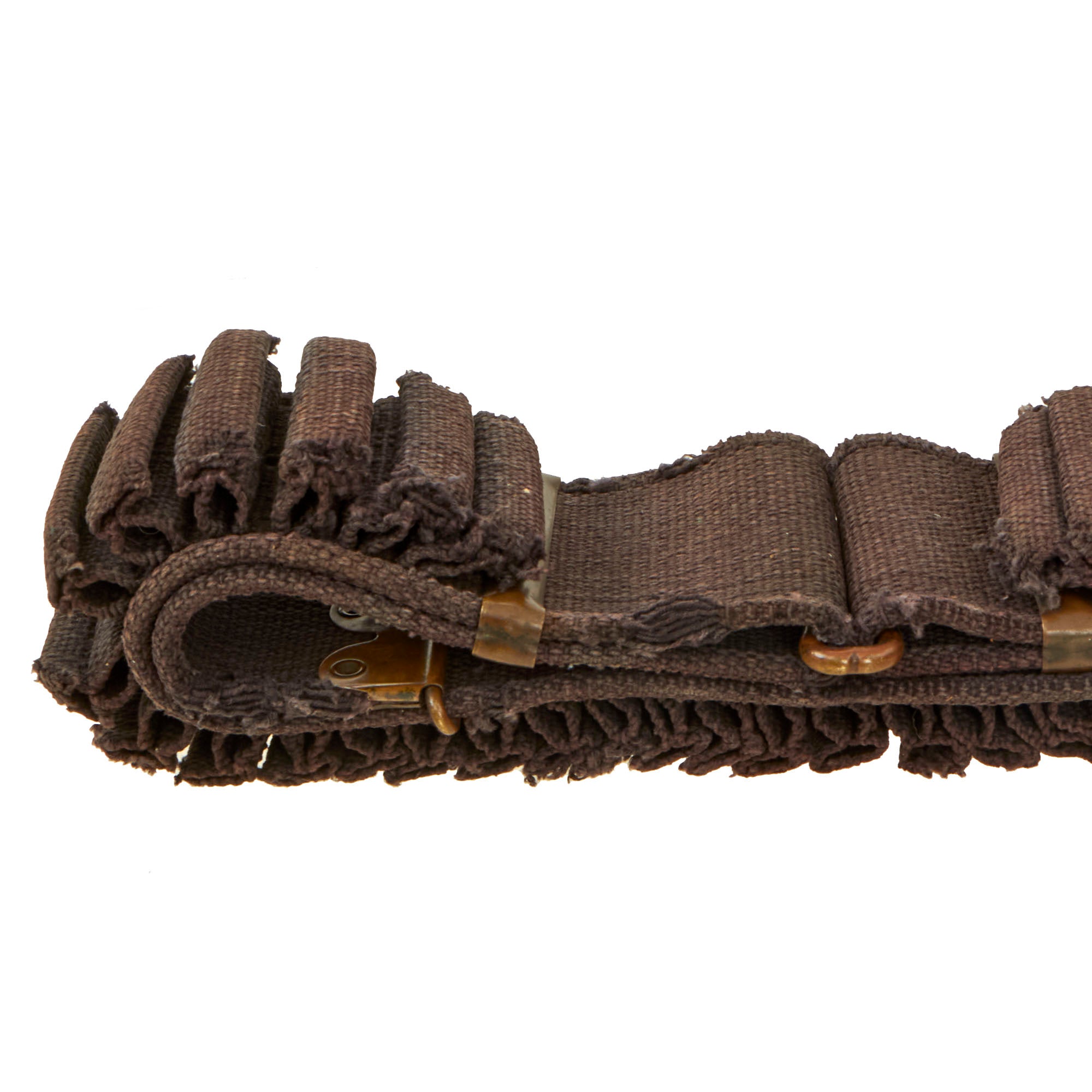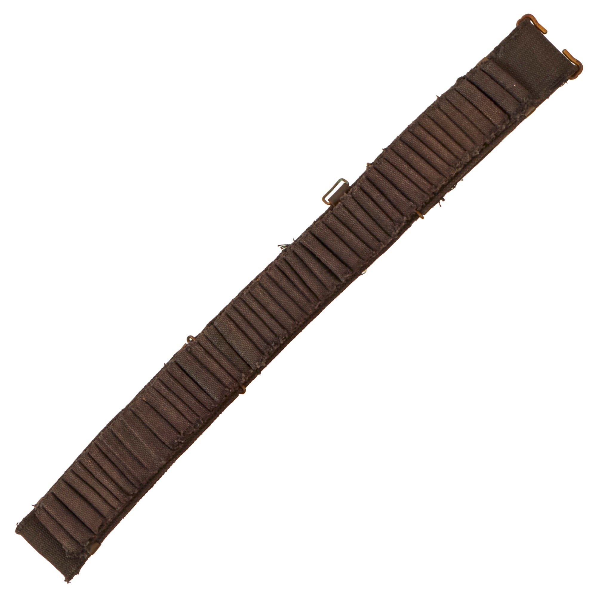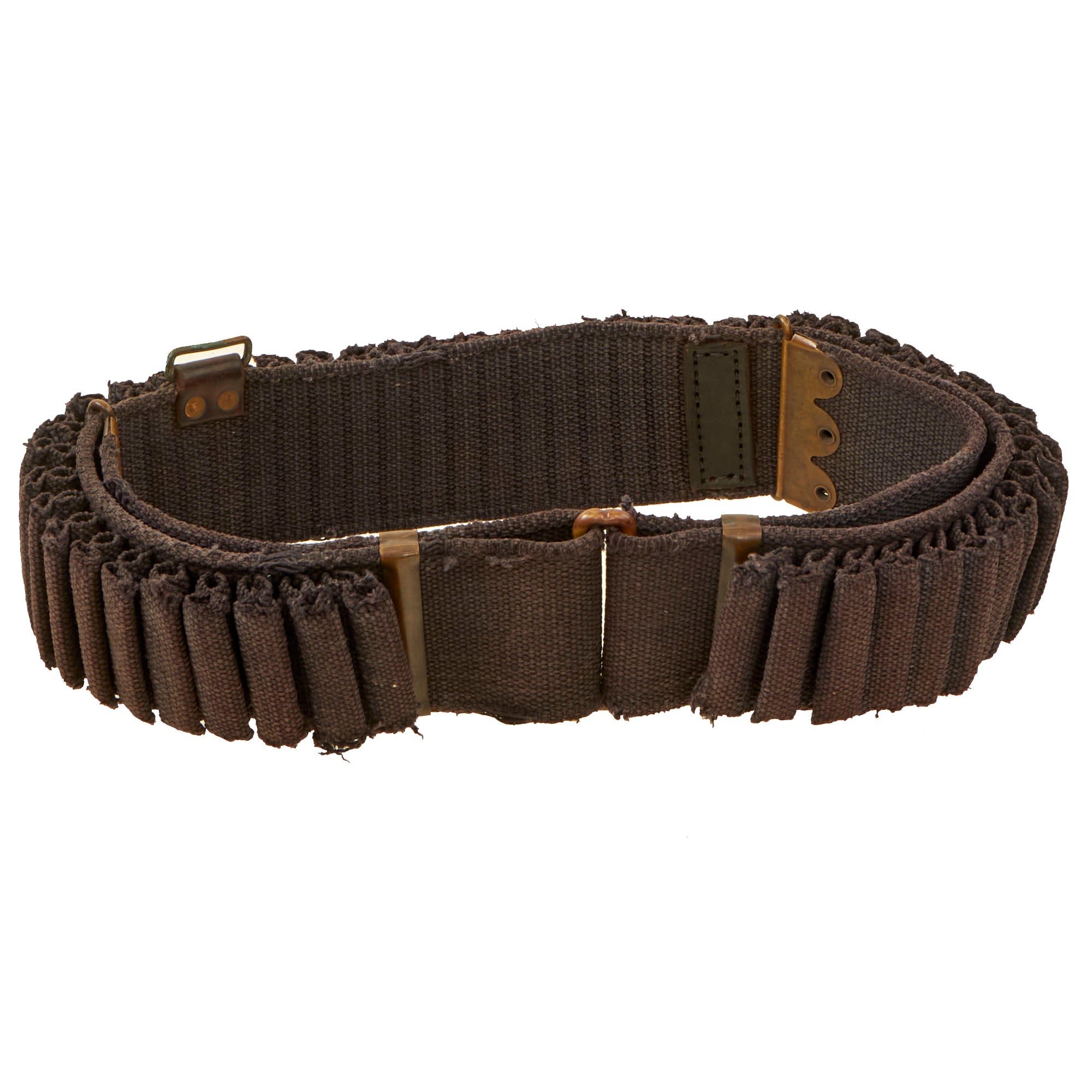 The belt is a khaki web material and double-sleeves, so it has spaces for 100 30/40 Krag cartridges. The web belt is soft and pliable and in fine condition, but several loops show very heavy wear, and there appears to be a modern repair to a break in the belt, with a piece of leather attached for reinforcement. This belt also has a saber loop, something we don’t often see on these!