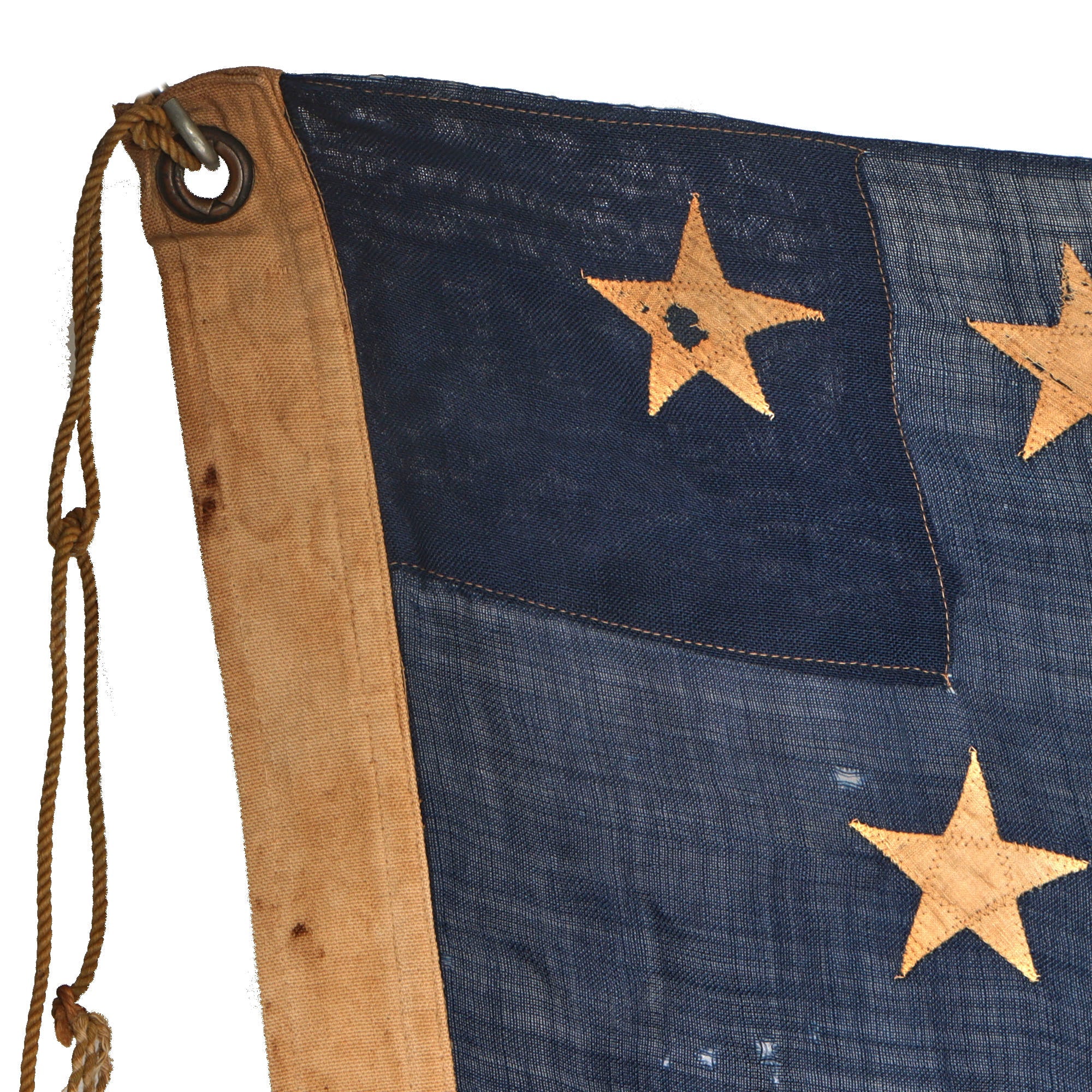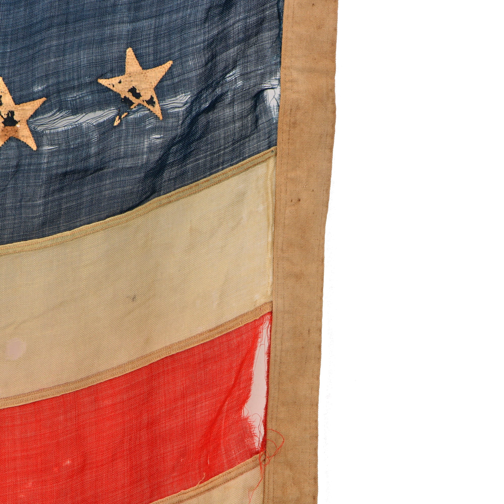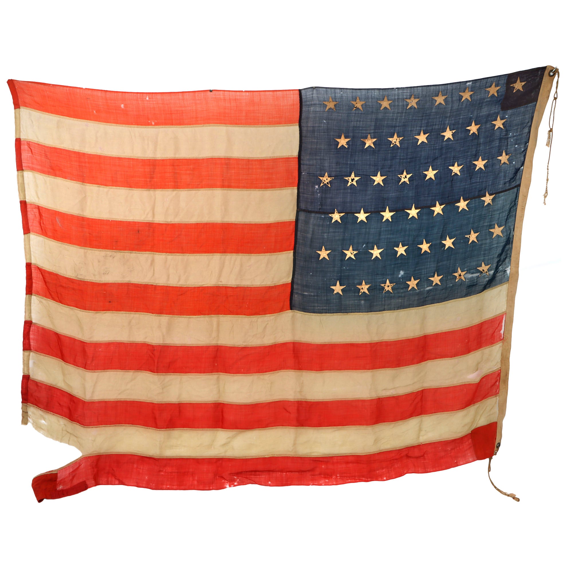 • Original Item: Only One Available. This is a very nice but well-worn Spanish American War 45 Star American Flag, in a nice displayable roughly 59” x 78” size. This design of the flag was in use from July 4, 1896 to July 3, 1908, when Oklahoma was officially made part of the country. The flag body is of multi-piece wool construction, with the canvas stars sewn on, with a white canvas header that is missing one of the grommets. There is some material loss at several points on the flag, with a large tear near the end, and this example would look best framed.