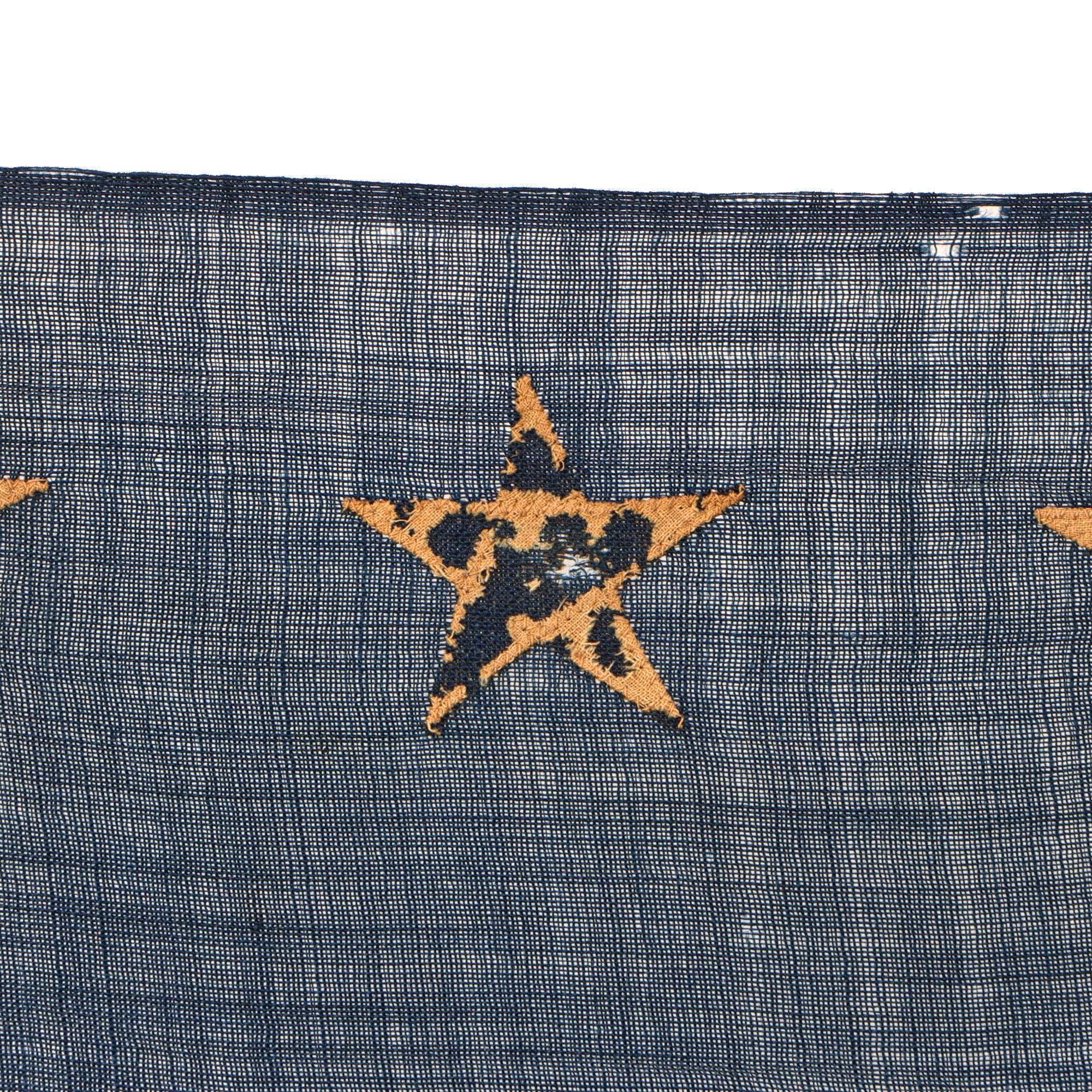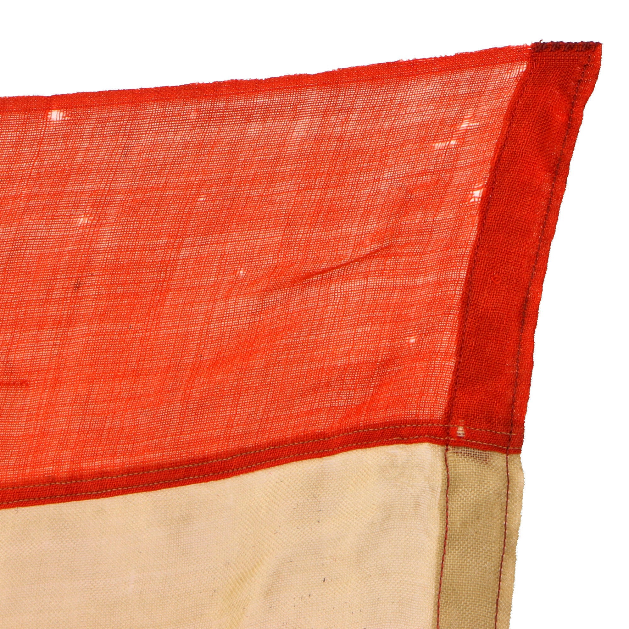 The flag is in fair condition considering that it is over 100 years old, but has some serious condition issues. Time and wear have led to fraying and holes in the wool body, and the colors have heavily faded over time as well. There are no maker-marks on the header, but there is a hand-written name, “I. Wittman”. There are ropes still tied through each grommet.