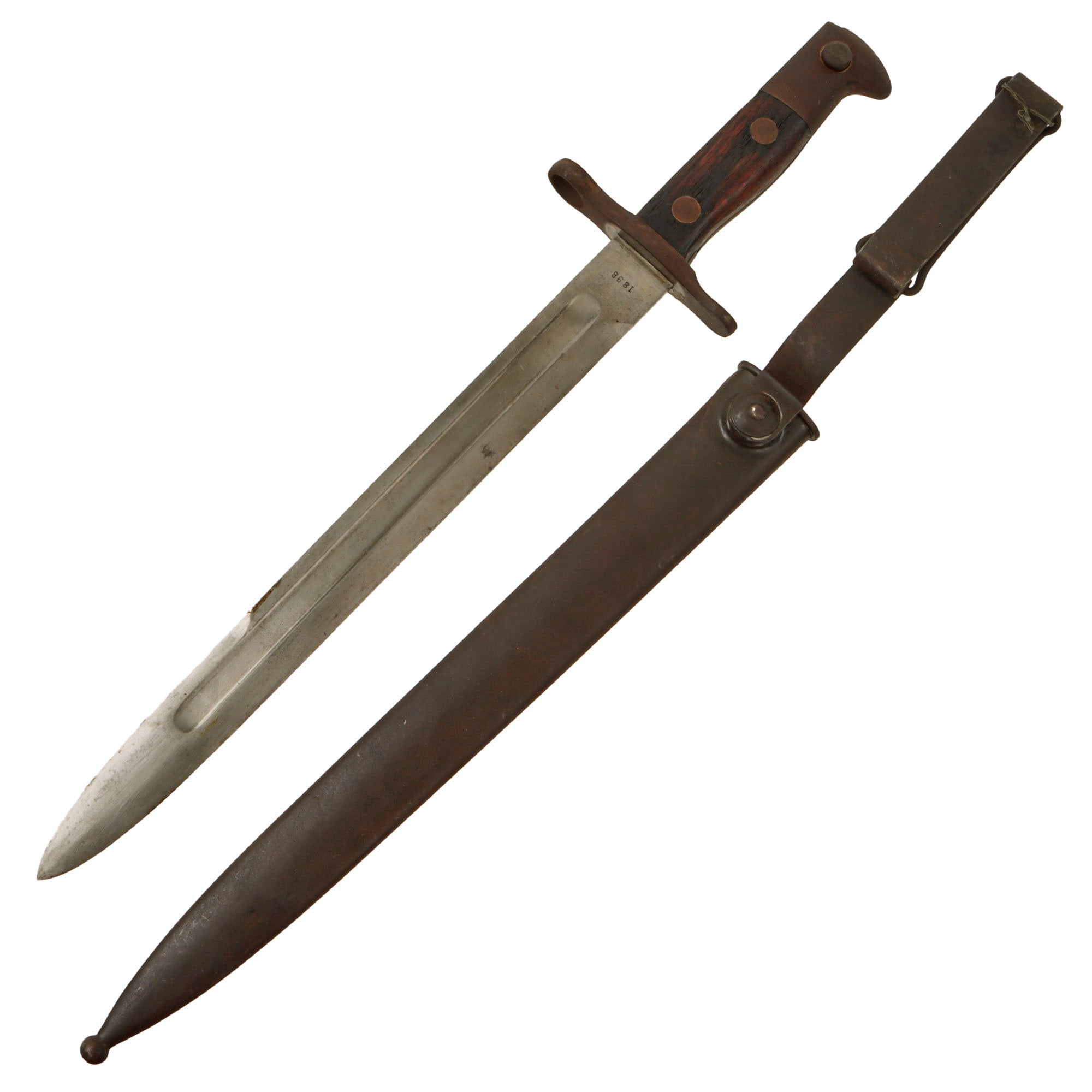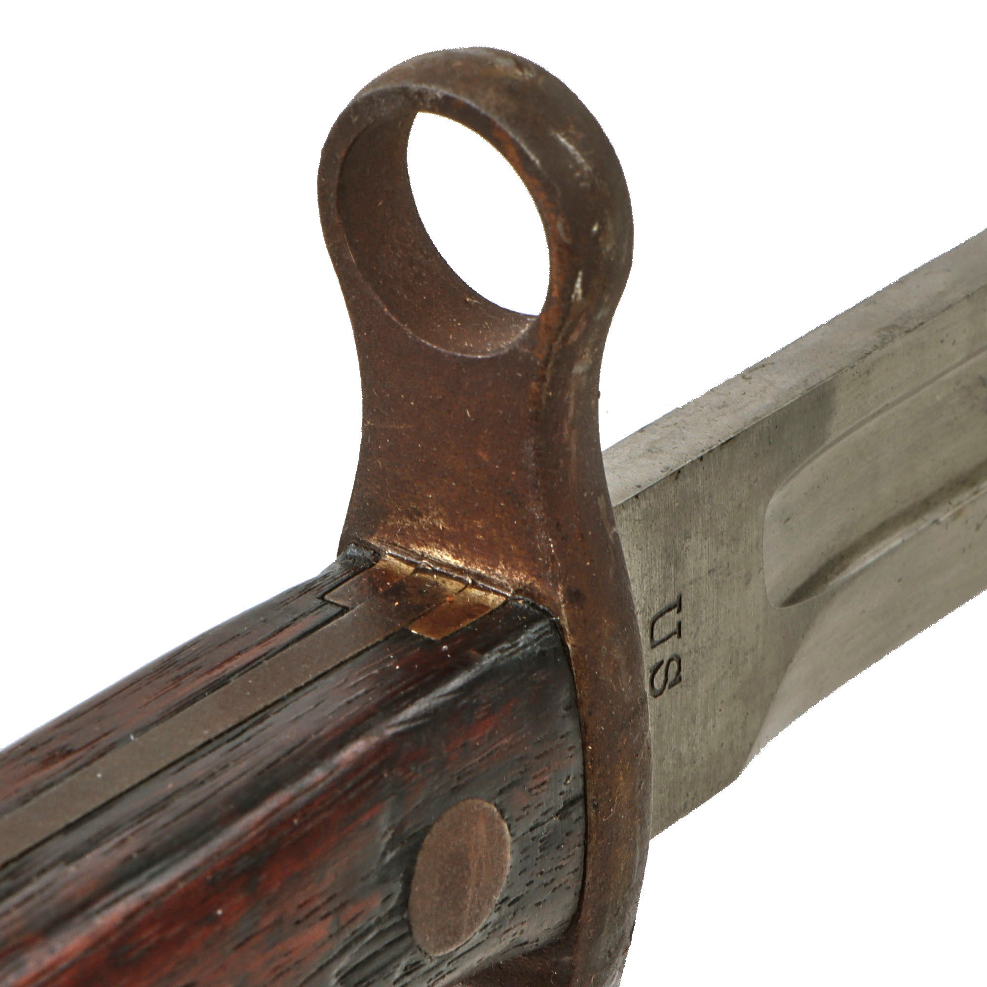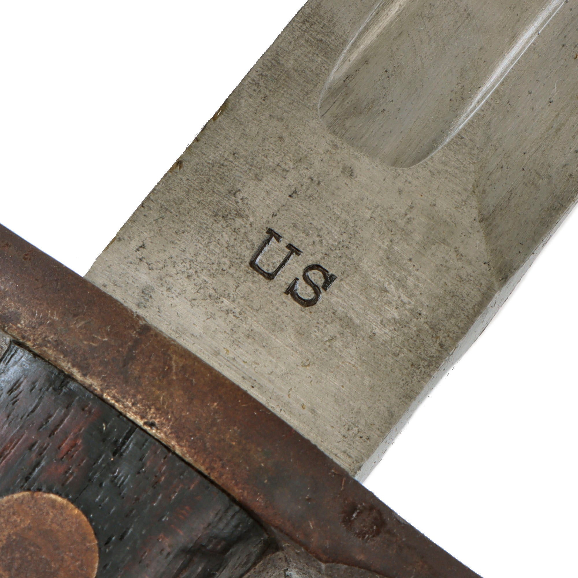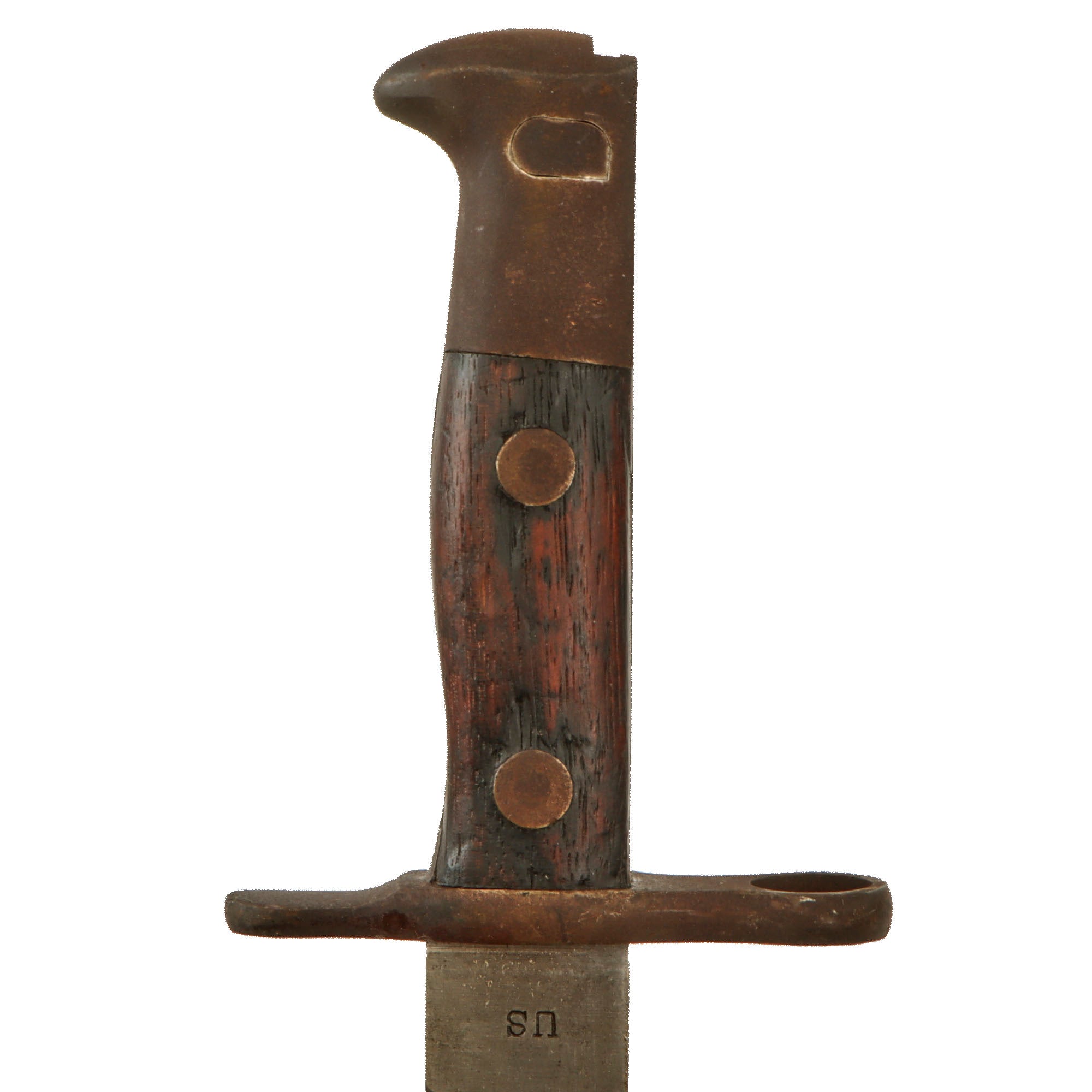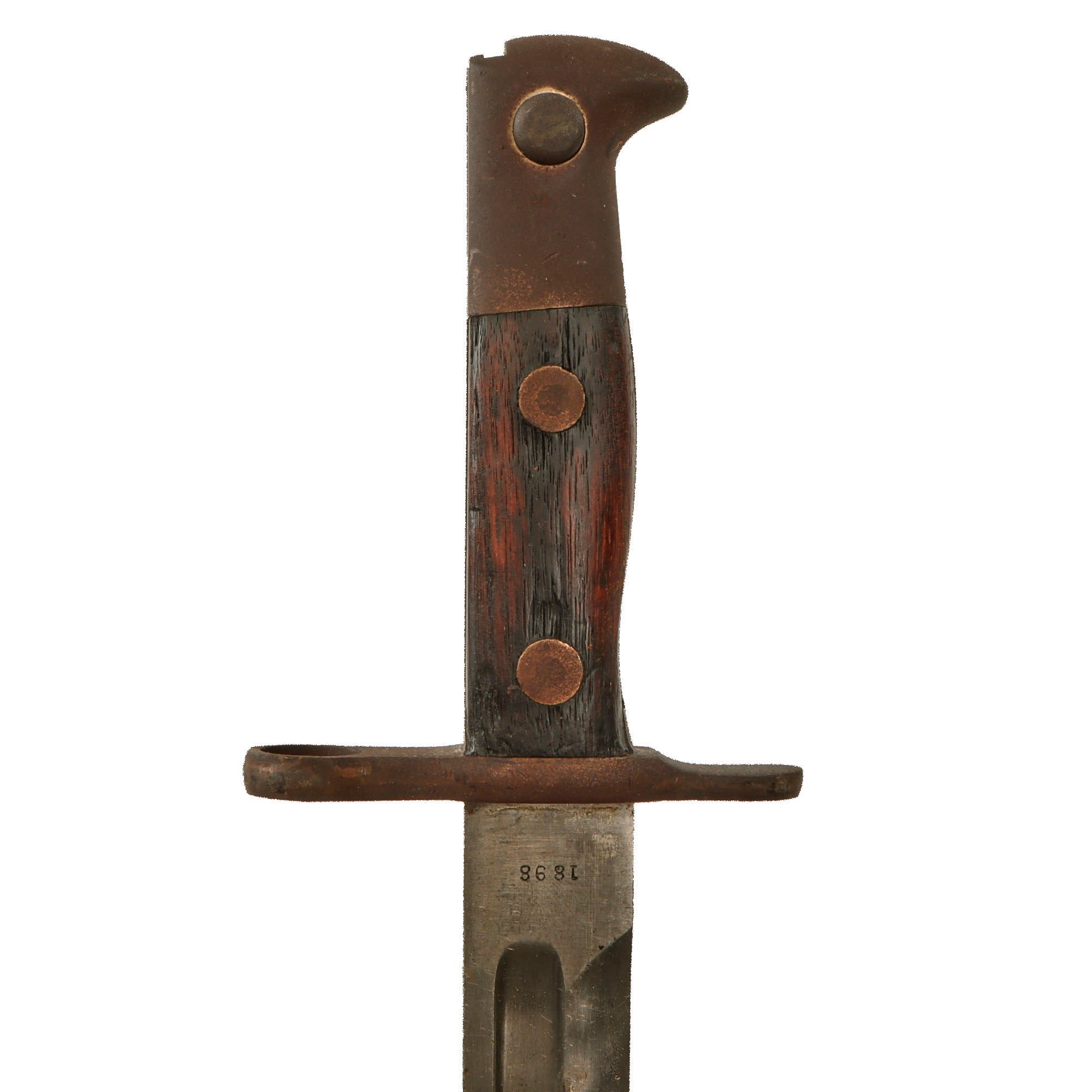 Original Item: Only One Available. This is a Spanish-American War dated U.S. M1892 bayonet, made for the Springfield Model 1892–99 Krag-Jørgensen rifles, some of which were still in use during WWI. It is fitted with its original all steel scabbard with a swivel belt loop on the back. These are not often seen on today's market, especially with the scabbard included and fully intact.