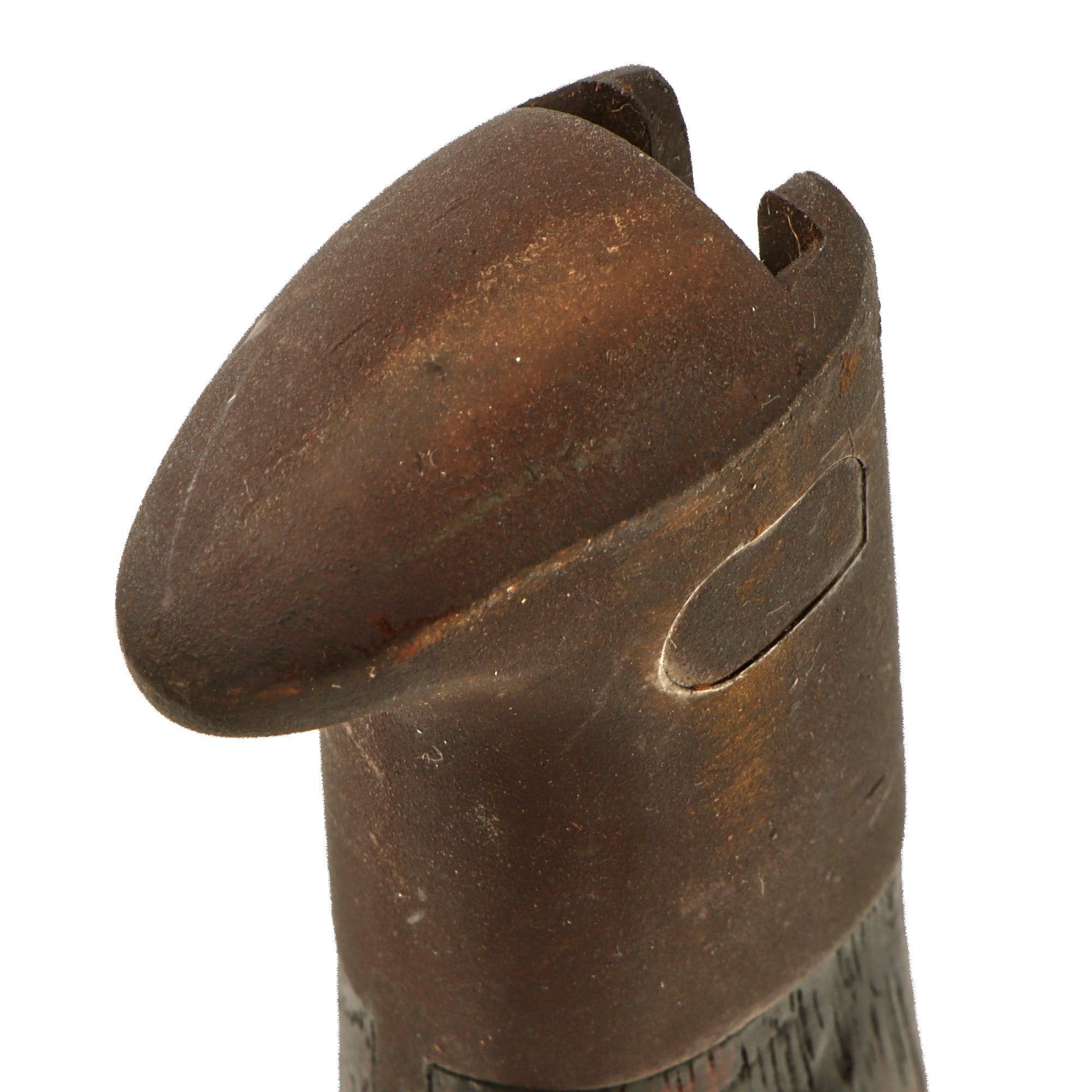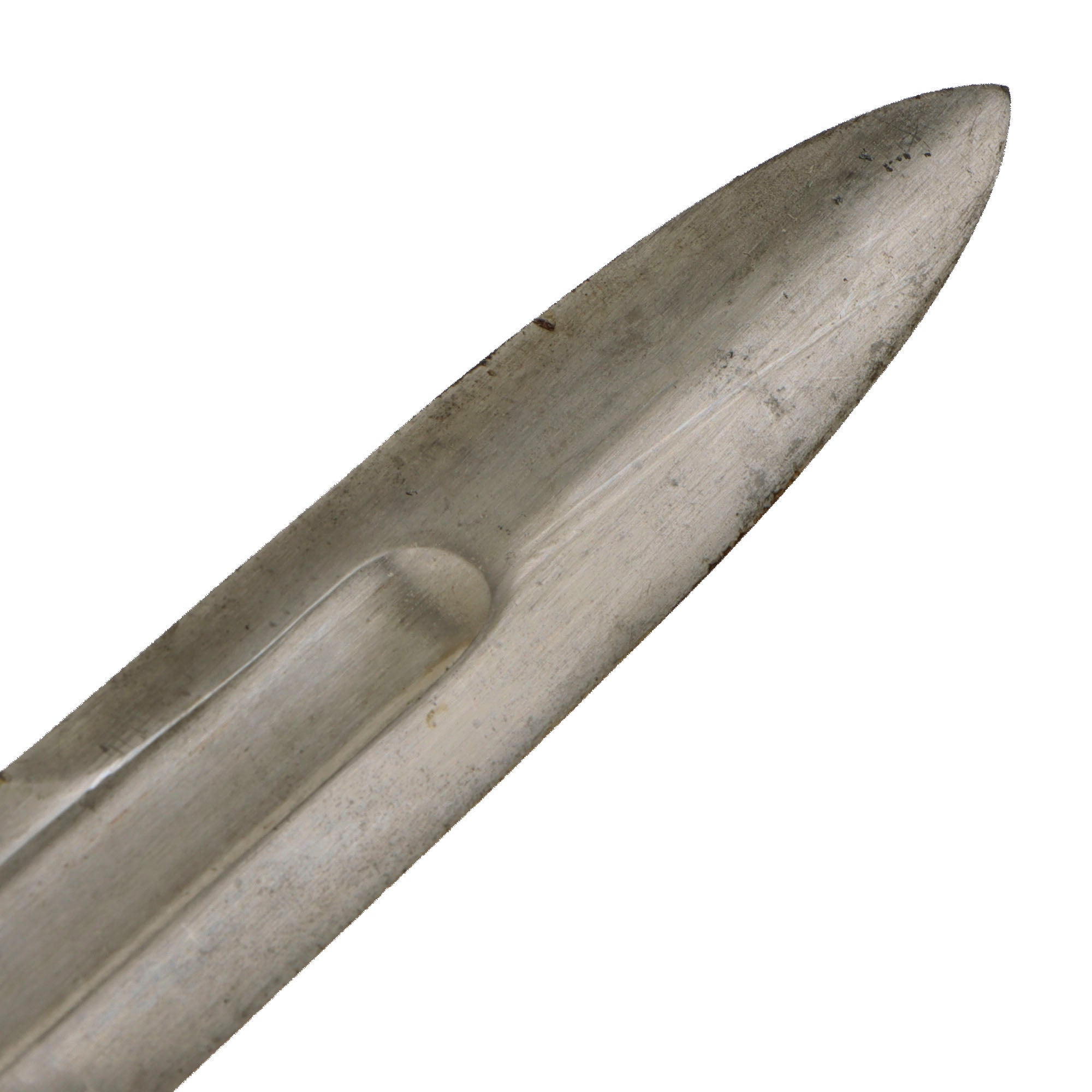 The blade shows wear but there is no major oxidation or other serious wear. The blade is marked 1898 on one side and US on the reverse. The wooden grips of the handle show some scuffs and scratches on both sides as shown. The scabbard is still in good working condition with very light pitting. The bayonet catch is still fully functional, as well as the swivel on the scabbard, but the swivel has become a bit loose from heavy use.
