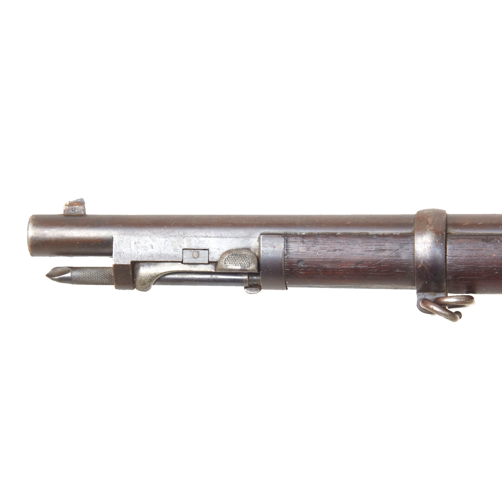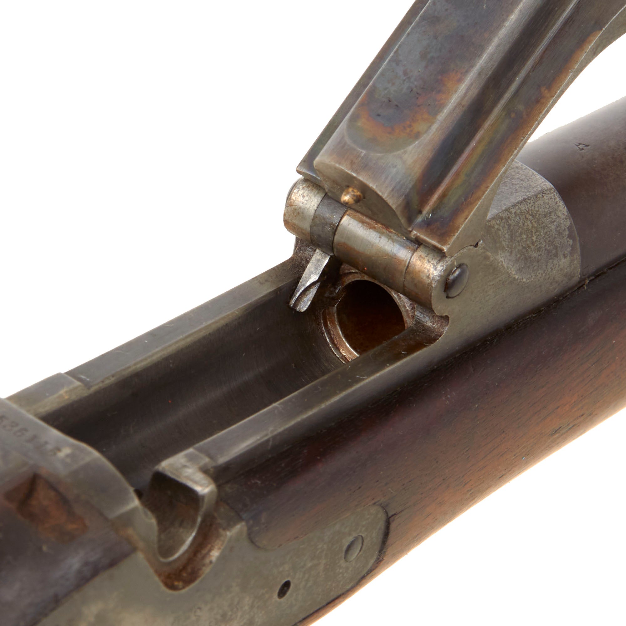 The bore is in excellent condition, showing a bright finish with crisp lands and grooves. There is just a bit of wear to the lands and a bit of evidence of past fouling, meaning it saw service but was well cared for, being cleaned to remove corrosive residue after use. We would probably rate this a 9 out of 10. The lock is fully functional, holding at half cock and firing at full. The breech block opens correctly, locking closed when shut, and the cartridge extractor and ejector are present and fully functional, however we cannot guarantee they will work on actual brass. The cleaning rod / bayonet is functional, with a worn finish and intact threads on the end, and the locking mechanism by the muzzle is fully functional.