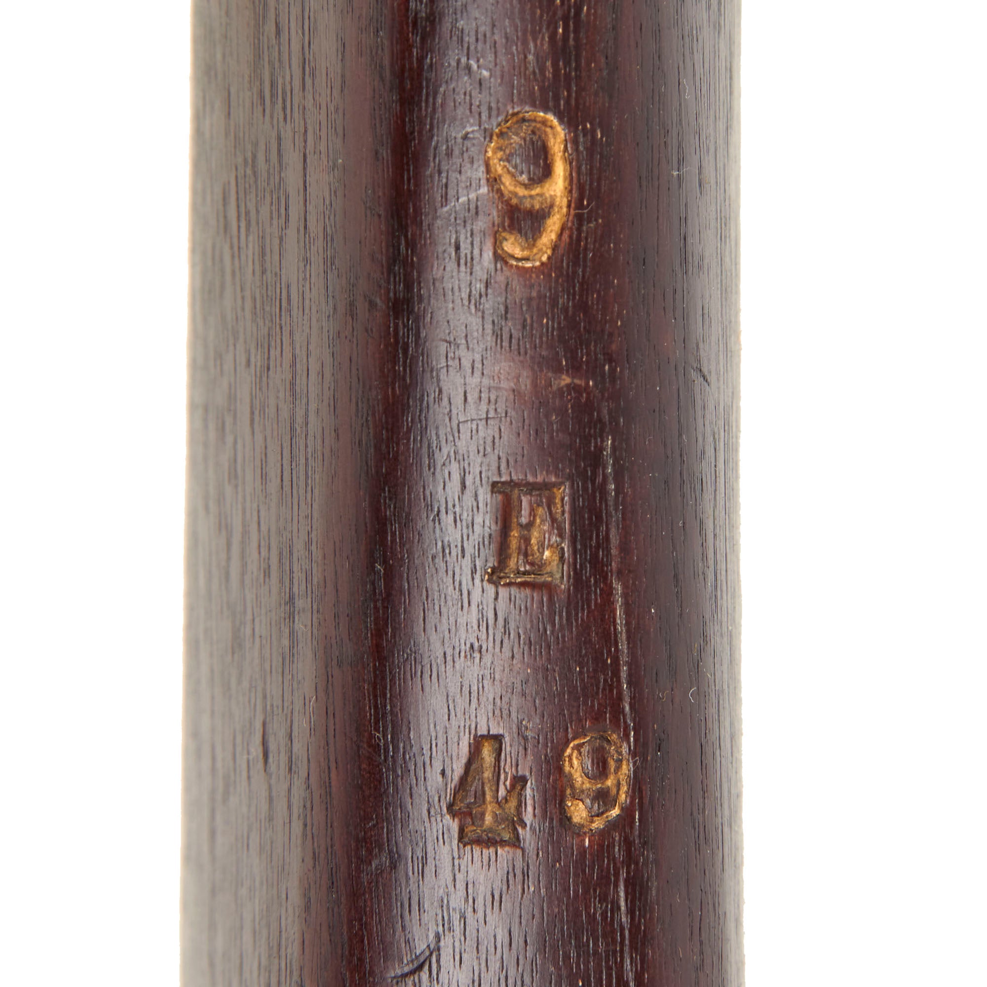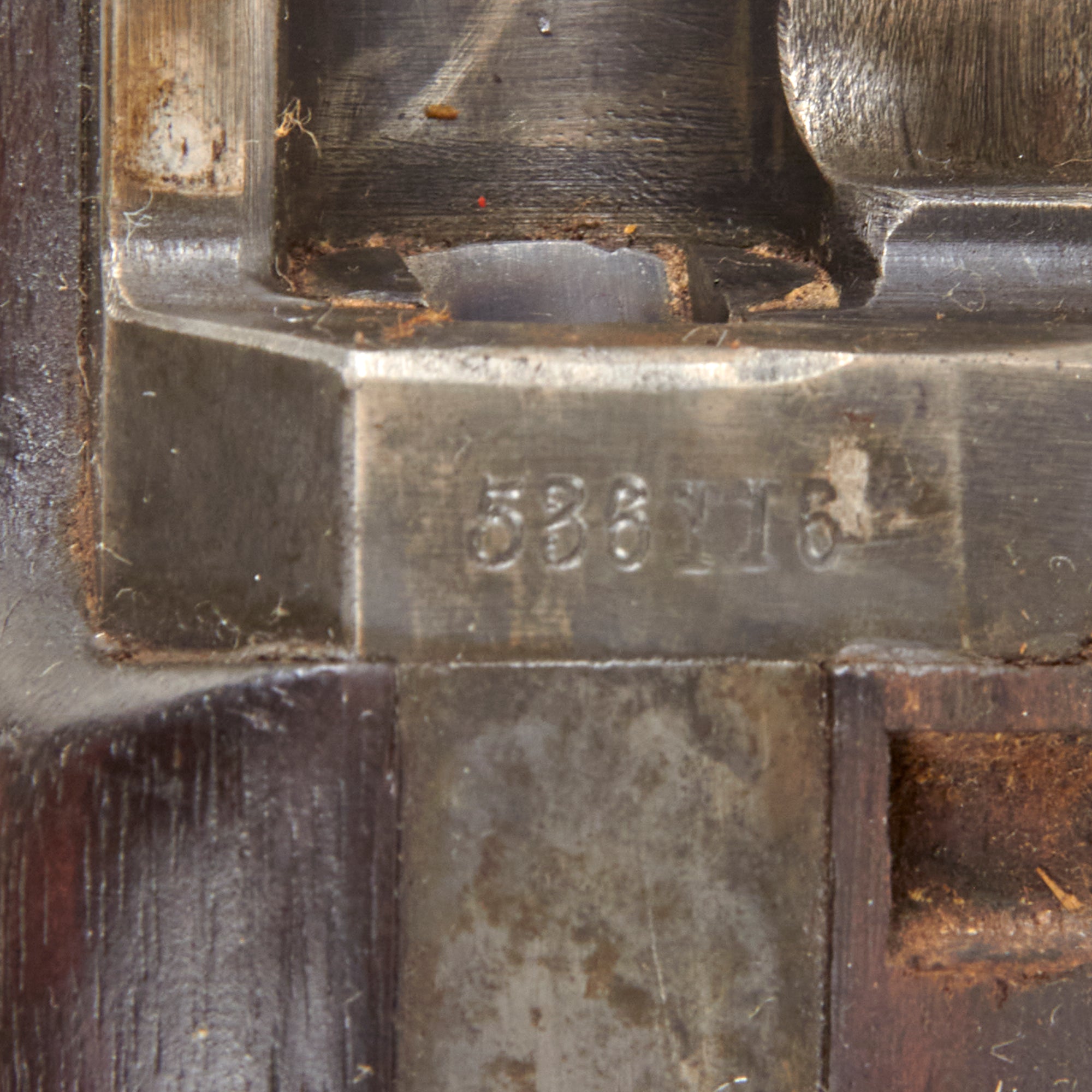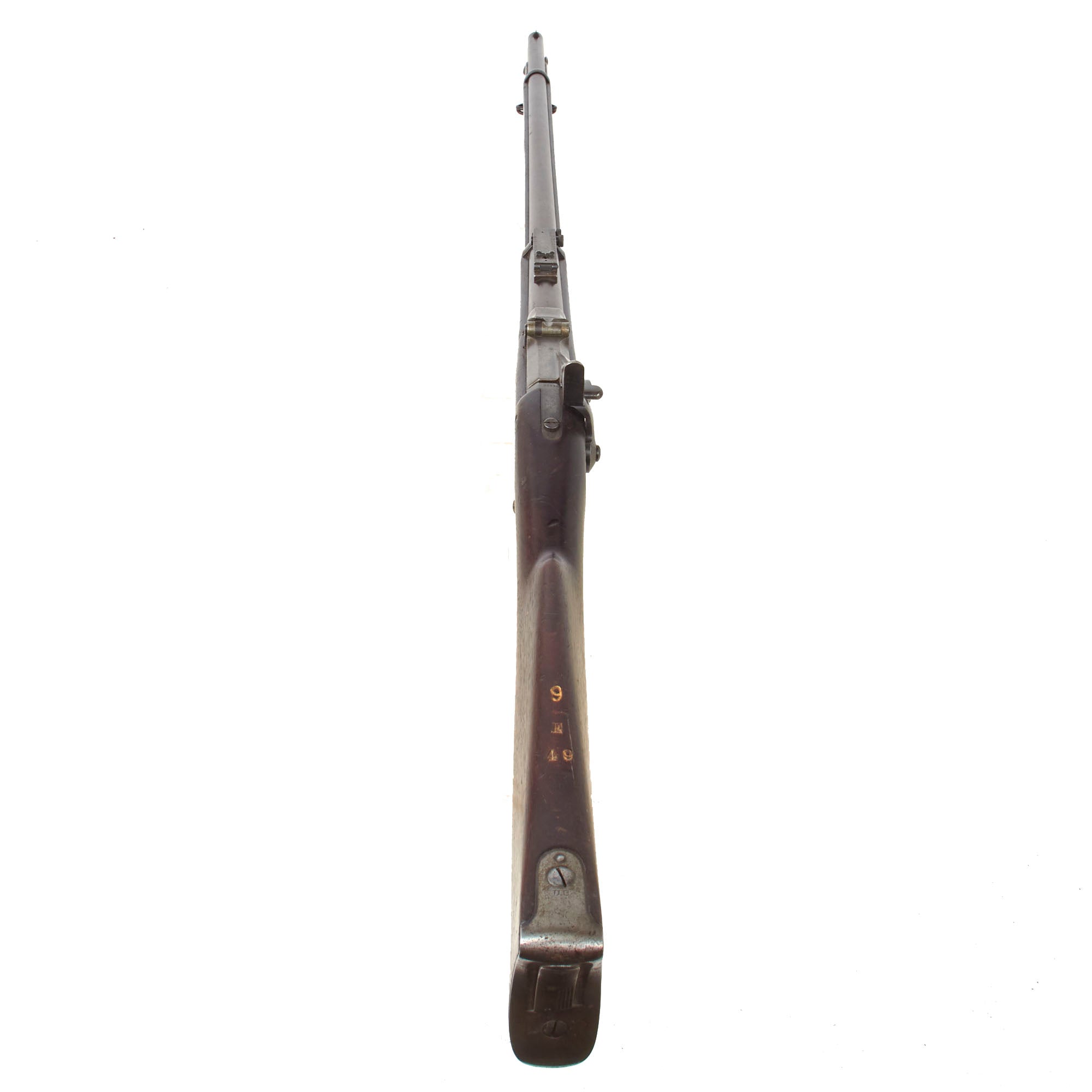 The stock is in very good service used condition, and is still FULLY proud over the lock plate, indicating that it has not been arsenal reconditioned over the years. It displays the lovely red-brown color of aged and oiled walnut, only achieved after decades, and shows some lovely grain. There is wear to the surface, including numerous small scratches, dents, dings, and the like, but no major damage, and there is also unit number 9 stamped on the left side, with 9 / E / 49 on the spine. Another nice feature on this example is the butt stock tool compartment, which is covered by a rotating door on the butt plate. This was used to store the take down tool and stuck cartridge extractor. Unfortunately this compartment is empty, as we often see.