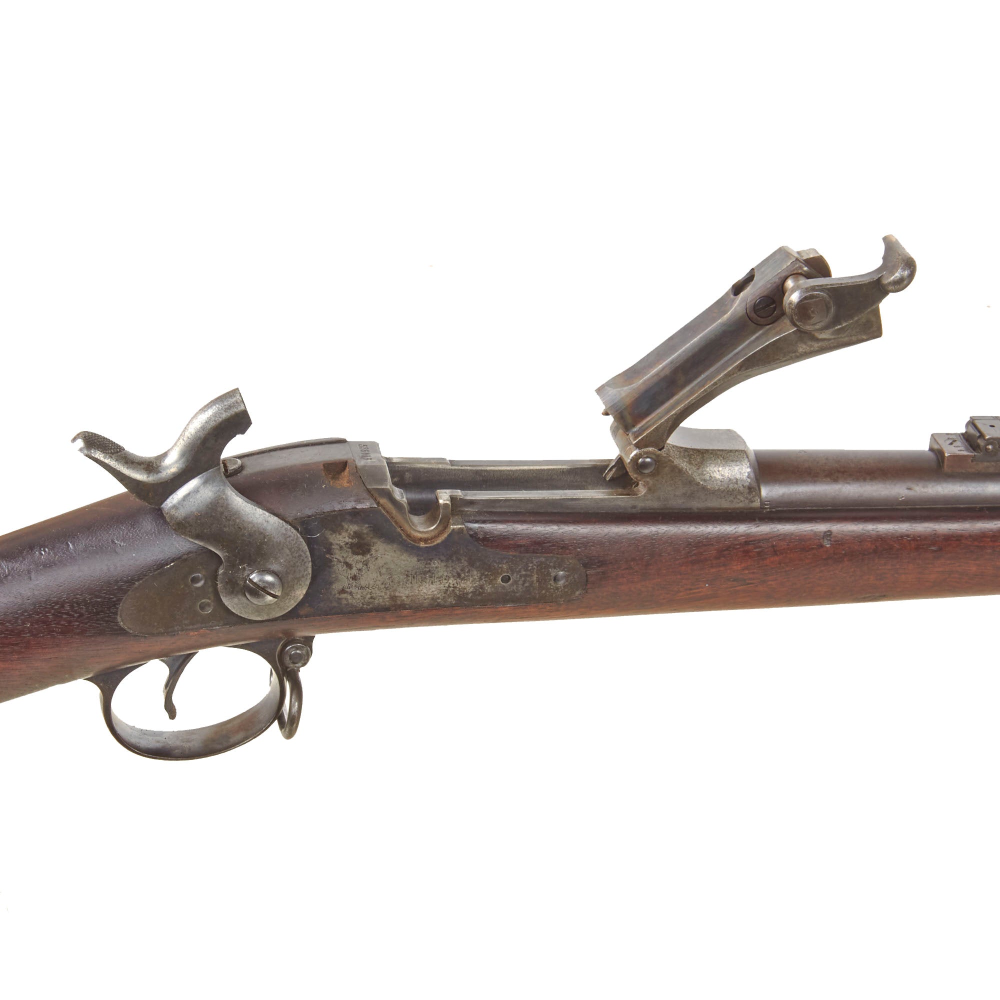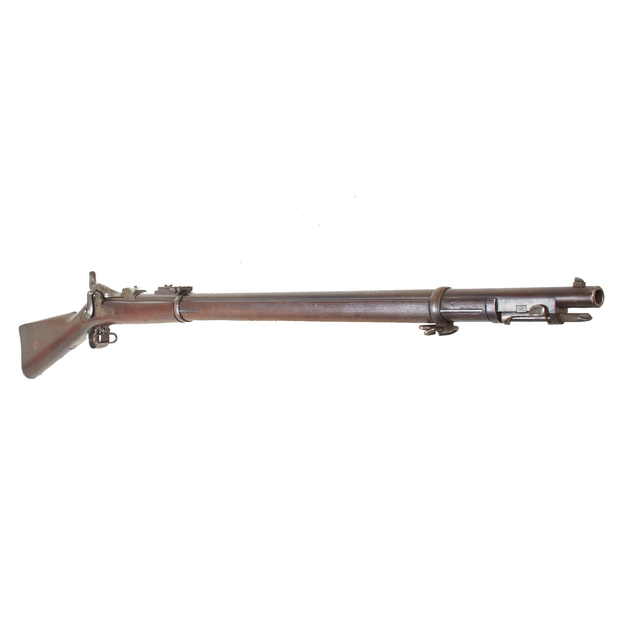 The both barrel bands are U marked, and the butt plate tang is marked with the correct U.S. stamp. Center fire breechloader, .45 cal., two bands, two sling swivels with stacking swivel, Buffington sight, sliding ramrod bayonet. Lock is marked with an eagle and U.S. / SPRINGFIELD, manufactured at the United States Armory and Arsenal at Springfield, in Springfield, Massachusetts. The Buffington rear sight is present and intact, with fully functional windage and range adjustments.