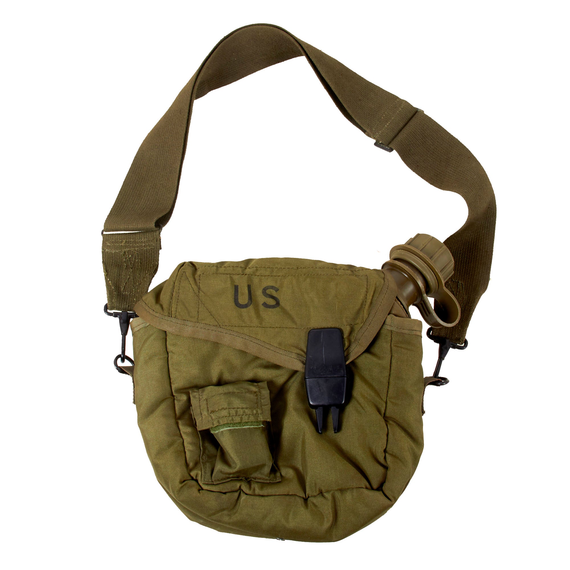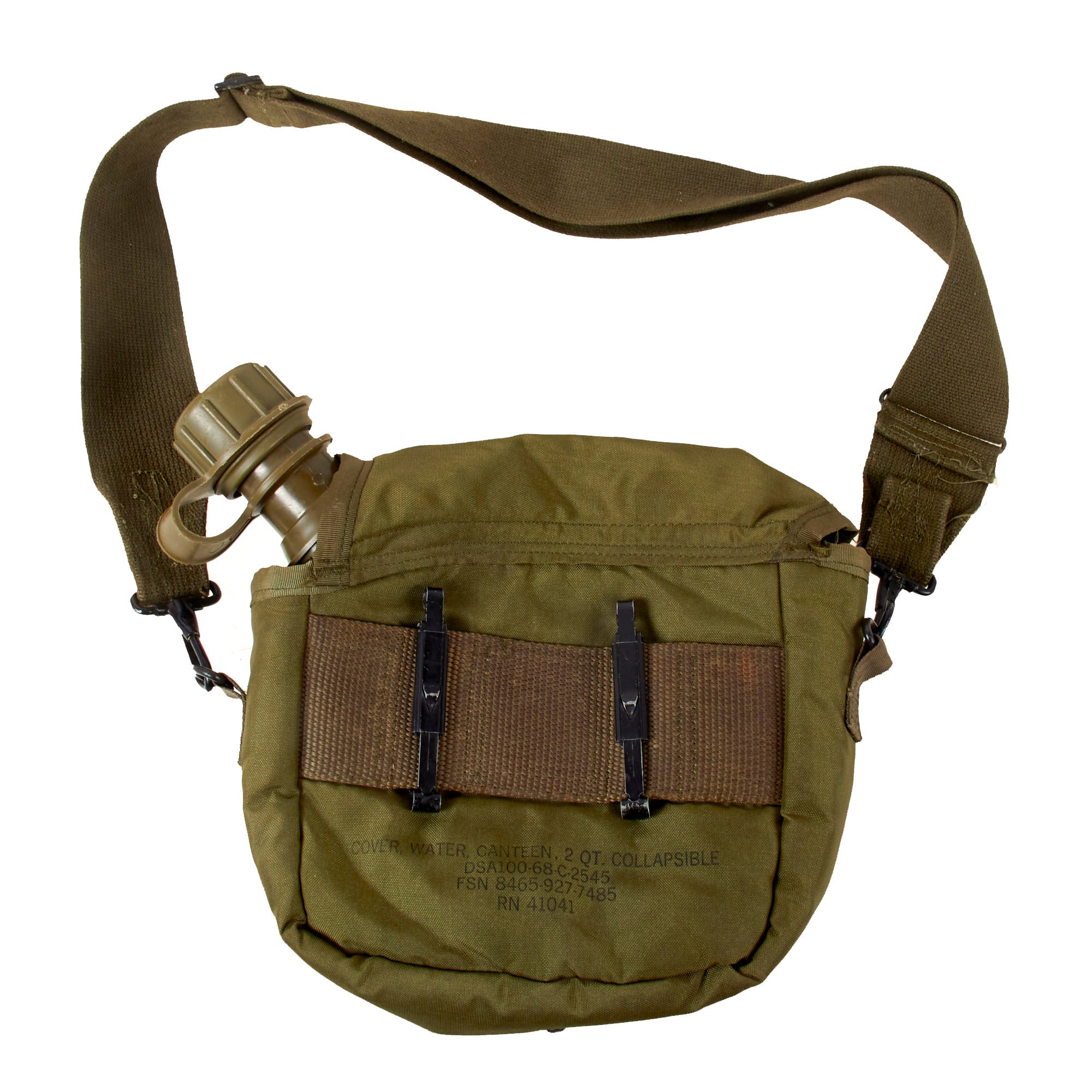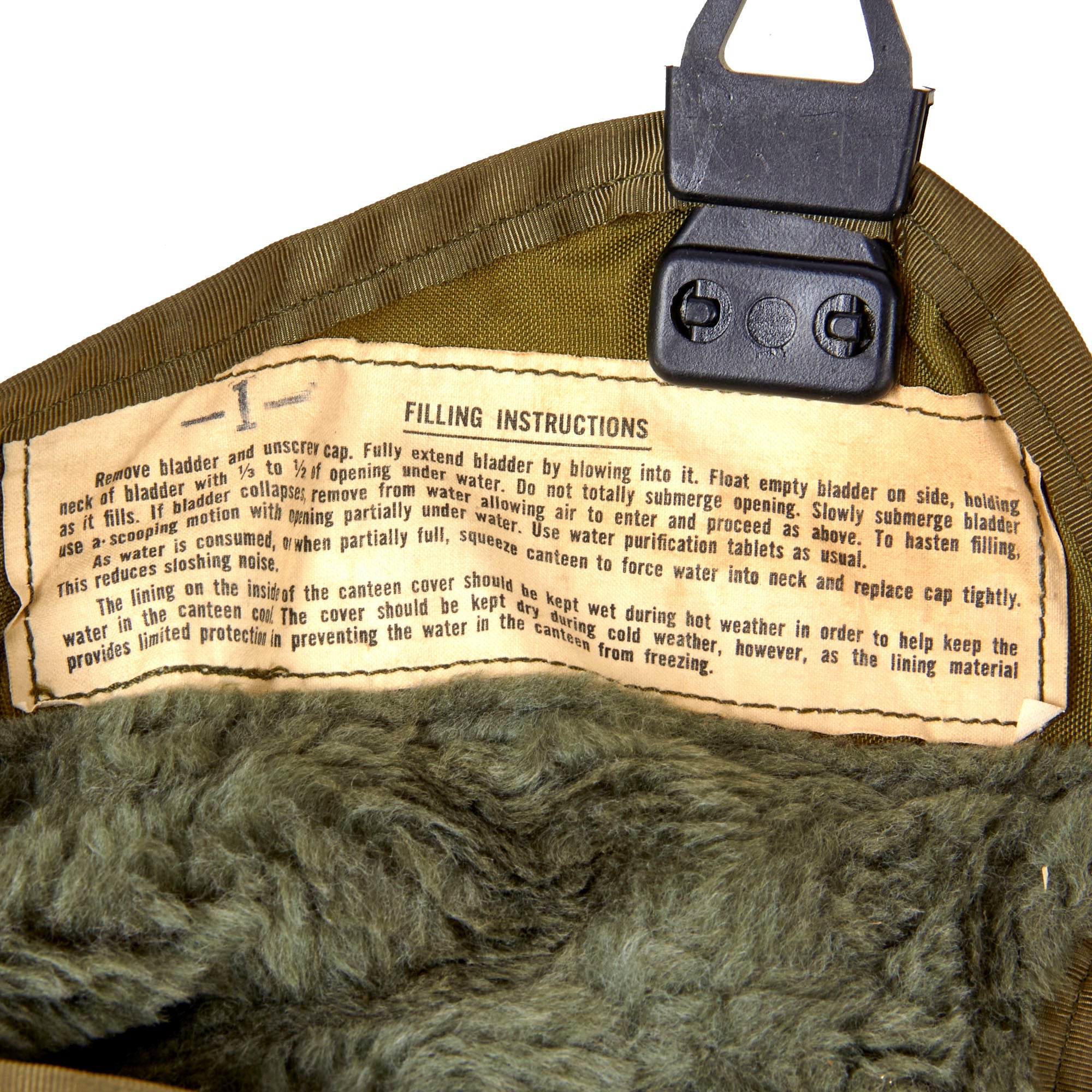 • Original Item. Only One Available. The 1967 design 2-quart canteen was originally issued with an unlined rubberized cover that had a plastic latch fastener closure and a pocket for water purification tablets. It could be attached to the pistol belt via two slide keepers on the back or carried by its detachable shoulder strap.