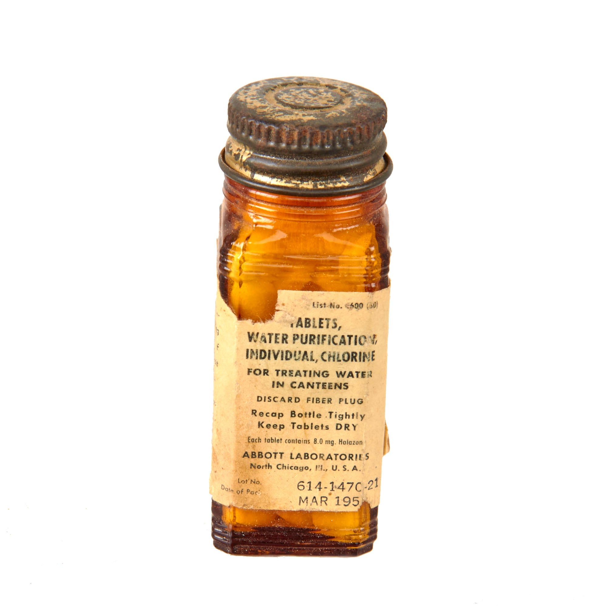 Wartime examples of this model are very difficult to find, and this set is excellent. The bag retains its fur lining and the filling instruction label. The carrying strap is well-retained and without fraying. The small pocket for the water purification tablets still contains a 1950’s dated bottle which is still full! Outstanding in every regard.