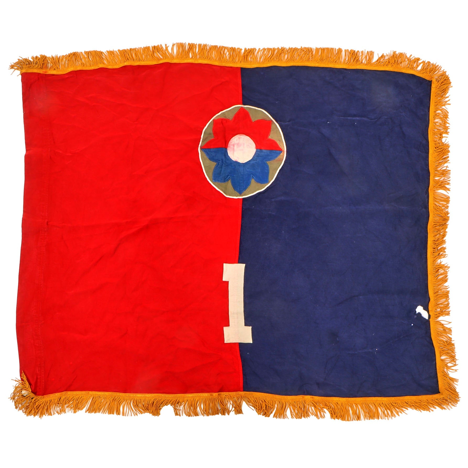 This is an outstandingly-scarce flag depicting the insignia of the 9th Infantry Division, on a blue and red field over the number 1. There is a quartermaster tag in the header reading: