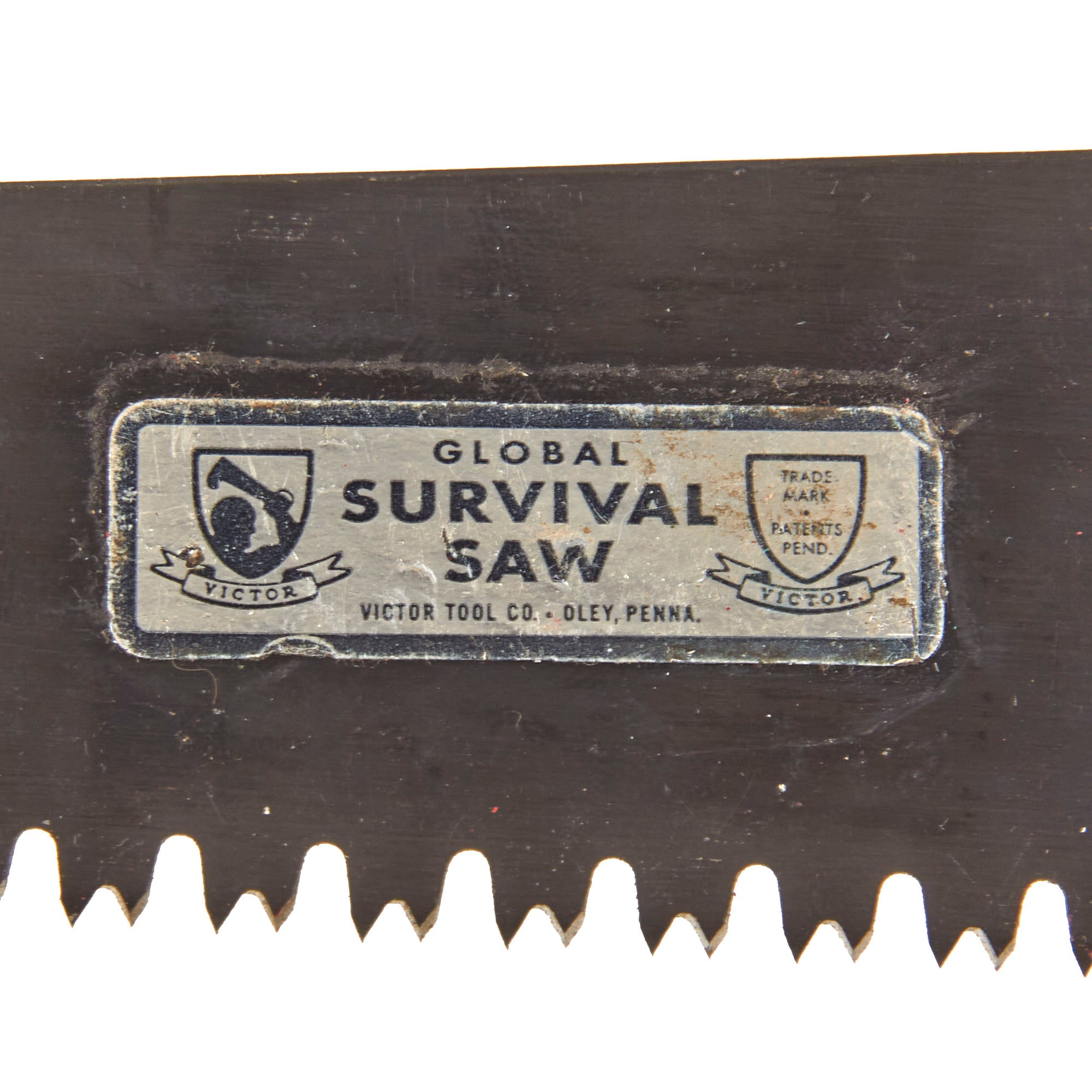 The set consists of the saw handle marked SNOW KNIFE / GLOBAL SURVIVAL SAW and THE VICTORY TOOL CO. OLEY, PA / USA PAT. 174537., the sawblade, the finer sawblade, and another piece that fits in sideways with a long vertical blade edge.