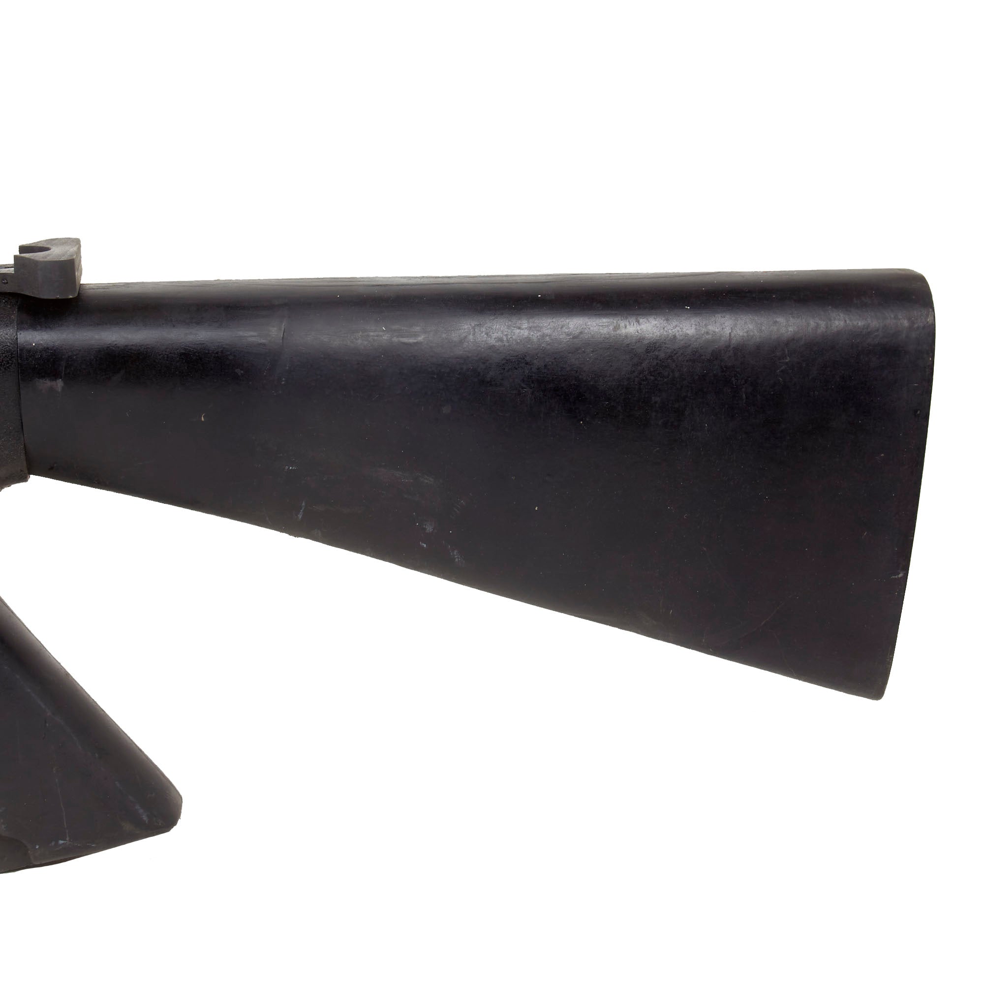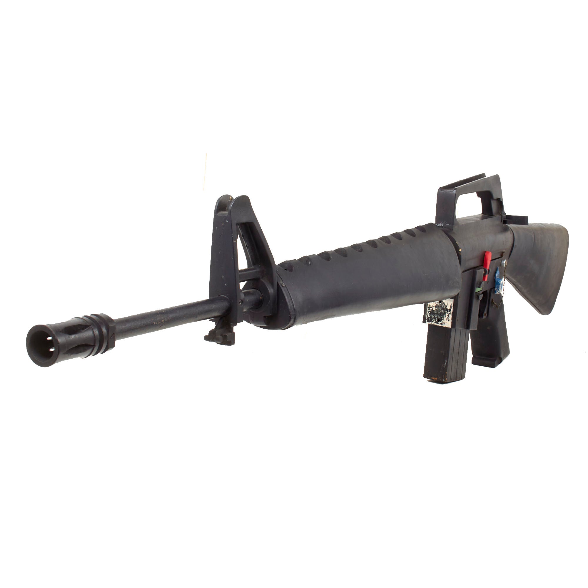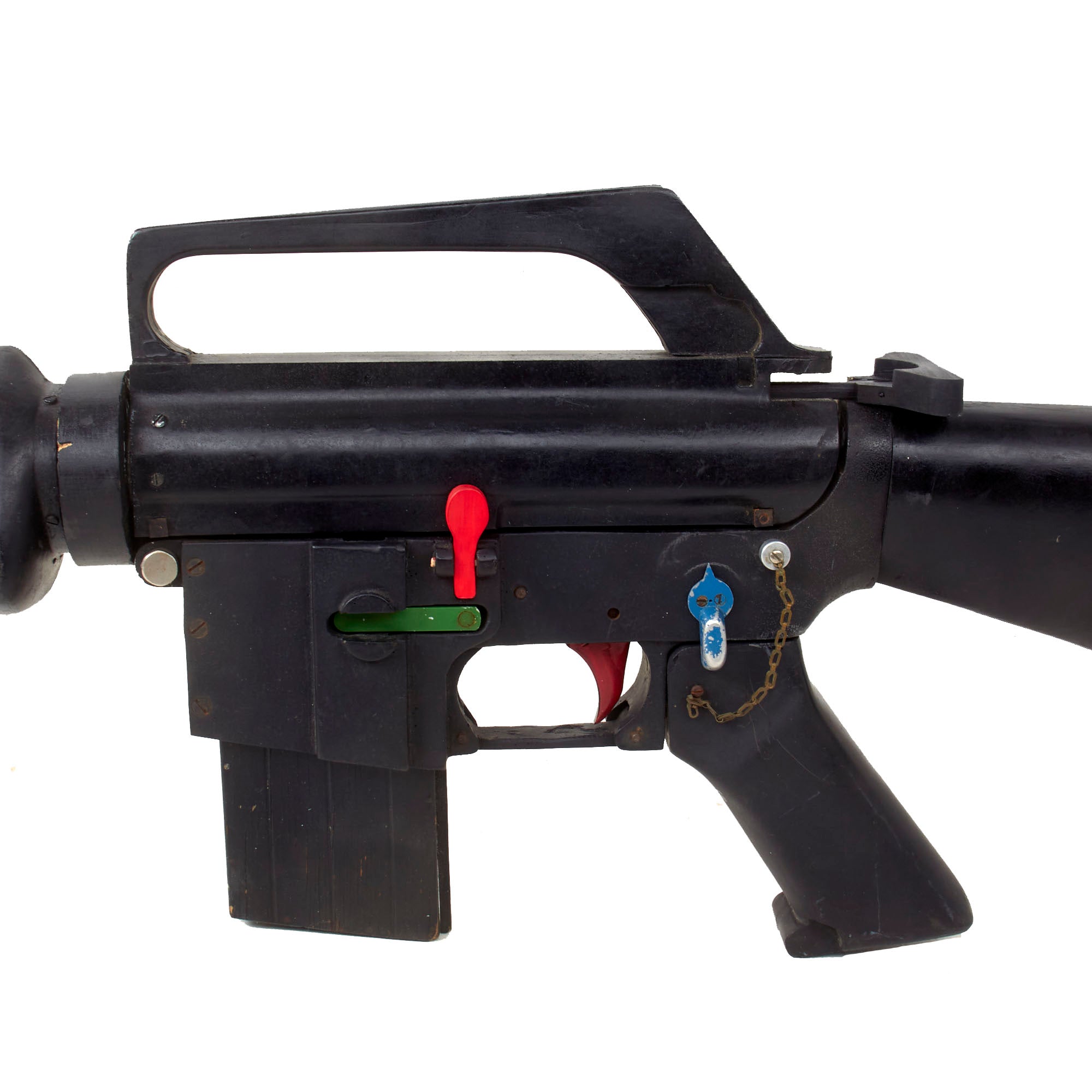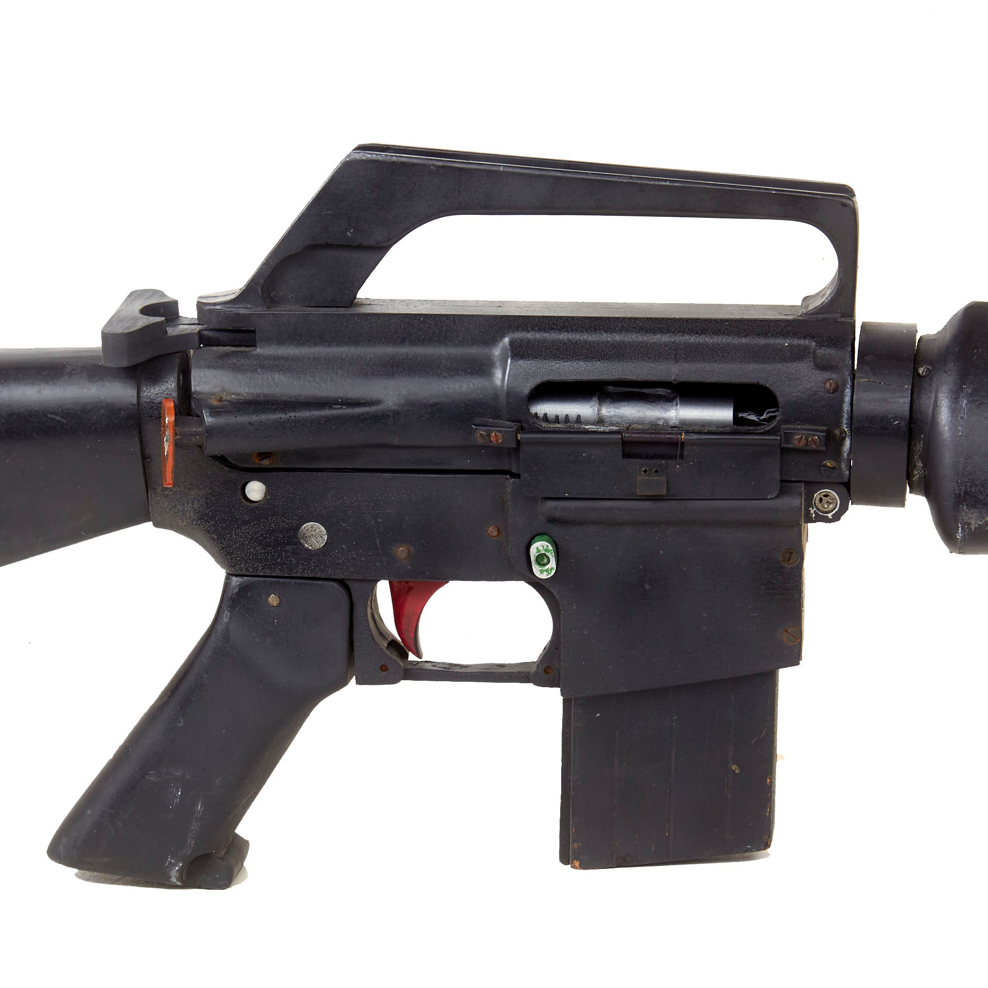 Original Item: Only One Available. This is an inert oversized training rifle and it is impossible to convert it into a live round firing weapon. It is not made using any original parts and is completely inert, made from wood and metal. These are very hard to come by, especially with all the parts still intact. Trainers like these were normally made in house at one of the U.S. Military training aid centers, and were used in classrooms used as a way to familiarize service members with the workings of the M16A1 Rifle, which was in use for decades as a front line weapon, and is still in service in many areas today. Not really intended to stand up to any type of rigorous use, these were usually disposed of once damaged or obsolete, so they are extremely rare. This example came to us with the story that it was purportedly made by Colt for Classroom Training purposes, but it doesn’t look like any of the pieces are marked, so we are not sure how true this is.