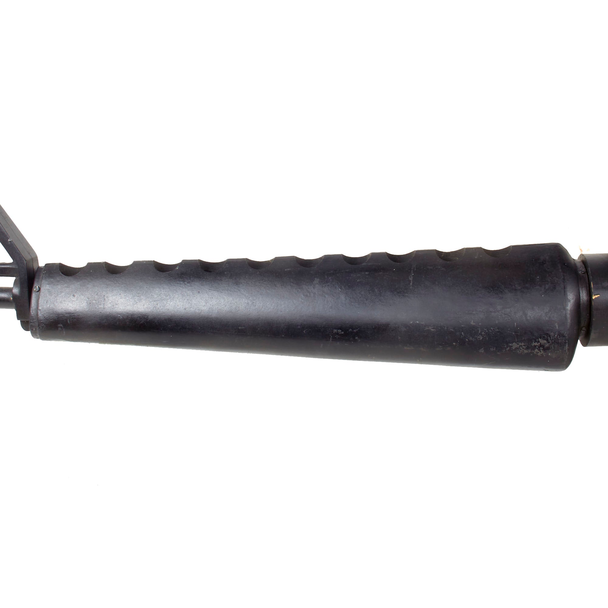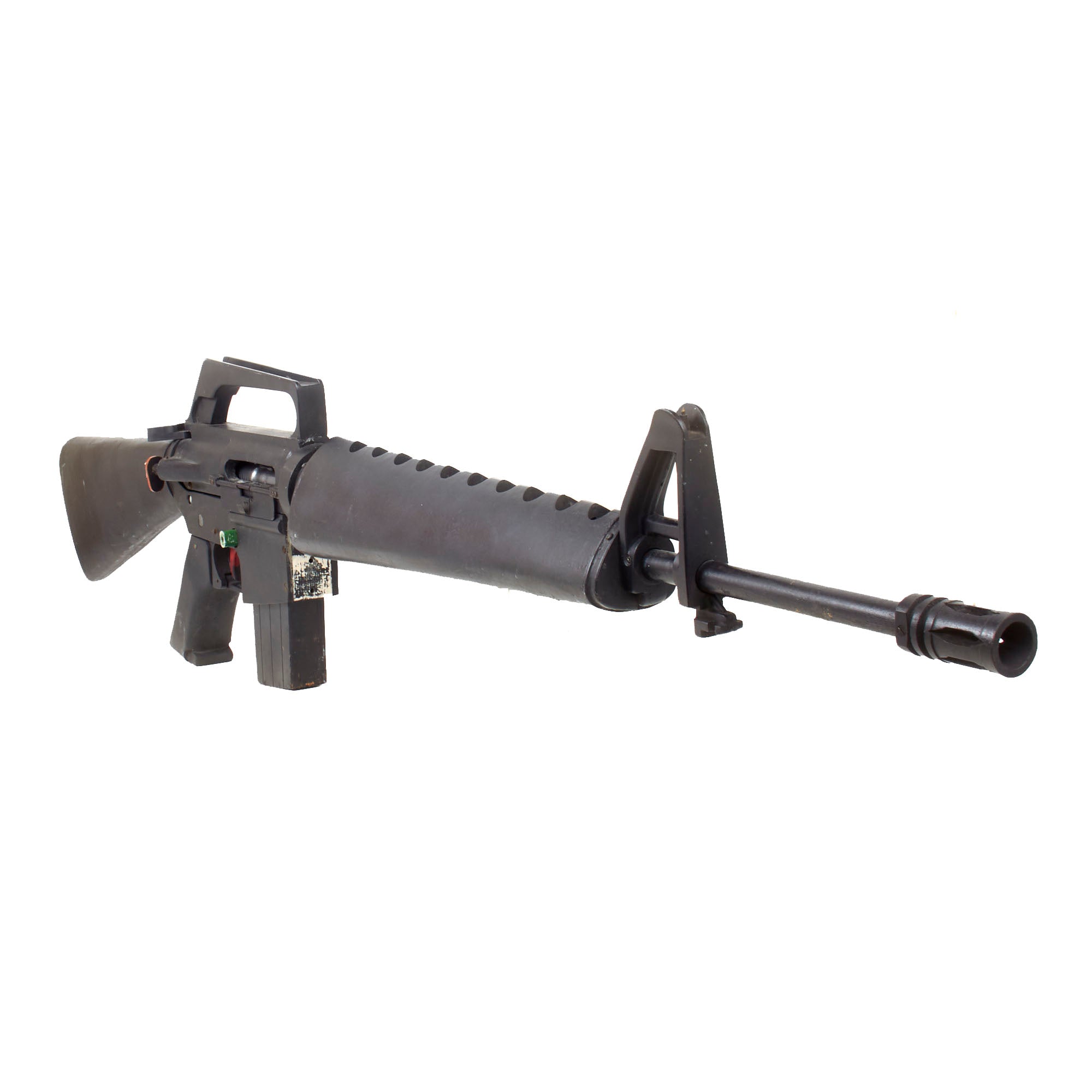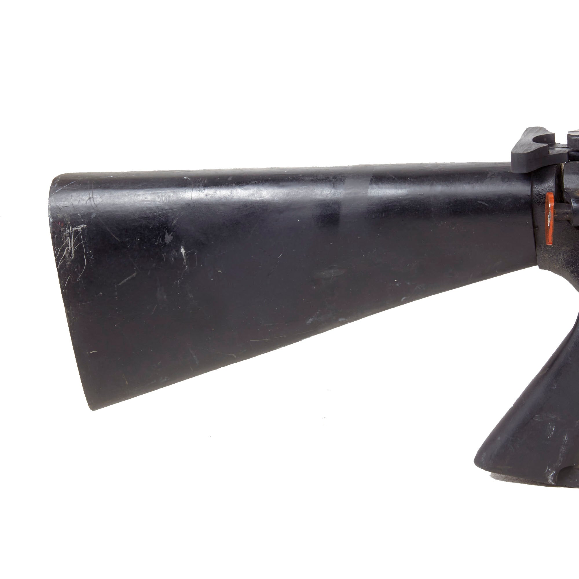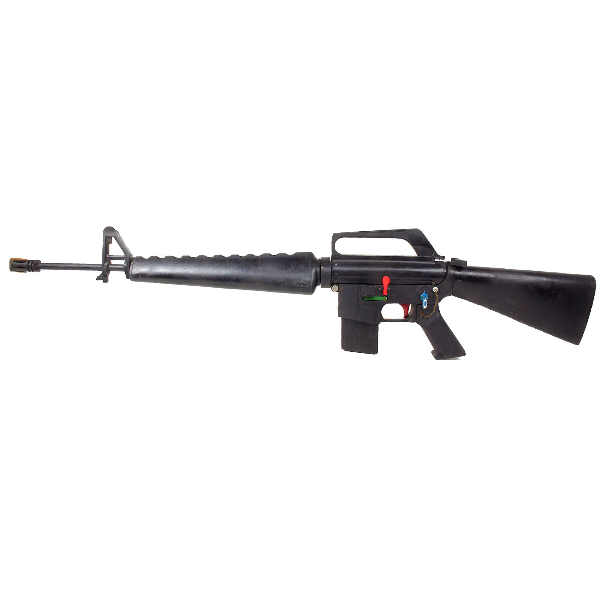 Original Item: Only One Available. This is an inert oversized training rifle and it is impossible to convert it into a live round firing weapon. It is not made using any original parts and is completely inert, made from wood and metal. These are very hard to come by, especially with all the parts still intact. Trainers like these were normally made in house at one of the U.S. Military training aid centers, and were used in classrooms used as a way to familiarize service members with the workings of the M16A1 Rifle, which was in use for decades as a front line weapon, and is still in service in many areas today. Not really intended to stand up to any type of rigorous use, these were usually disposed of once damaged or obsolete, so they are extremely rare. This example came to us with the story that it was purportedly made by Colt for Classroom Training purposes, but it doesn’t look like any of the pieces are marked, so we are not sure how true this is.