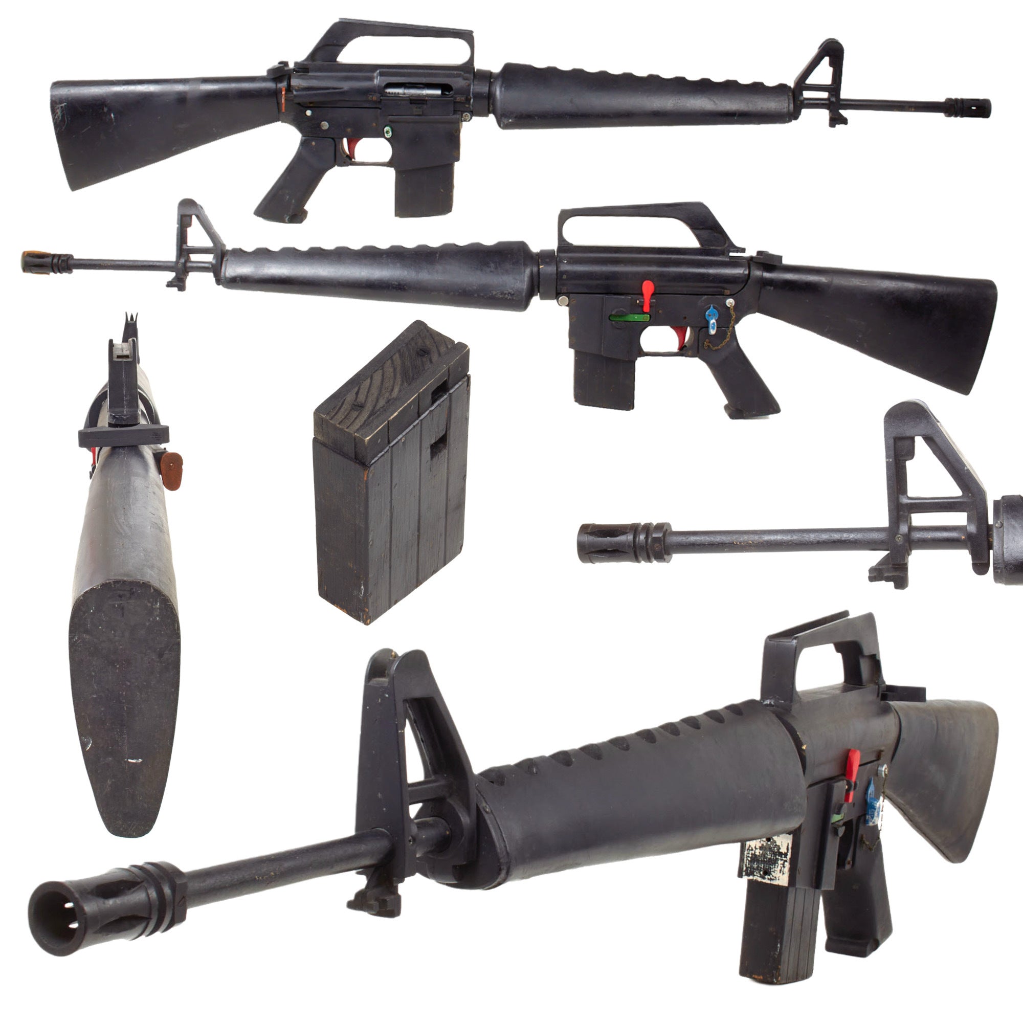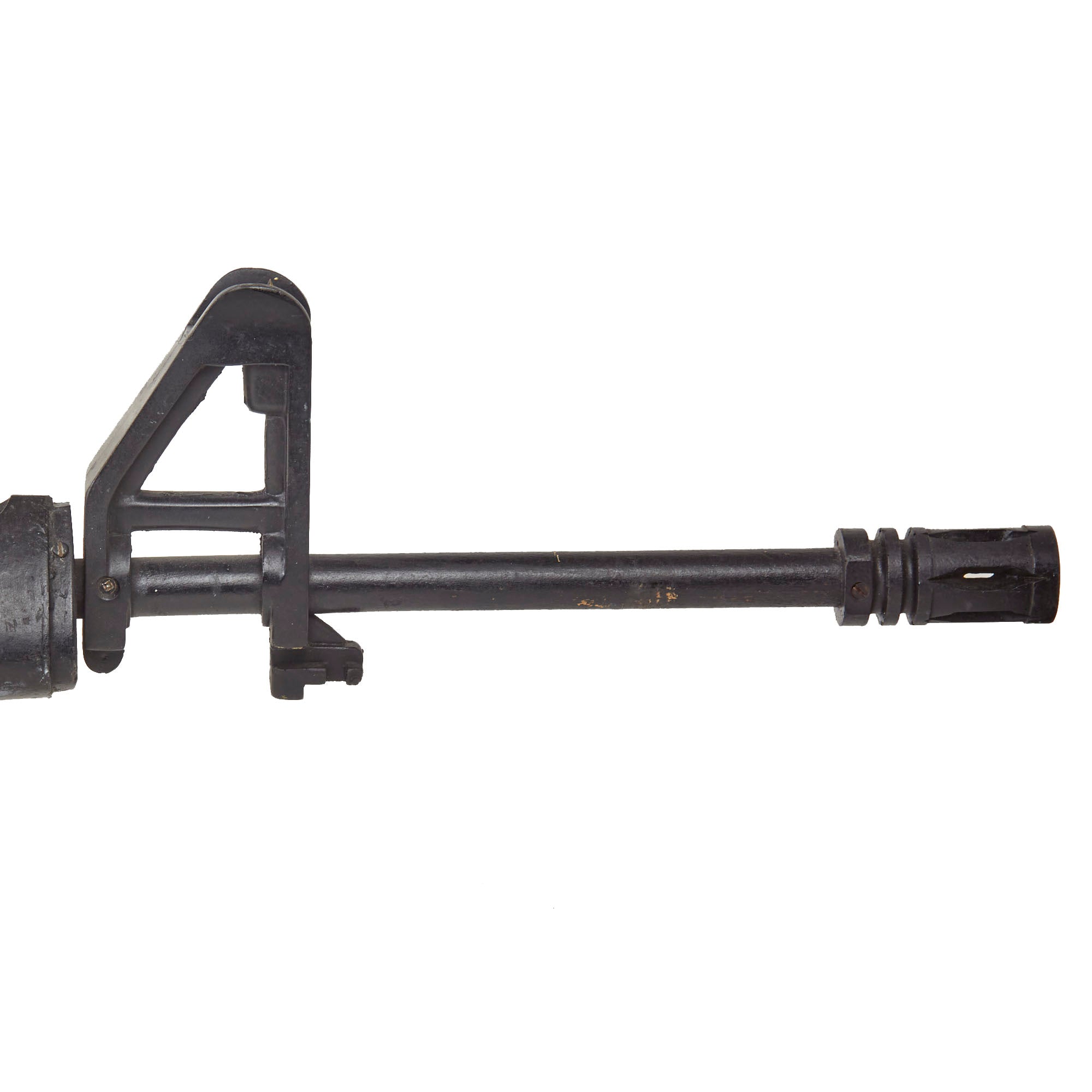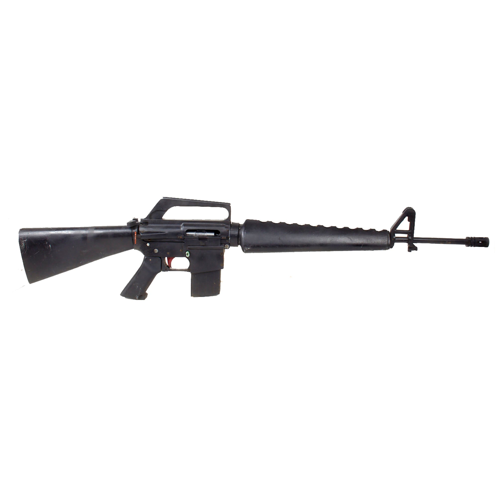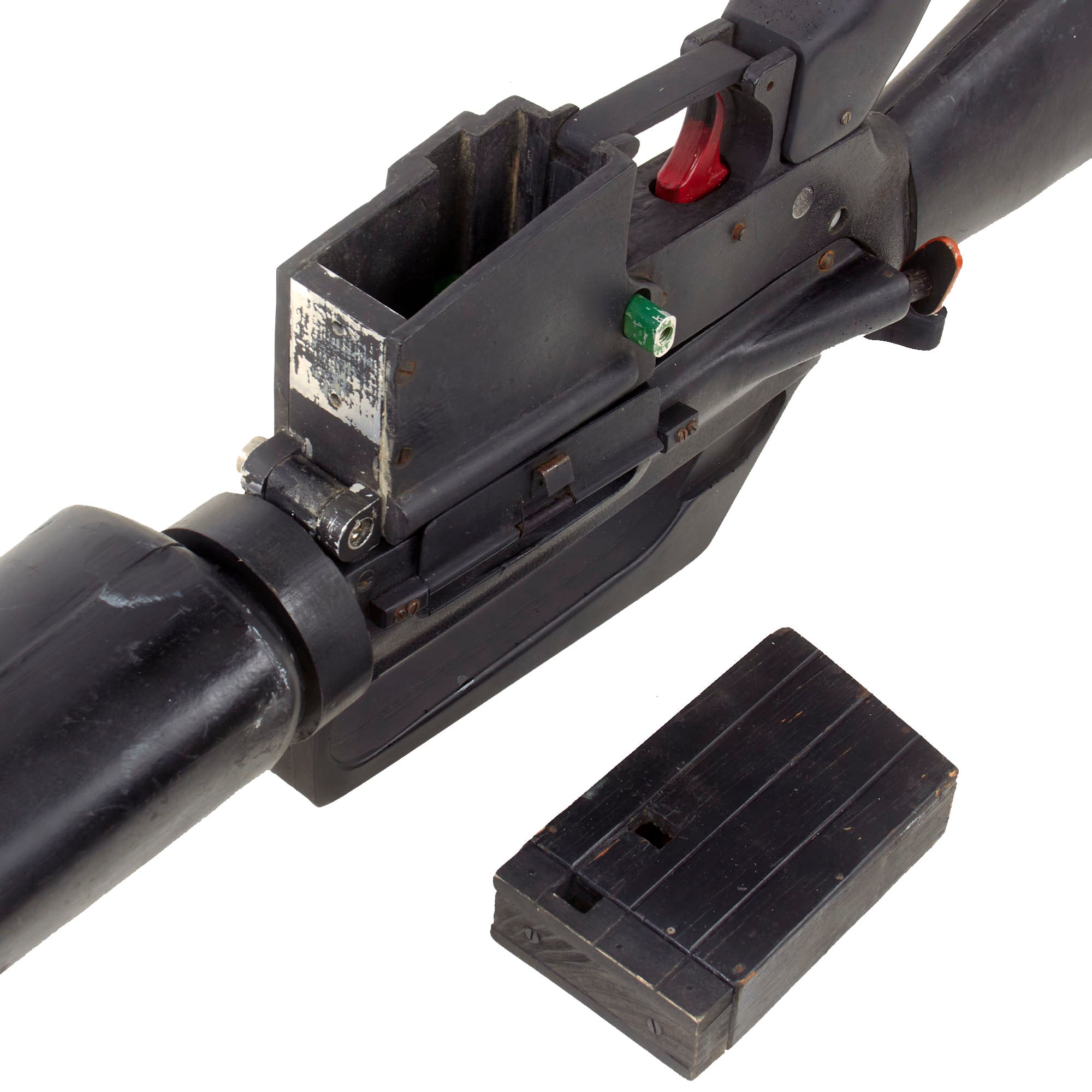Original Item: Only One Available. This is an inert oversized training rifle and it is impossible to convert it into a live round firing weapon. It is not made using any original parts and is completely inert, made from wood and metal. These are very hard to come by, especially with all the parts still intact. Trainers like these were normally made in house at one of the U.S. Military training aid centers, and were used in classrooms used as a way to familiarize service members with the workings of the M16A1 Rifle, which was in use for decades as a front line weapon, and is still in service in many areas today. Not really intended to stand up to any type of rigorous use, these were usually disposed of once damaged or obsolete, so they are extremely rare. This example came to us with the story that it was purportedly made by Colt for Classroom Training purposes, but it doesn’t look like any of the pieces are marked, so we are not sure how true this is.