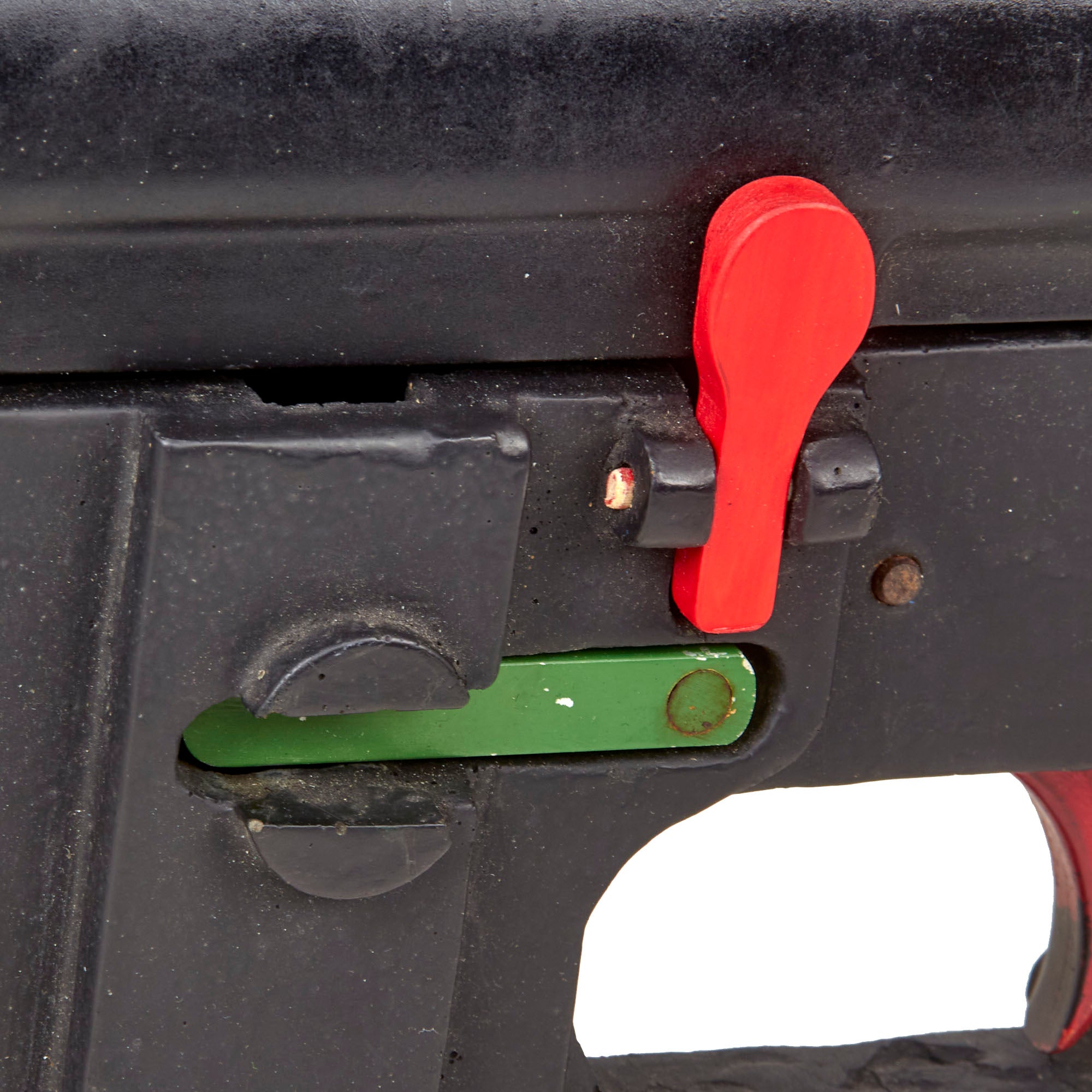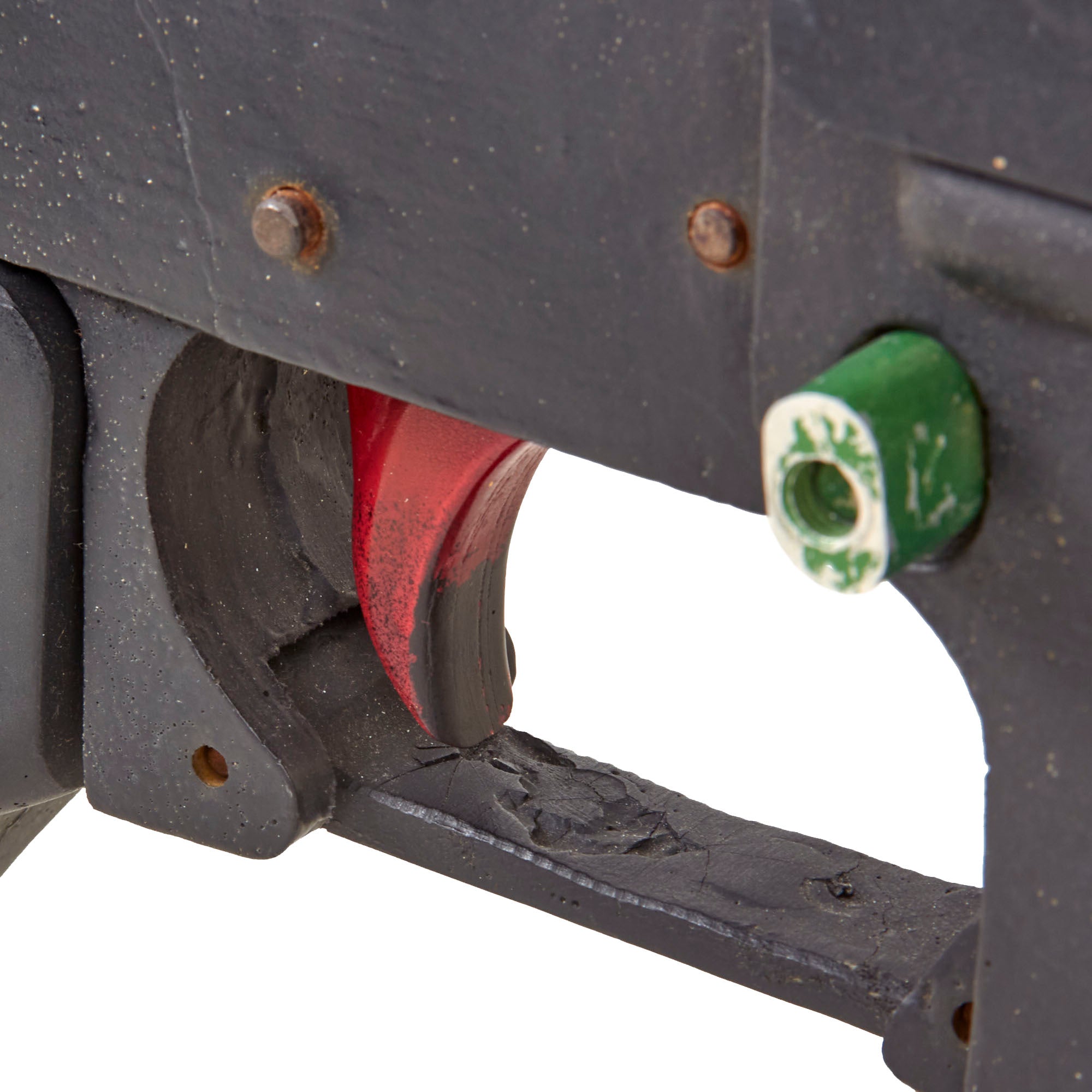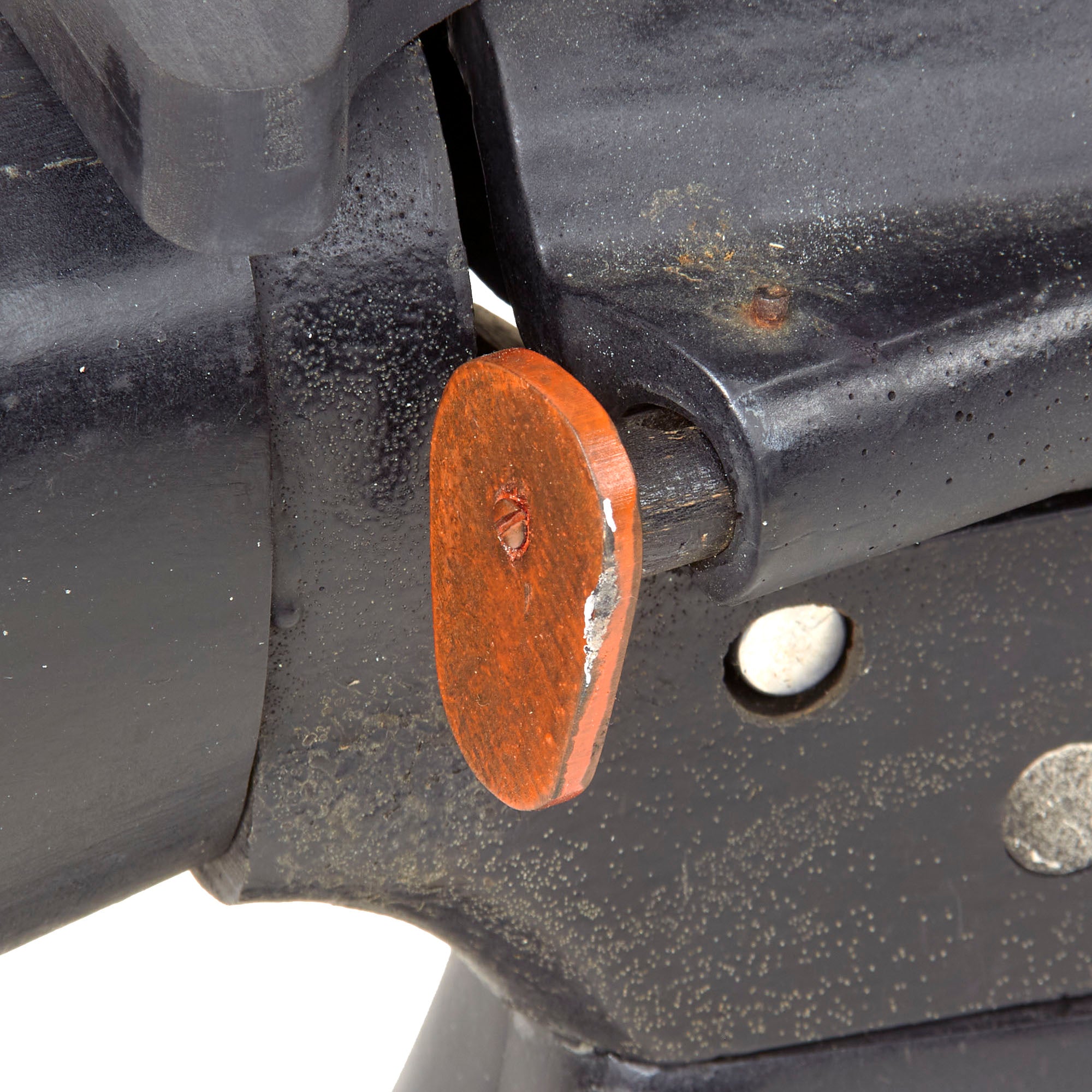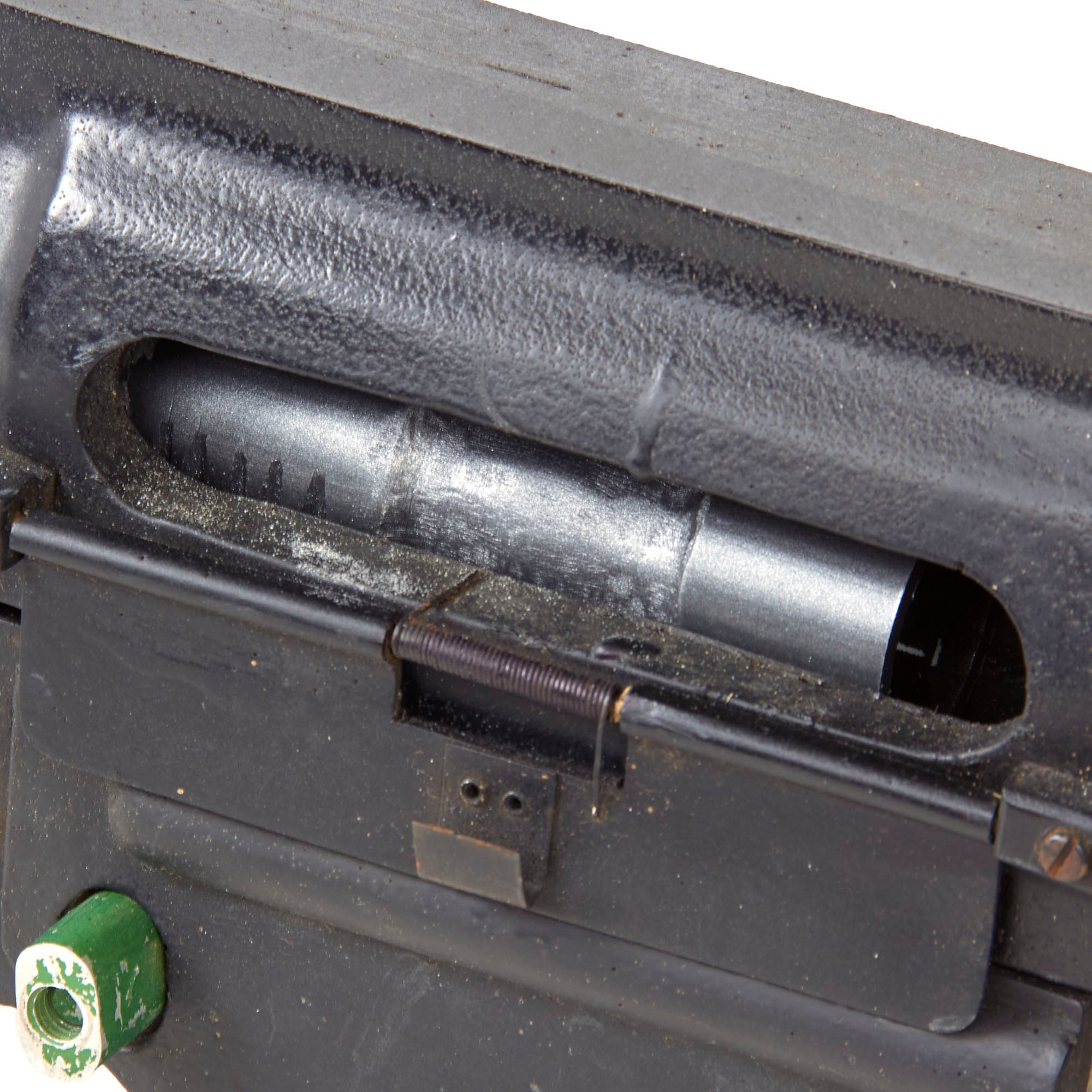 This 2:1 scale example looks to have been made in the late 1960s or 1970s and is based on the M16A1 variant introduced in 1967, based on the handgrip style. This example has several functioning parts, and was made to familiarize soldiers with the buttons are other movable pieces. The safety, bolt, magazine, select fire, trigger, etc. are all present and move. The magazine is a dummy and has no rounds, nor can the trainer chamber a round. The magazine release is present, and is meant to train soldiers on reloading the gun, not chambering a round and firing.