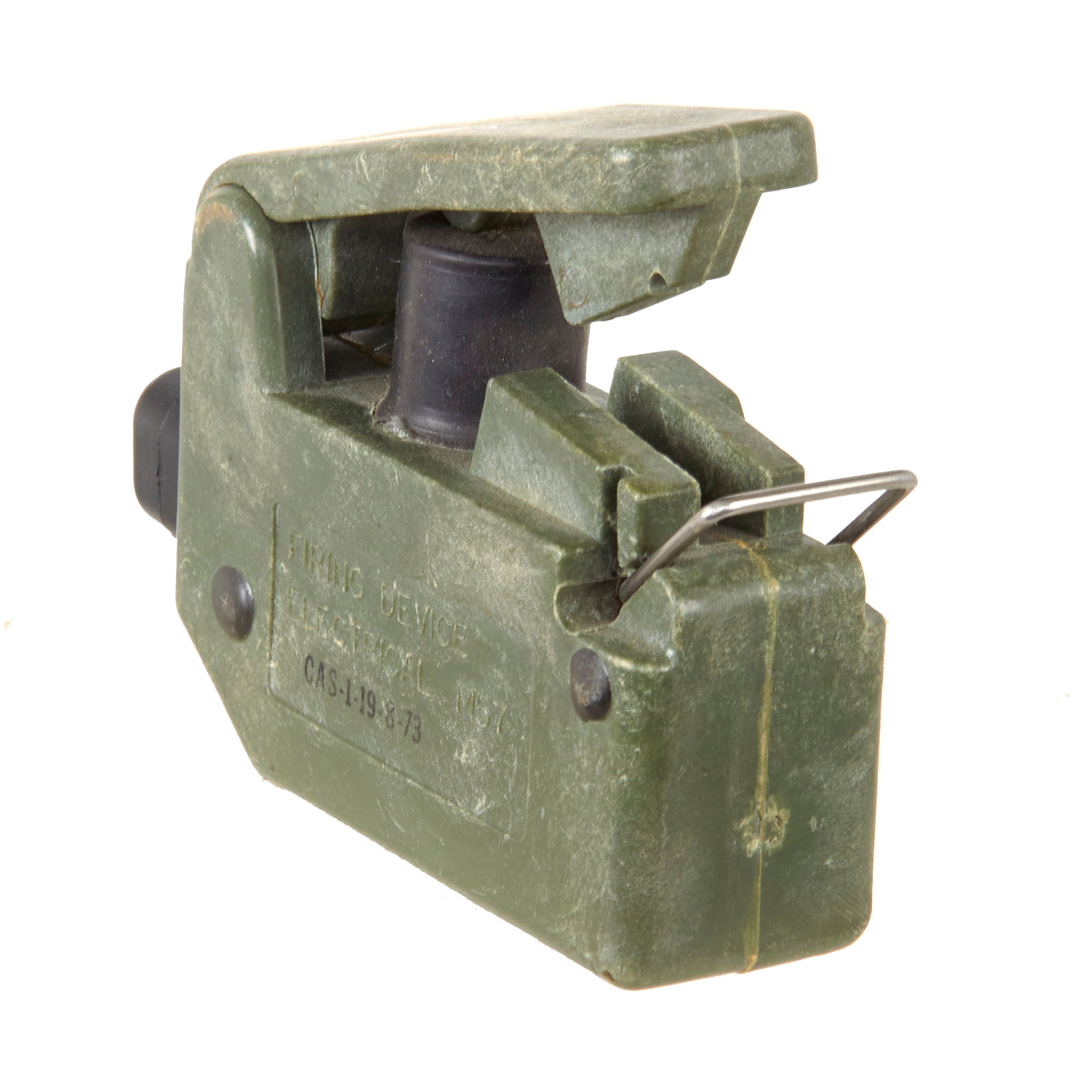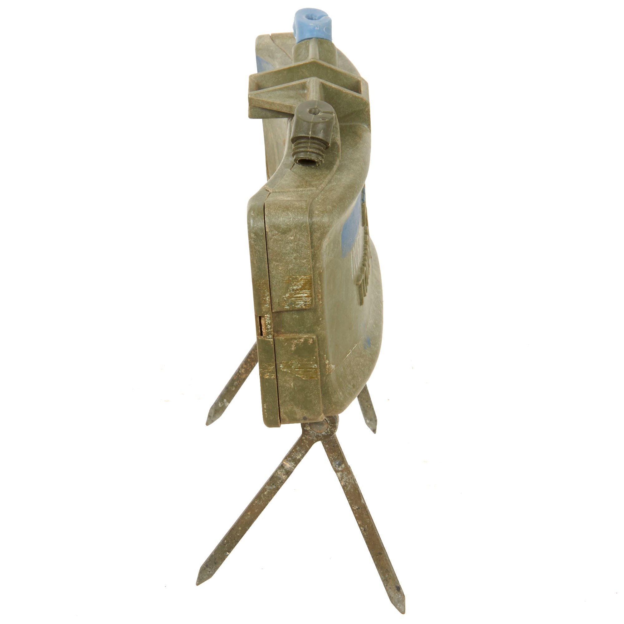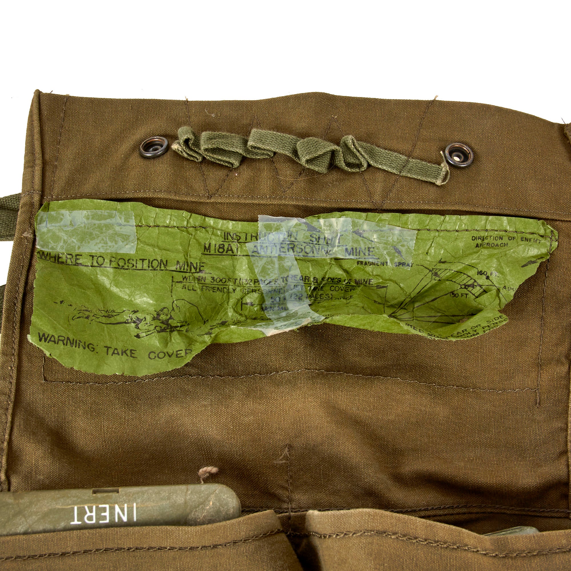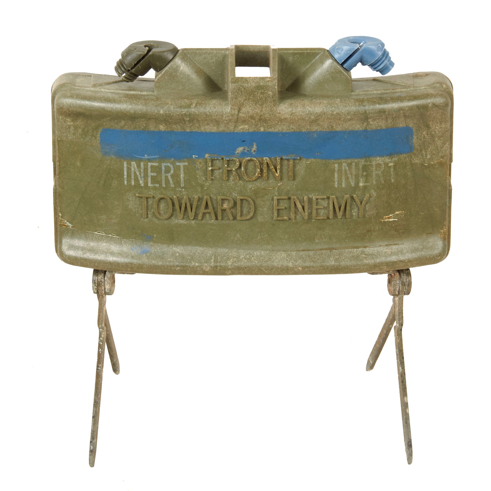 Original Items: One Set Only. The M68 kit was designed to familiarize personnel with the placement and arming of a real M18 Claymore directional mine. It comes with all the components of a real Claymore kit packed in an M7 bandoleer. The plastic M33 Inert AP Mine is the inert training and practice version of the M18 Claymore. Some inert mines were green with a light blue band, while others were completely blue. This set is a green example with blue paint. It does not contain an explosive or pyrotechnic filler of any kind. It is packed in a Claymore bag with inert M10 simulated detonator cap wire with connectors, a FIRING DEVICE ELECTRICAL M57 "clacker" firing control, and a TEST SET ELECTRICAL M40 circuit testing kit.