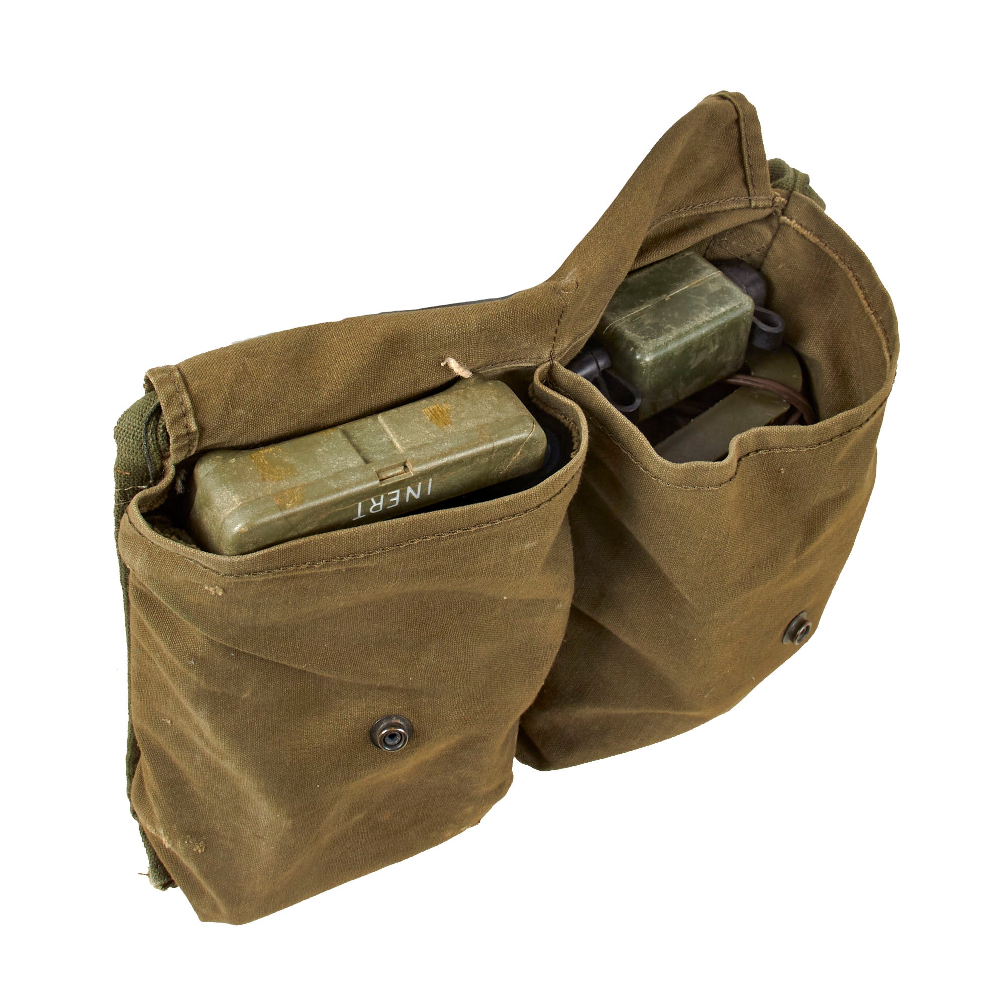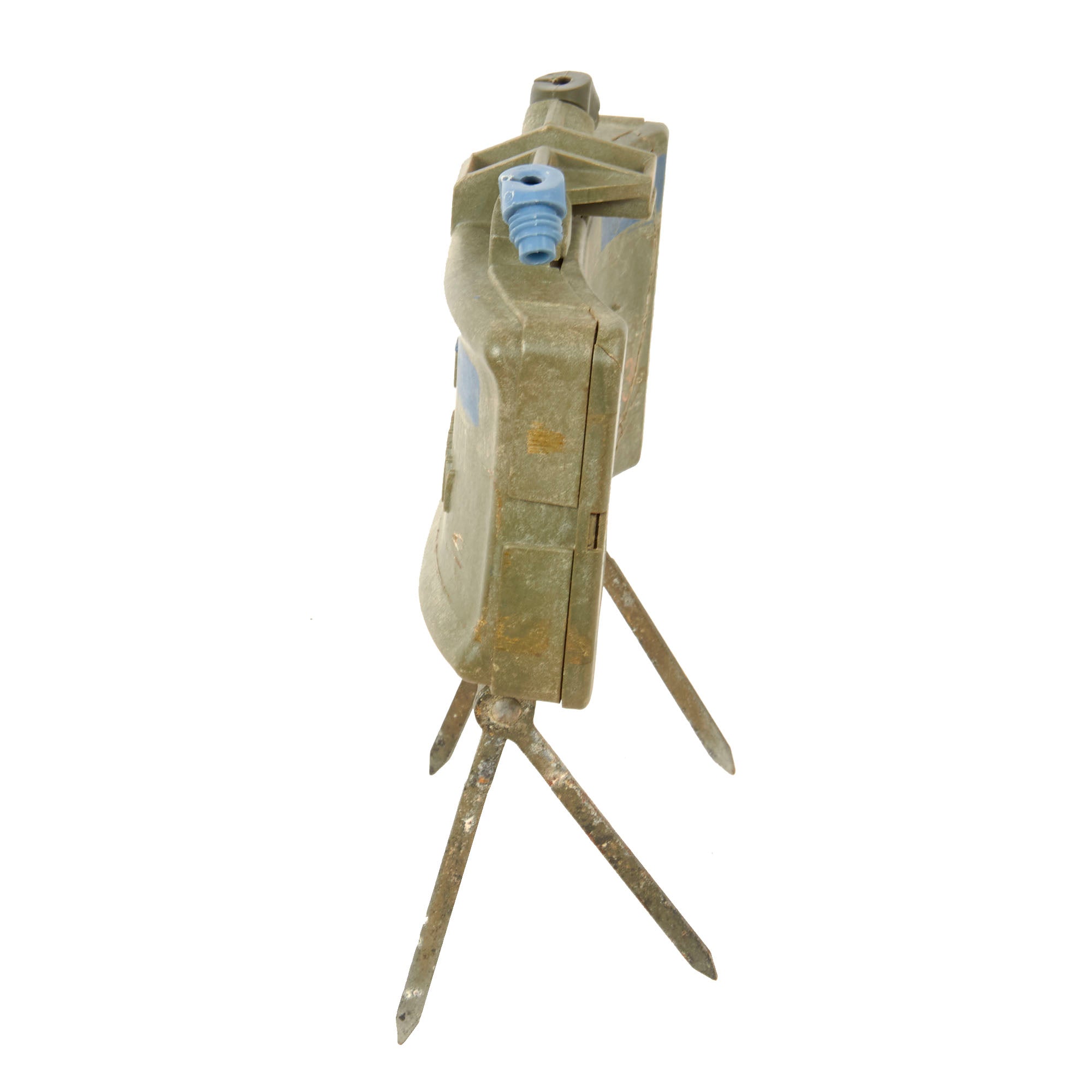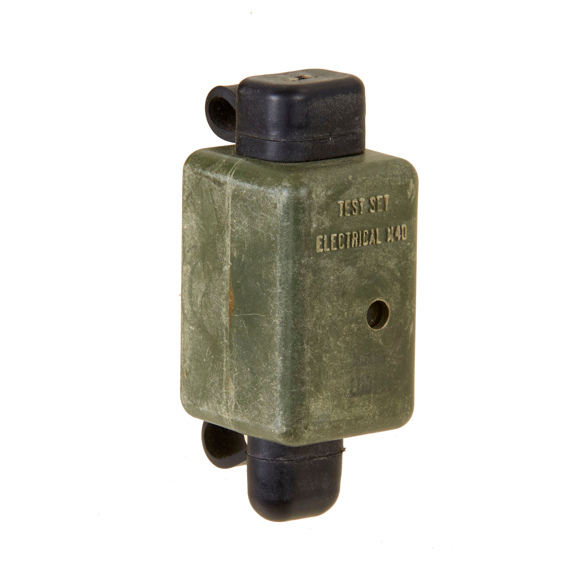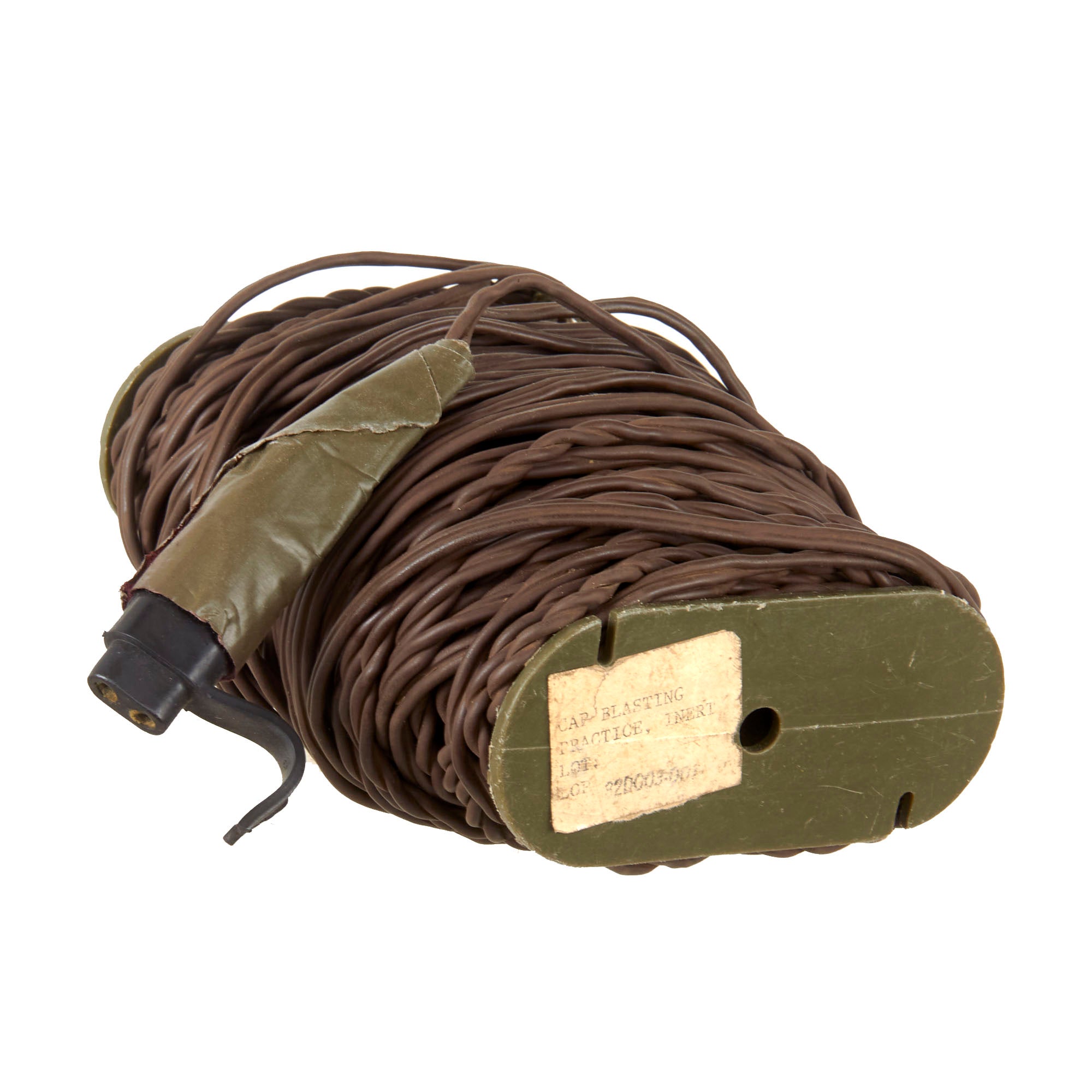 Original Items: One Set Only. The M68 kit was designed to familiarize personnel with the placement and arming of a real M18 Claymore directional mine. It comes with all the components of a real Claymore kit packed in an M7 bandoleer. The plastic M33 Inert AP Mine is the inert training and practice version of the M18 Claymore. Some inert mines were green with a light blue band, while others were completely blue. This set is a green example with blue paint. It does not contain an explosive or pyrotechnic filler of any kind. It is packed in a Claymore bag with inert M10 simulated detonator cap wire with connectors, a FIRING DEVICE ELECTRICAL M57 "clacker" firing control, and a TEST SET ELECTRICAL M40 circuit testing kit.