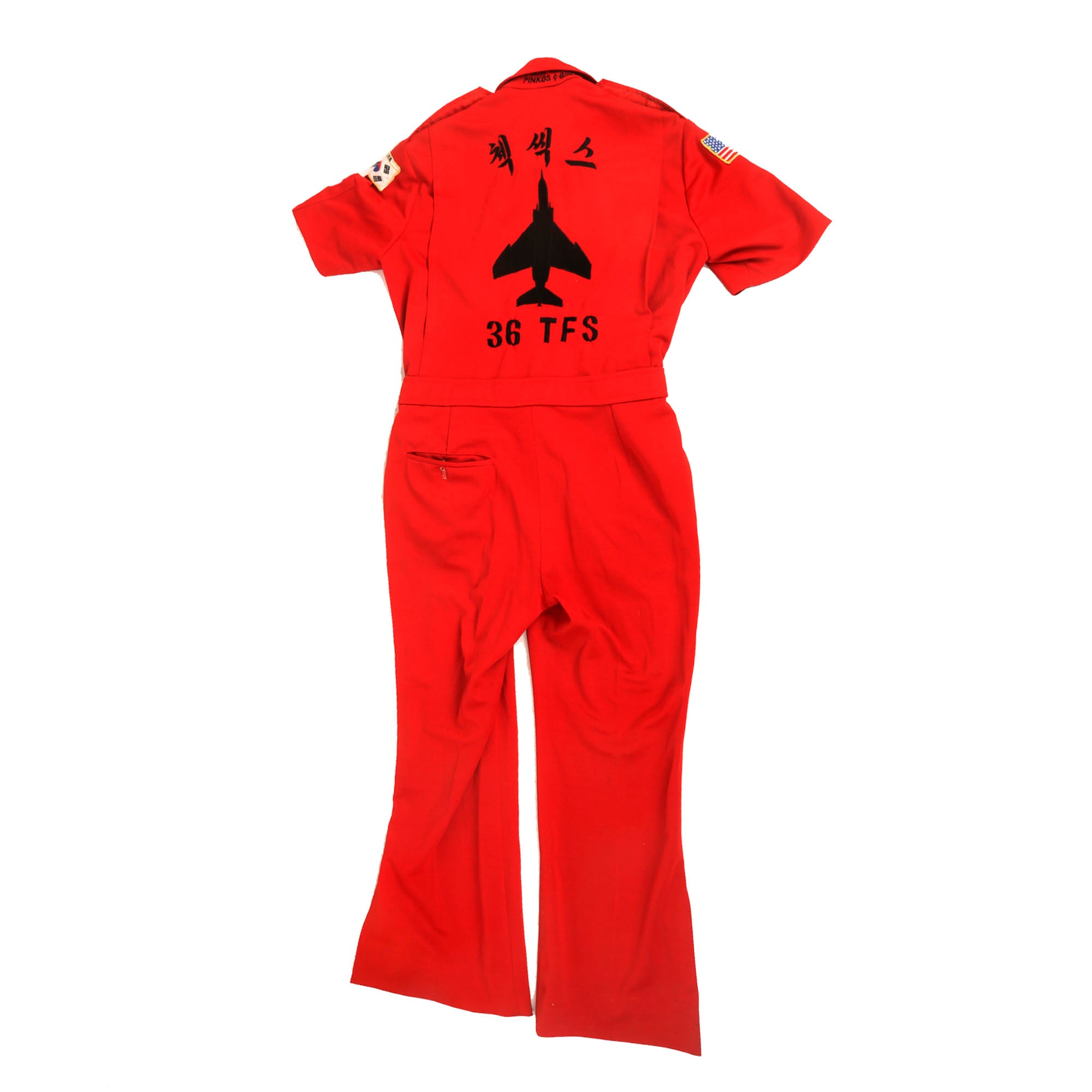 On the back of the party suit, a giant F4 fighter jet patch has been applied with likely Korean character above and 36 TFS below. This is a fantastic party suit, one of if not the best we have ever offered! Comes ready for further research and display!